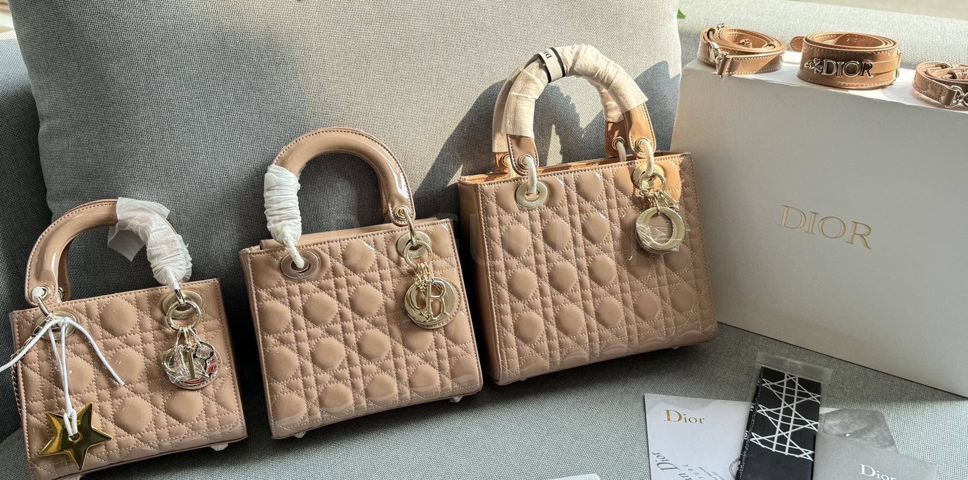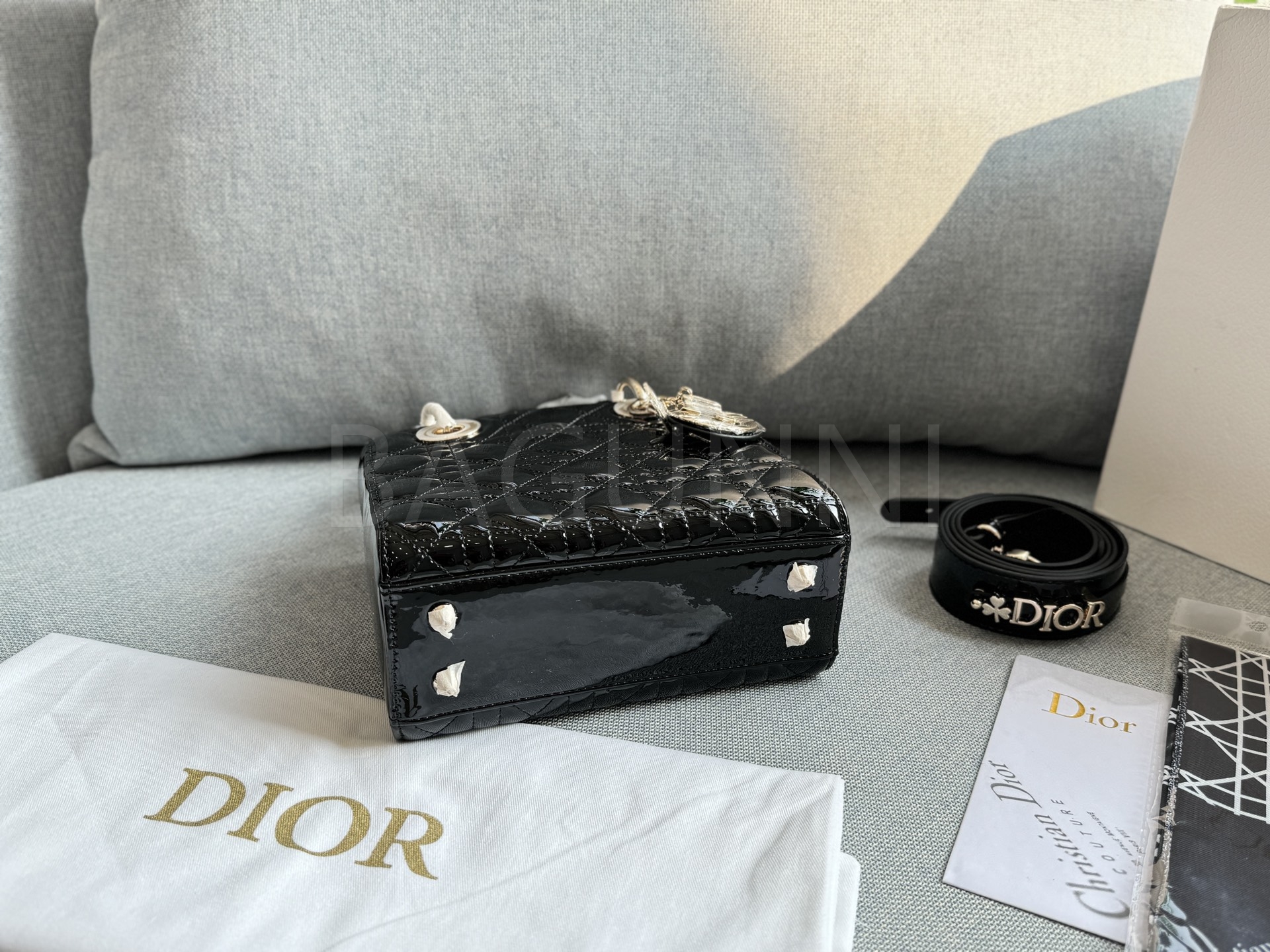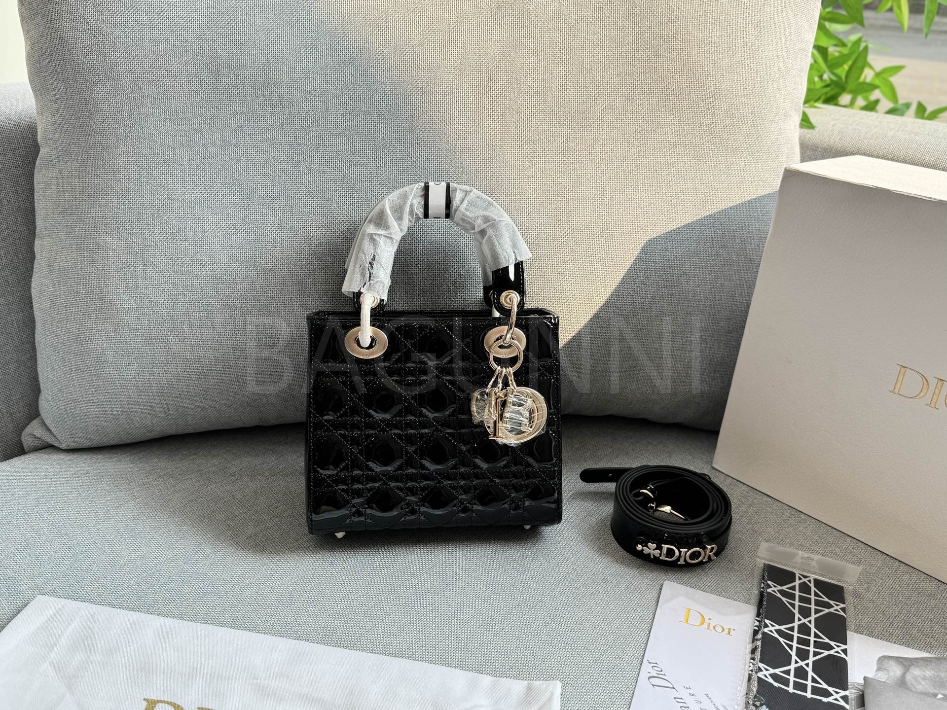 디올 레이디 디올 토트백입니다. 페이턴트 가죽 특유의 질감이 자연스럽게 살아 있으며 골드 톤이 어우러져 브랜드 특유의 분위기를 편하게 즐기기 좋습니다.