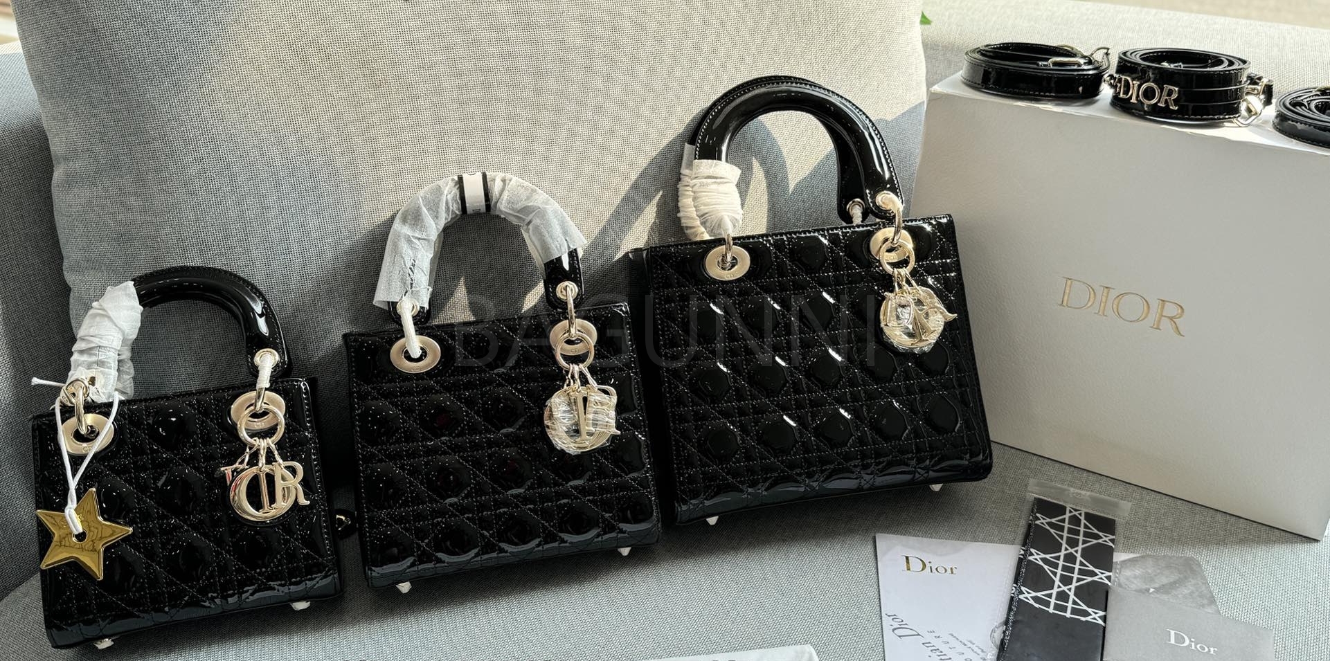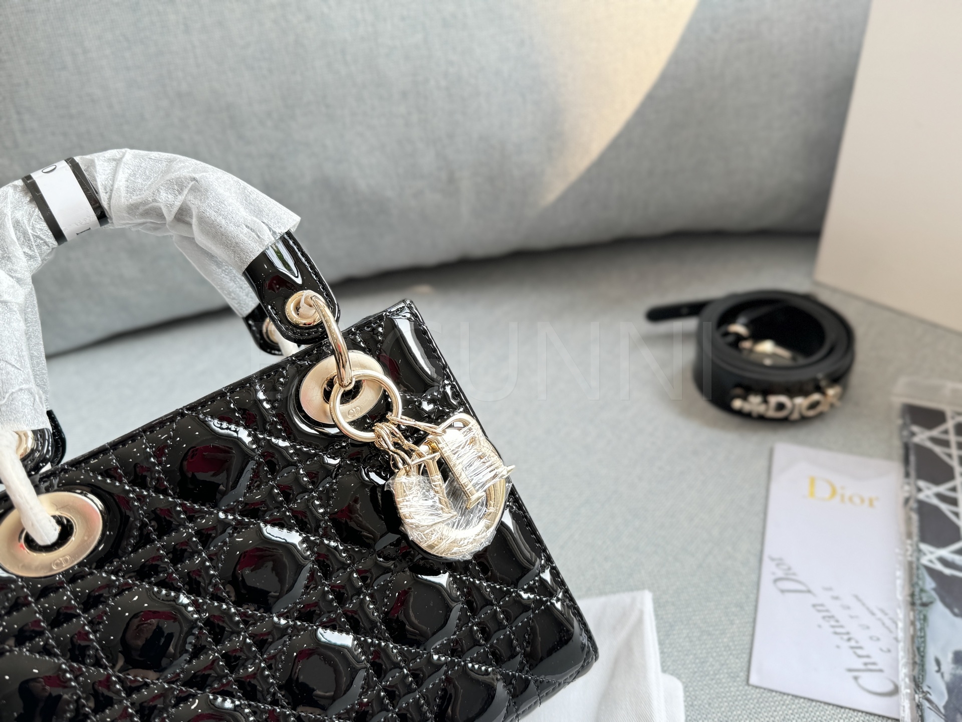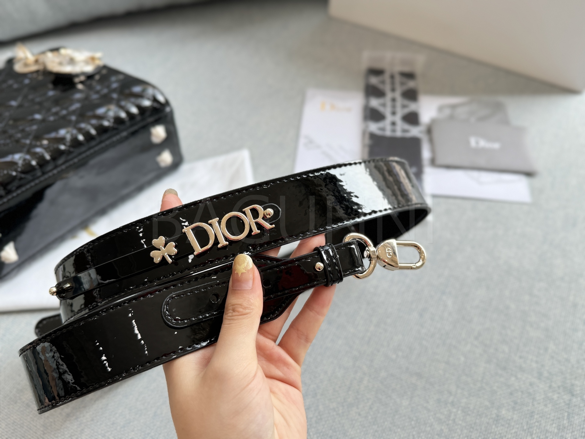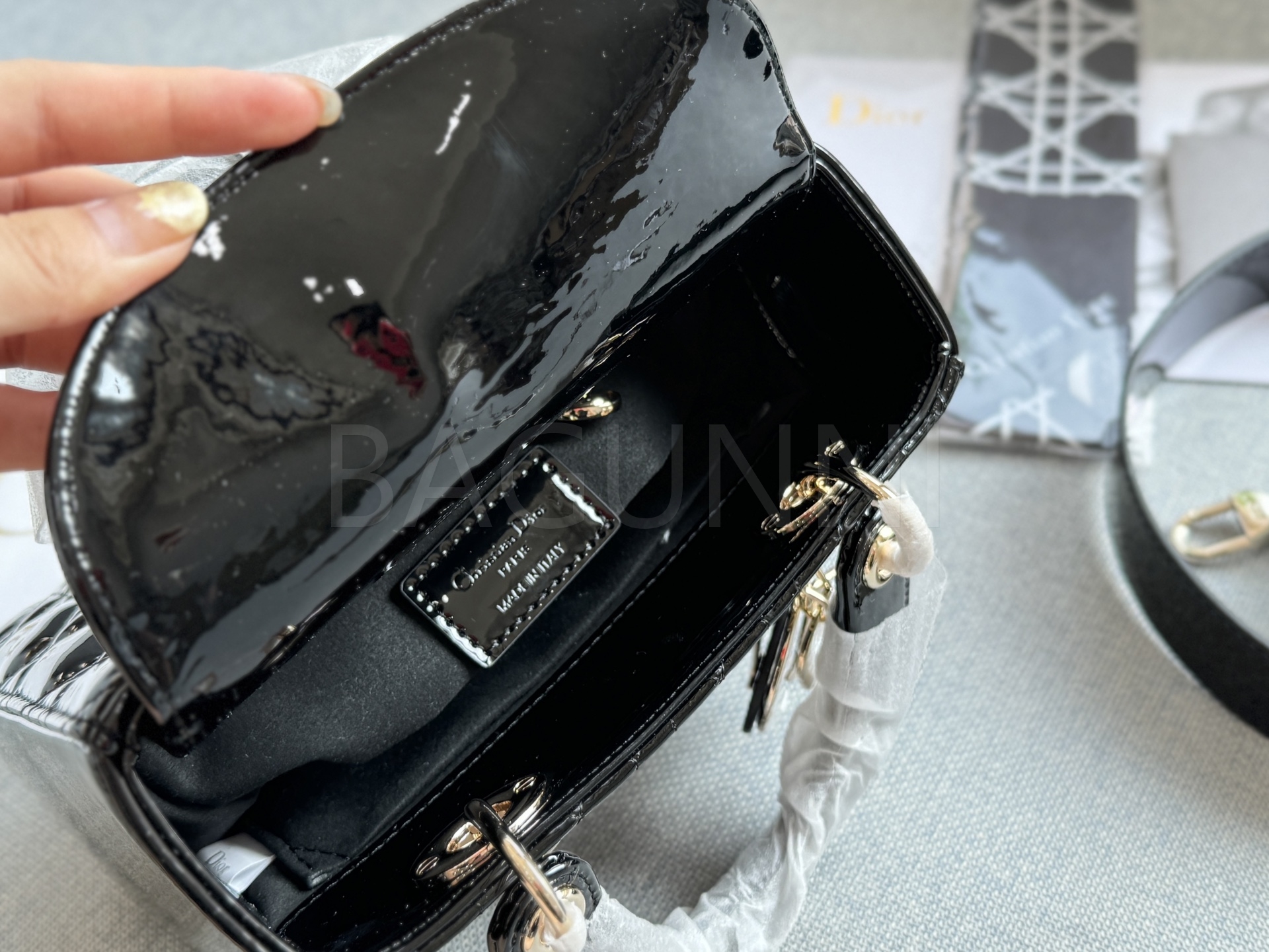 디올 레이디 디올 토트백입니다. 페이턴트 가죽 특유의 질감이 자연스럽게 살아 있으며 골드 톤이 어우러져 브랜드 특유의 분위기를 편하게 즐기기 좋습니다.