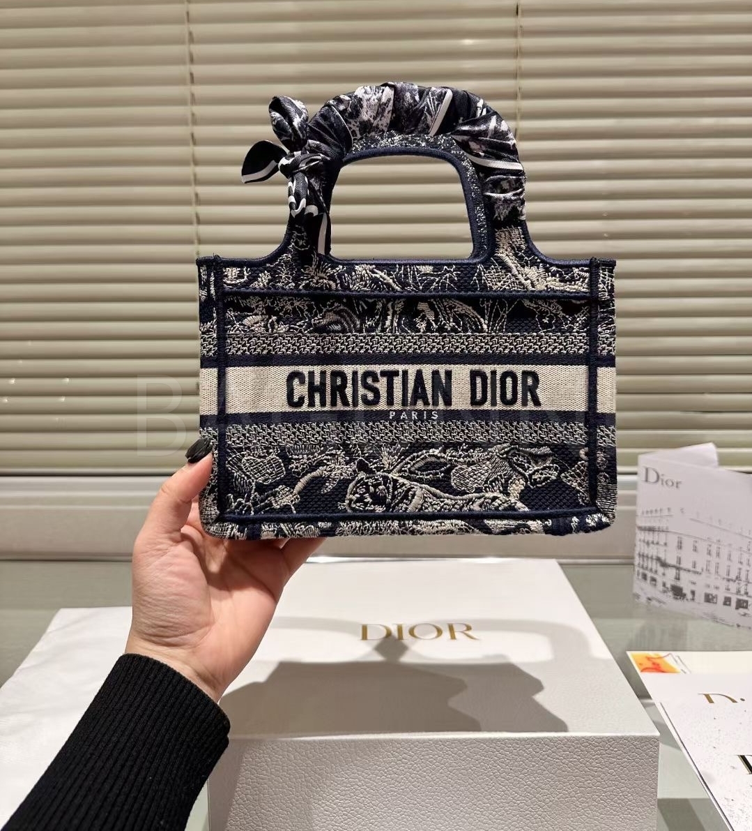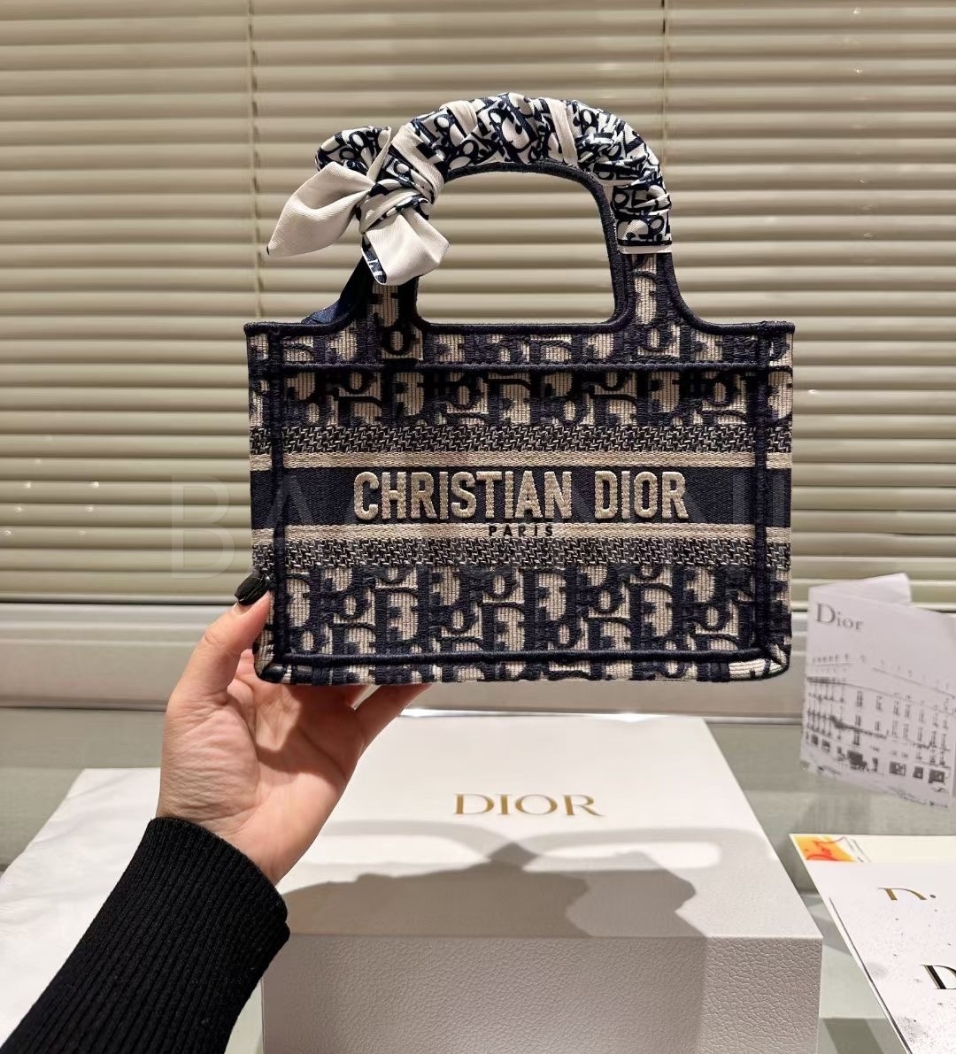 디올 북 토트입니다. 베이지, 블루 톤이 어우러져 브랜드 특유의 분위기를 편하게 즐기기 좋습니다.