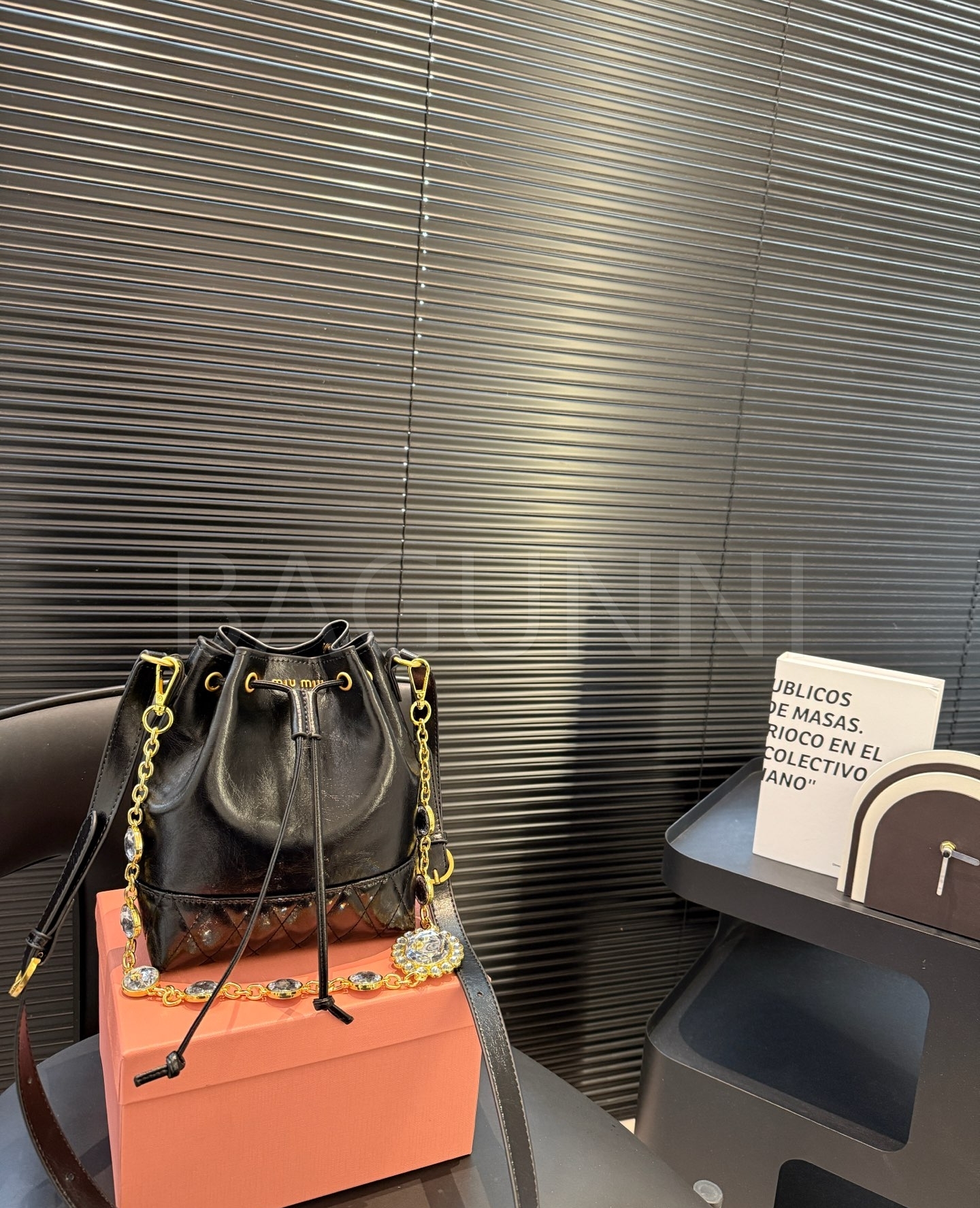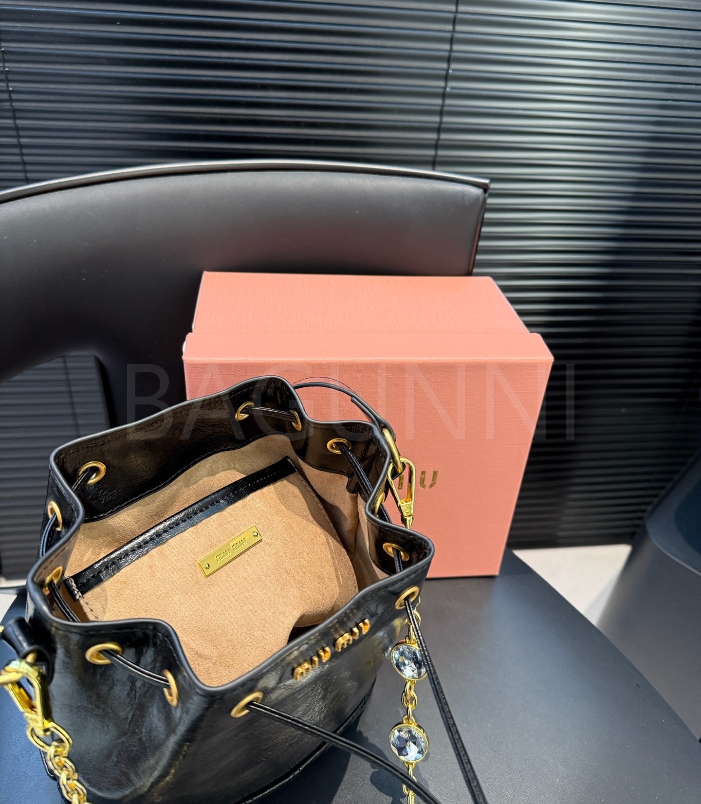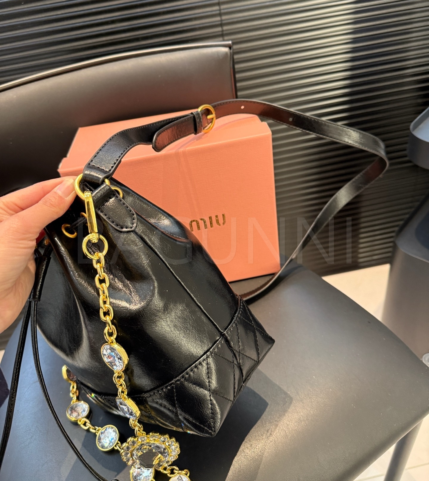 미우미우 체인 버킷백입니다. 브랜드 특유의 분위기를 편하게 즐기기 좋습니다.
