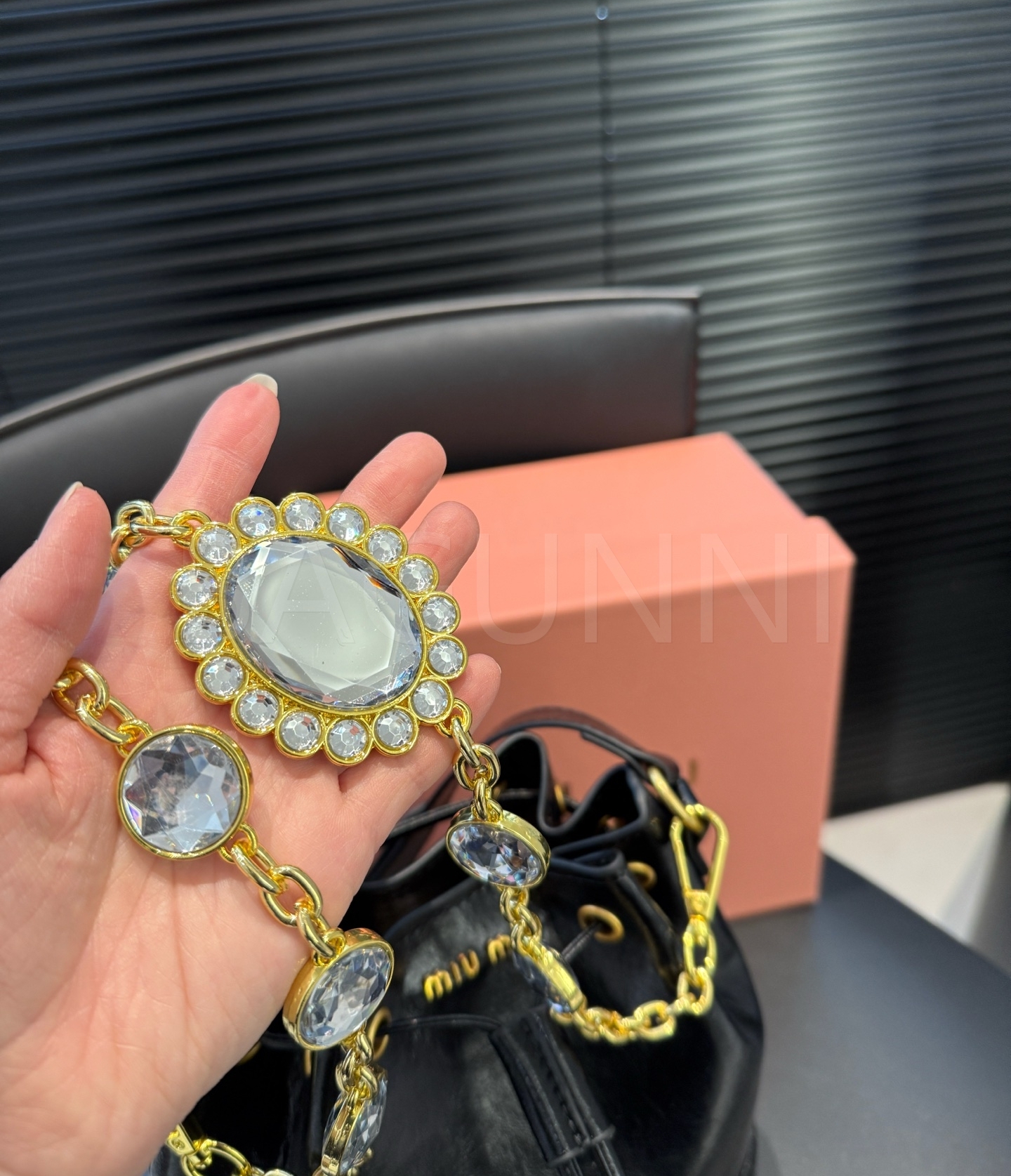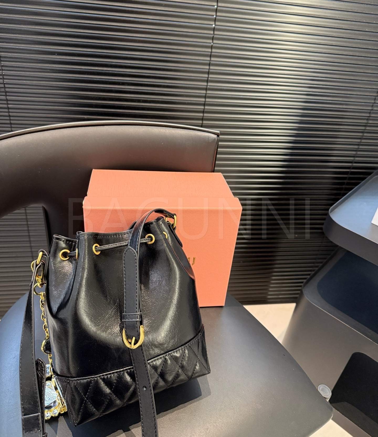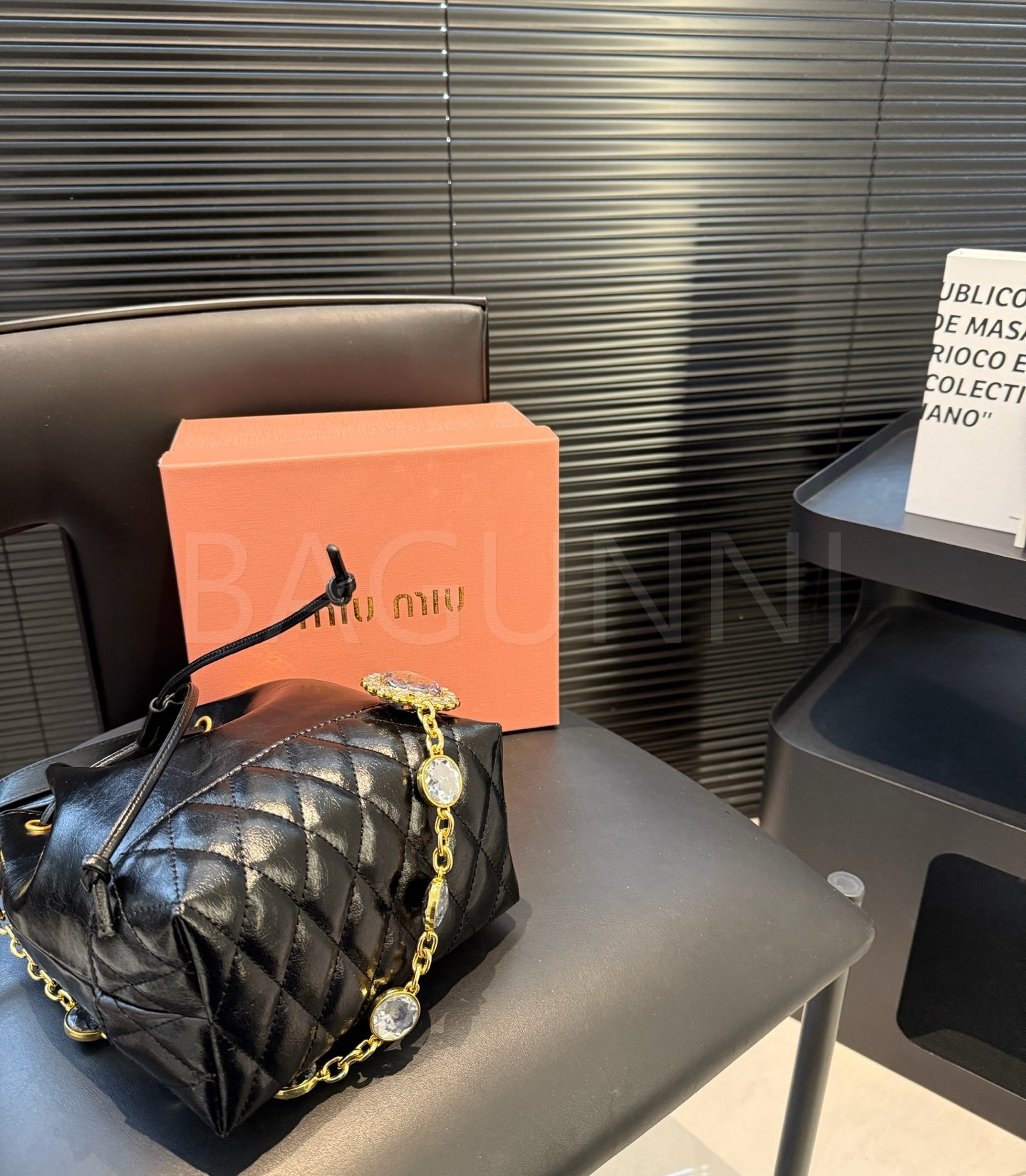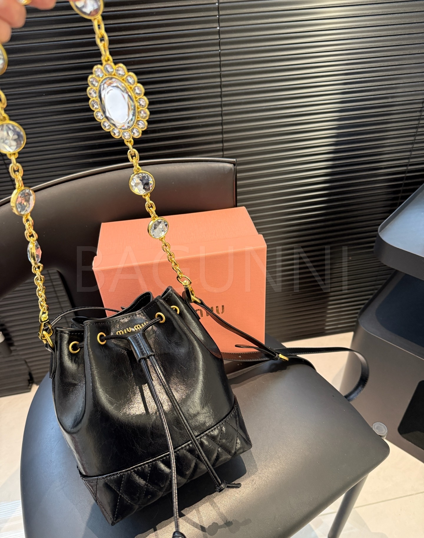 미우미우 체인 버킷백입니다. 브랜드 특유의 분위기를 편하게 즐기기 좋습니다.