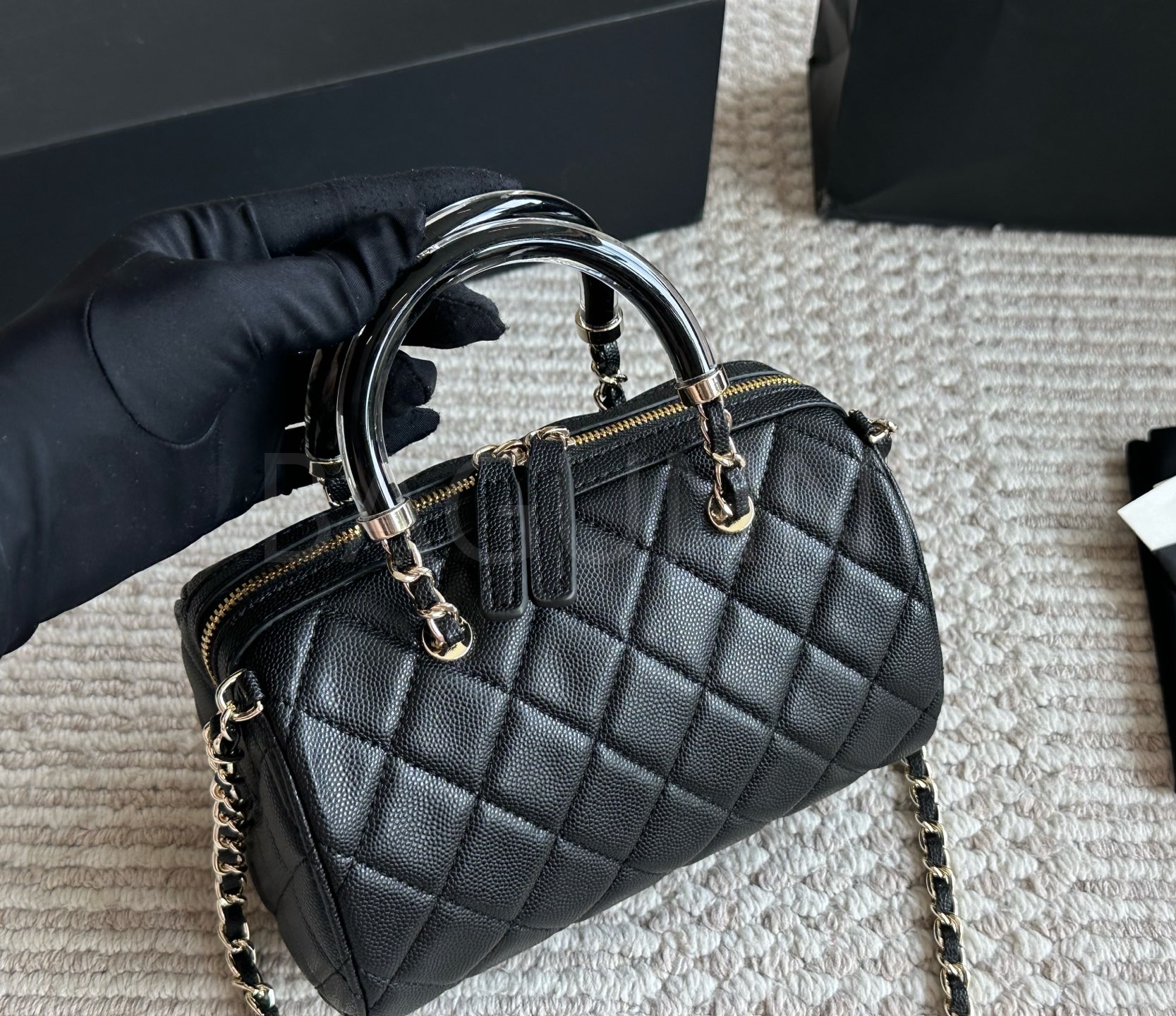 세련된 무드가 돋보이는 샤넬 볼링 백입니다.