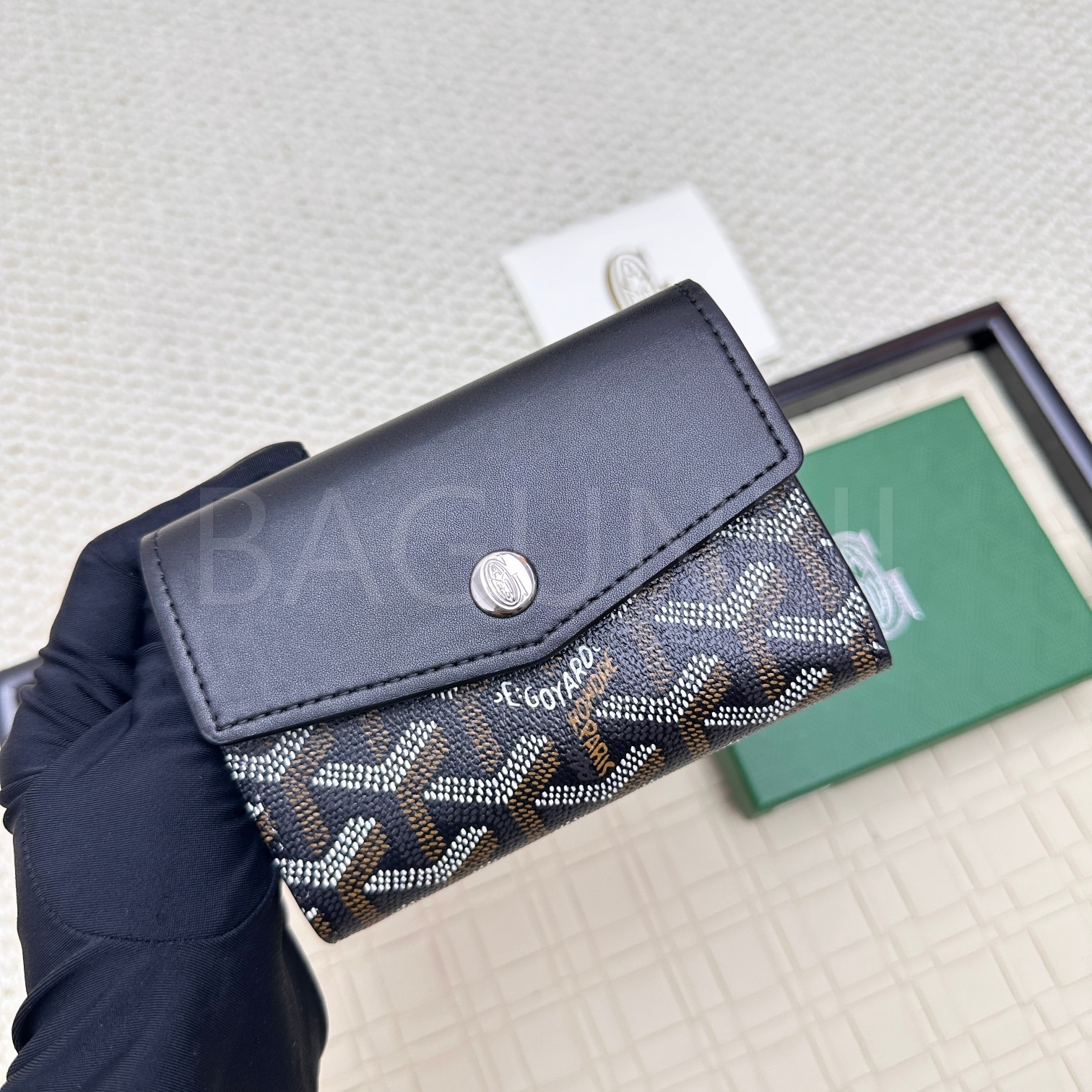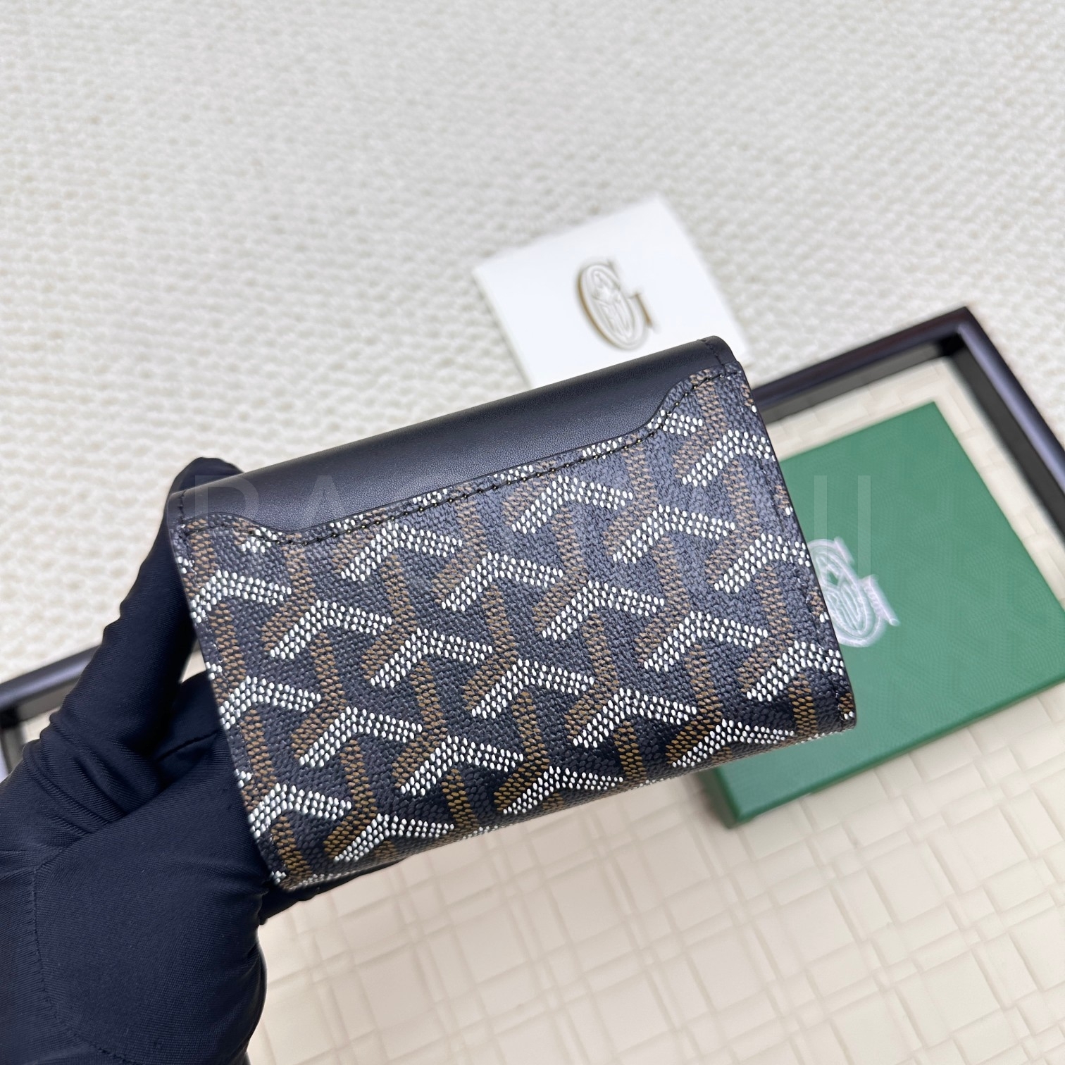 고야드 트리폴드 카드지갑 특유의 분위기가 자연스럽게 드러나는 디자인입니다.