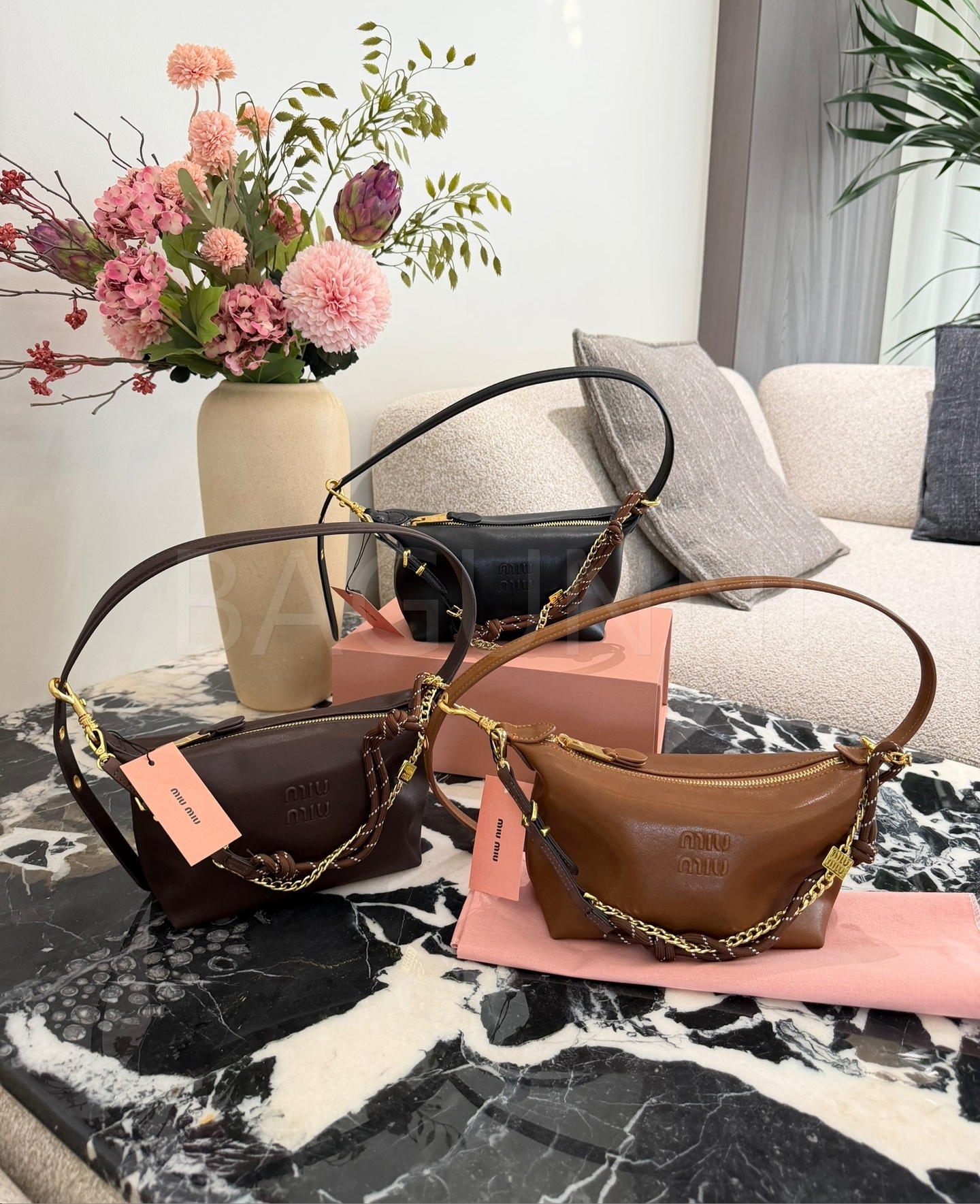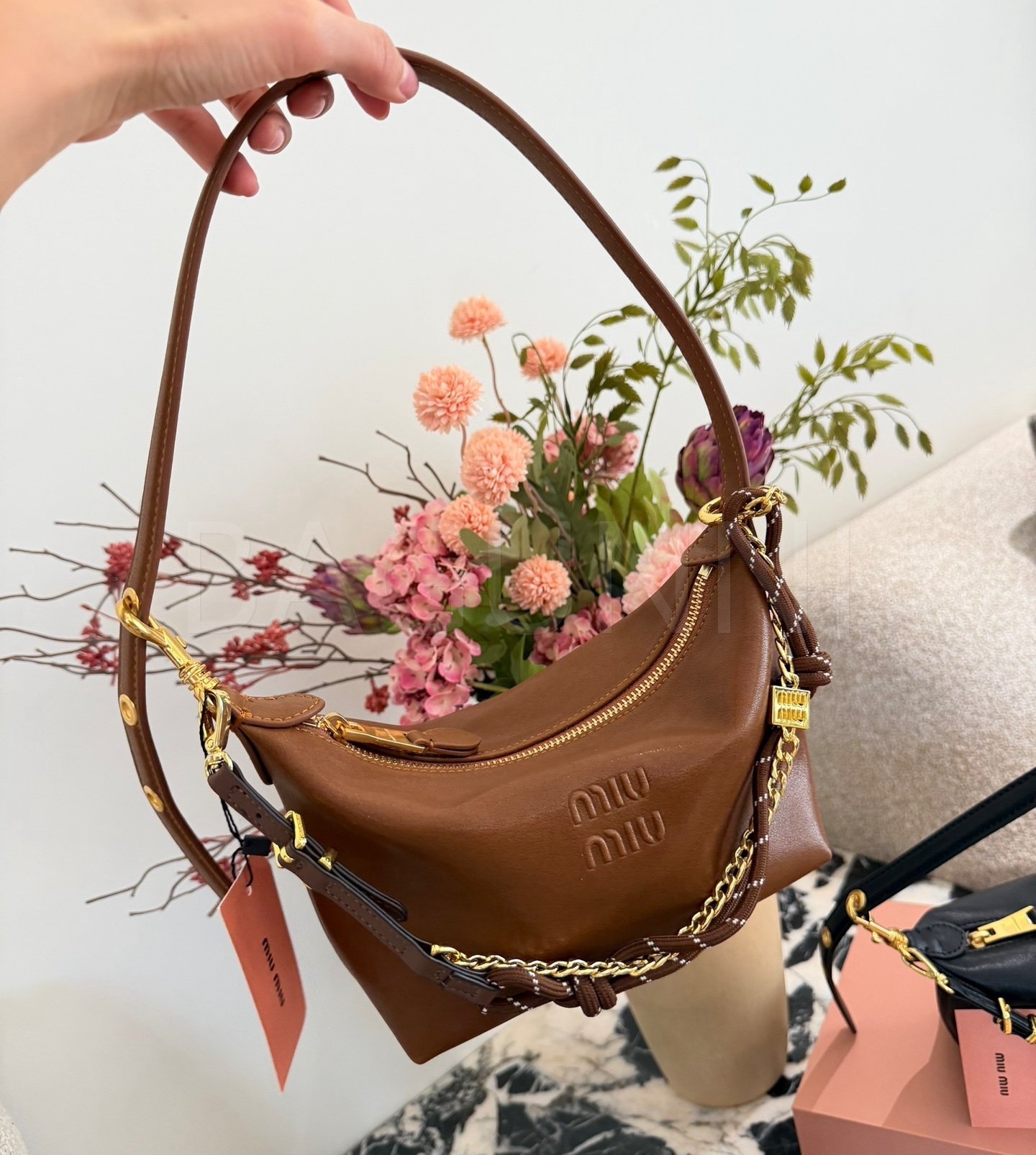 미우미우 나파 레더 박스 숄더백입니다. 램스킨 특유의 질감이 자연스럽게 살아 있으며 브라운, 카라멜 브라운 톤이 어우러져 브랜드 특유의 분위기를 편하게 즐기기 좋습니다.