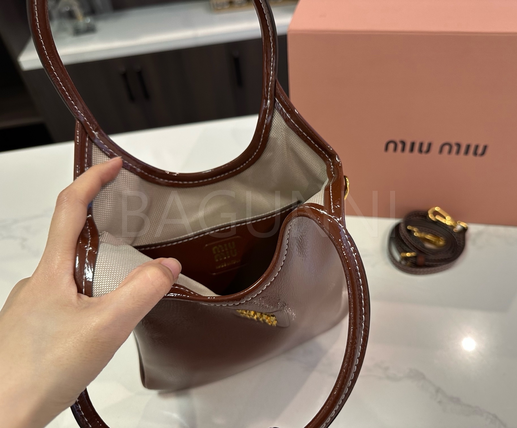미우미우 아이비 토트백입니다. 가죽 특유의 질감이 자연스럽게 살아 있으며 브랜드 특유의 분위기를 편하게 즐기기 좋습니다.