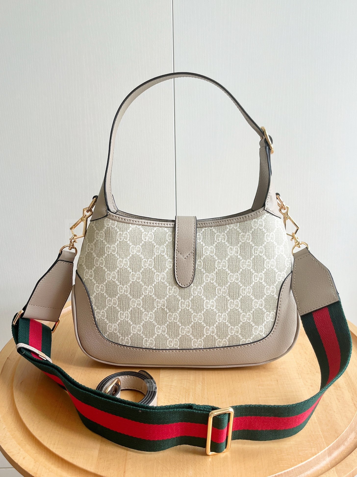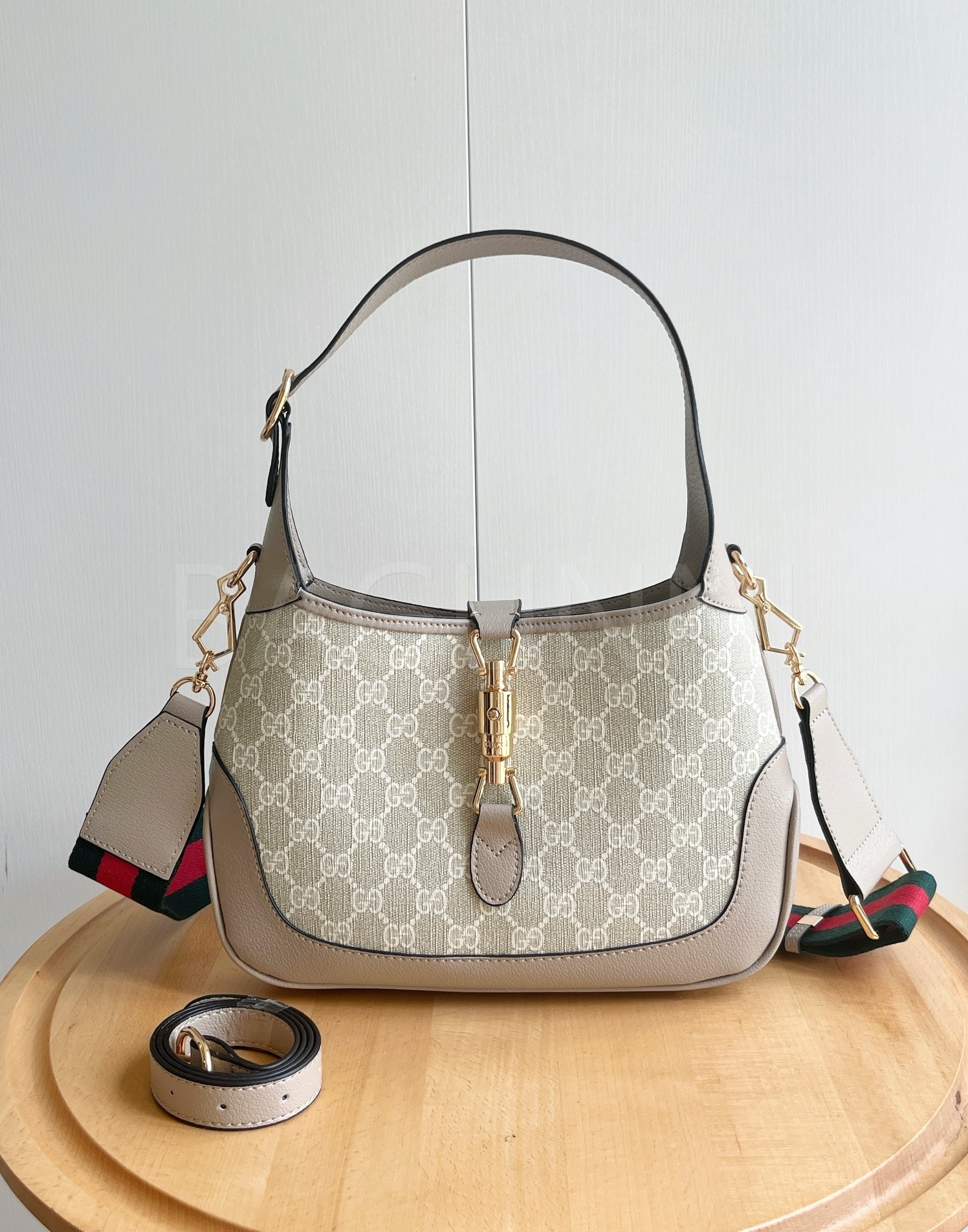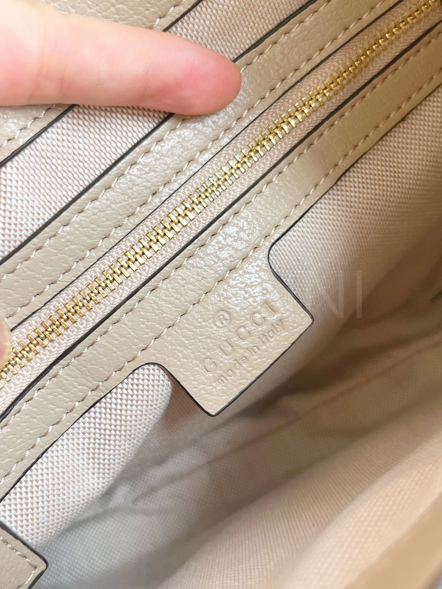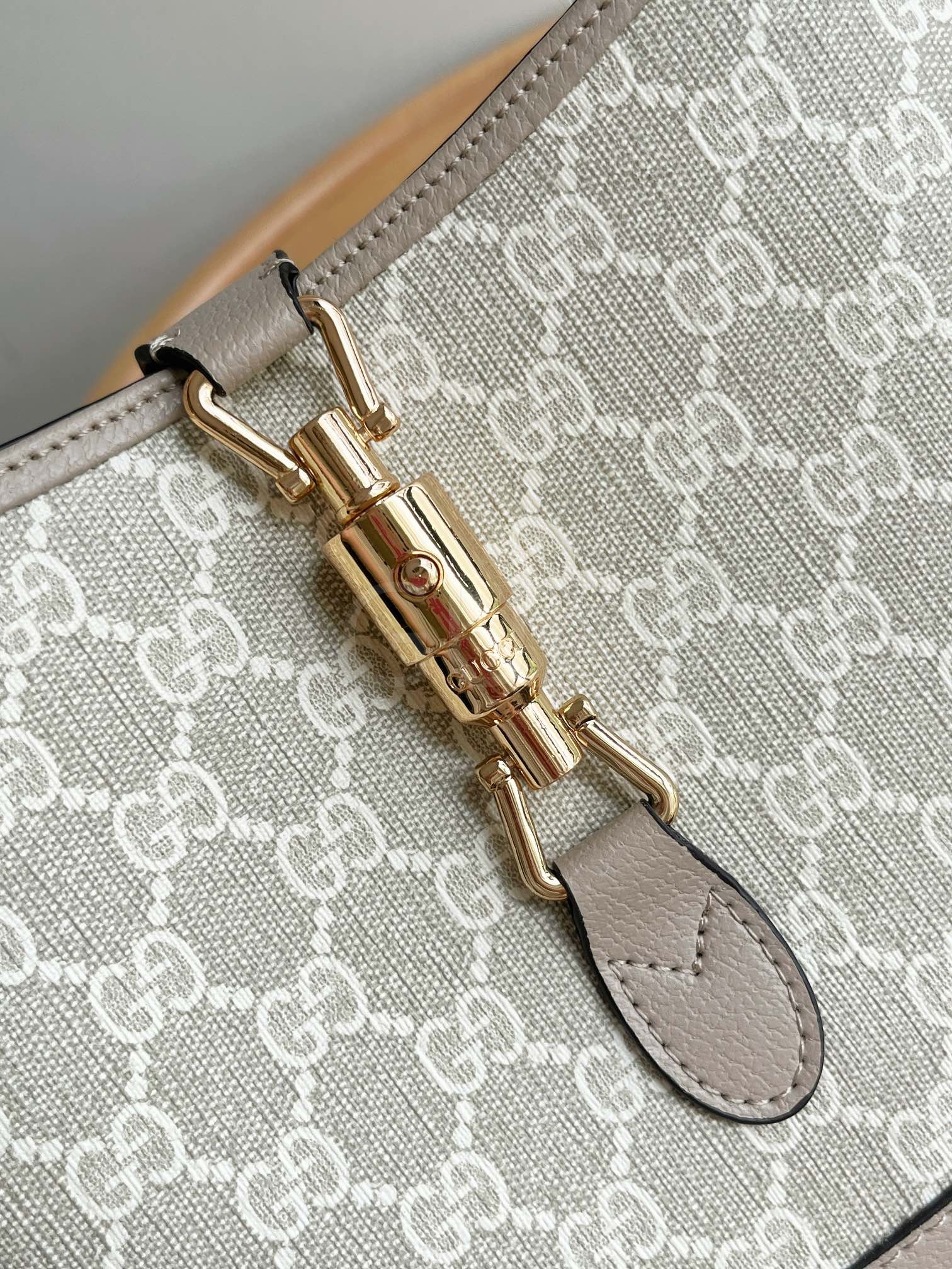 구찌 재키 토트백입니다. 가죽 특유의 질감이 자연스럽게 살아 있으며 블랙, 화이트, 골드 톤이 어우러져 브랜드 특유의 분위기를 편하게 즐기기 좋습니다.