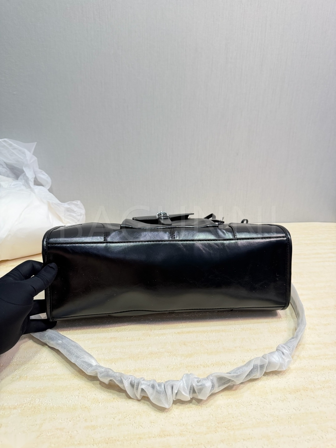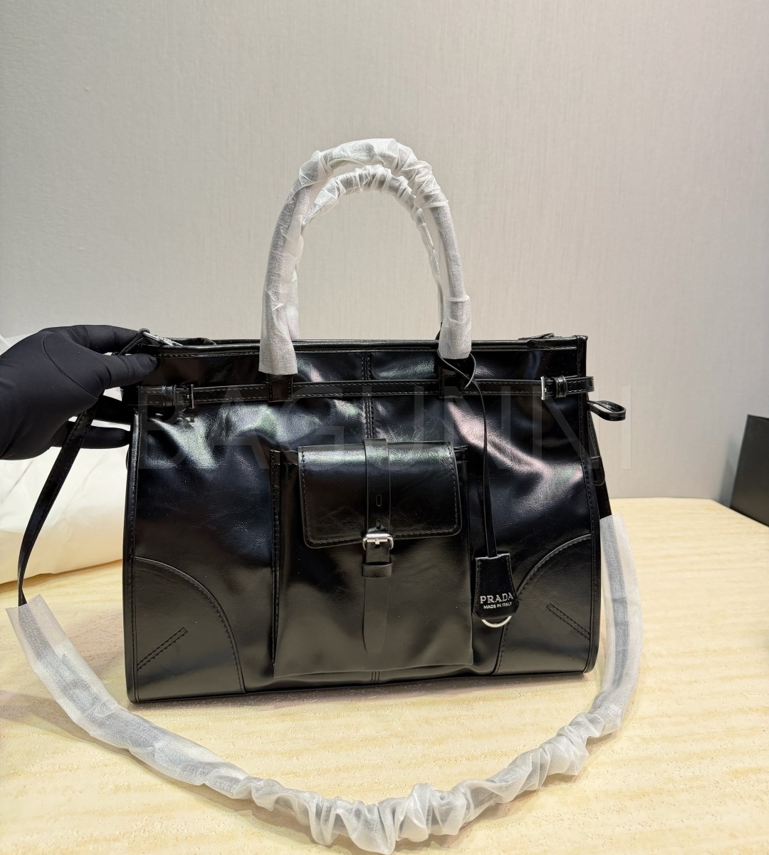 프라다 페이턴트 레더 토트백입니다. 가죽 특유의 질감이 자연스럽게 살아 있으며 블랙 톤이 어우러져 브랜드 특유의 분위기를 편하게 즐기기 좋습니다.