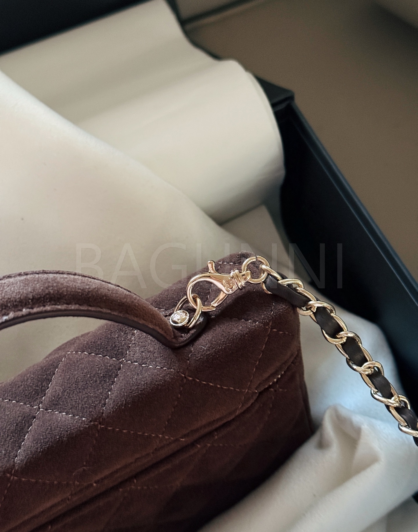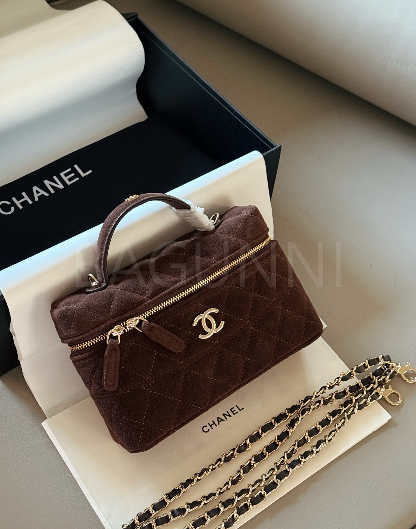 샤넬 스웨이드 탑핸들 베니티 백은 세련된 실루엣을 담은 아이템입니다.