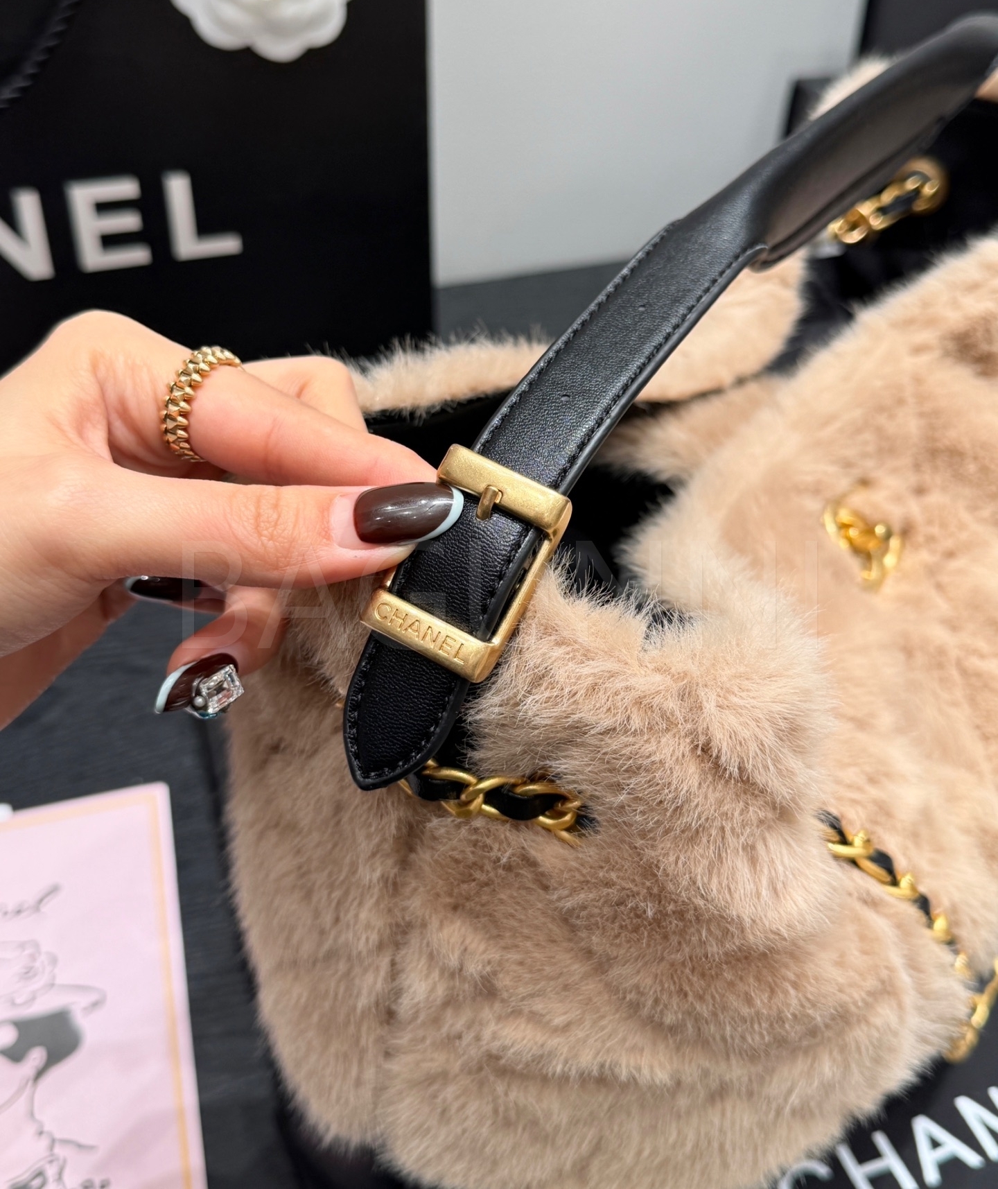 퀼팅 텍스처가 입체적인 포인트를 더합니다. 체인 스트랩으로 숄더와 크로스 연출이 가능합니다.