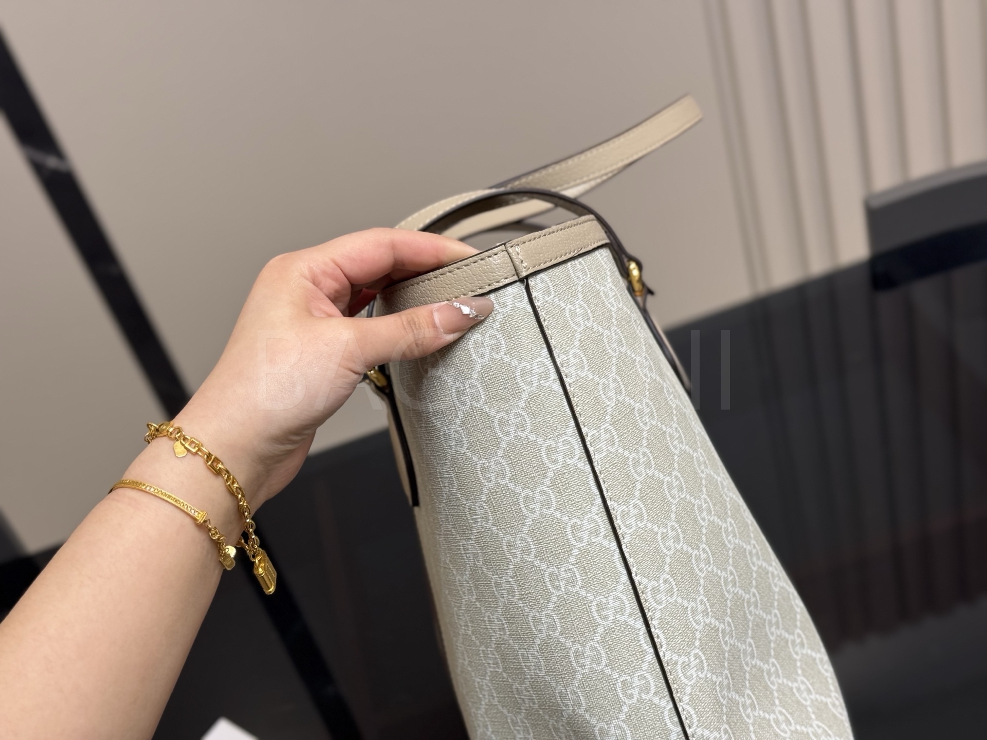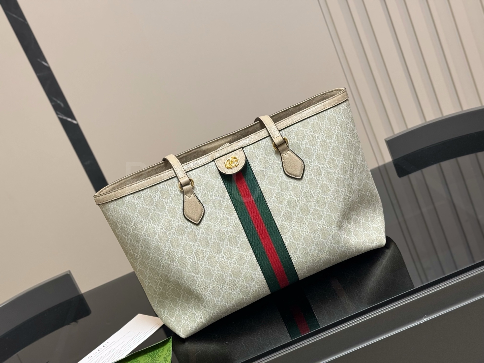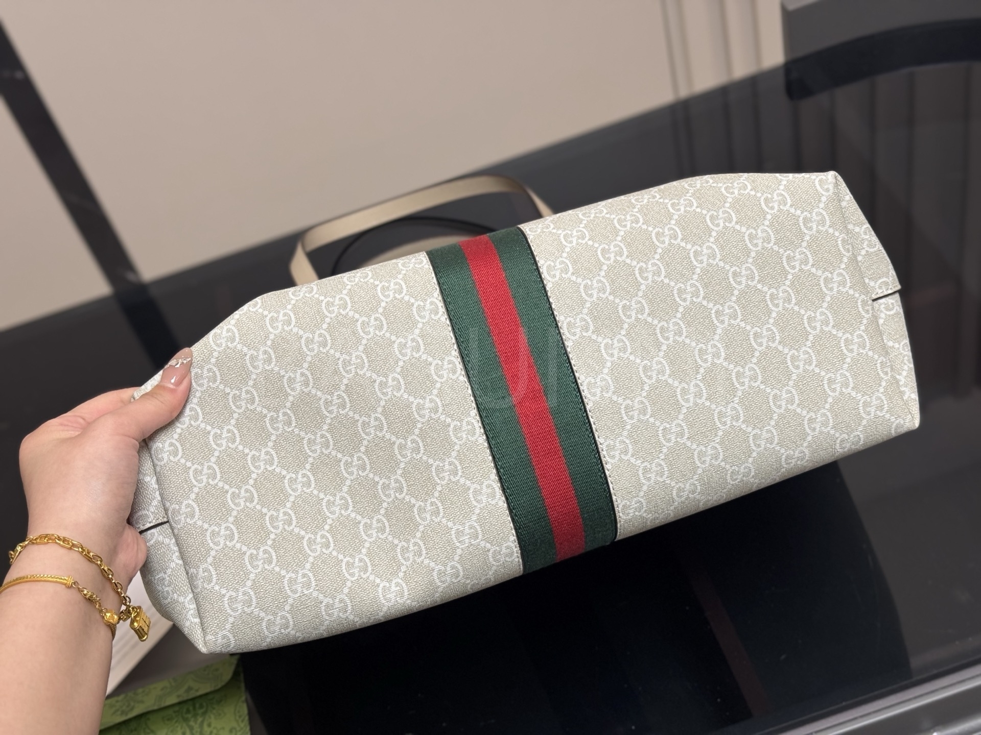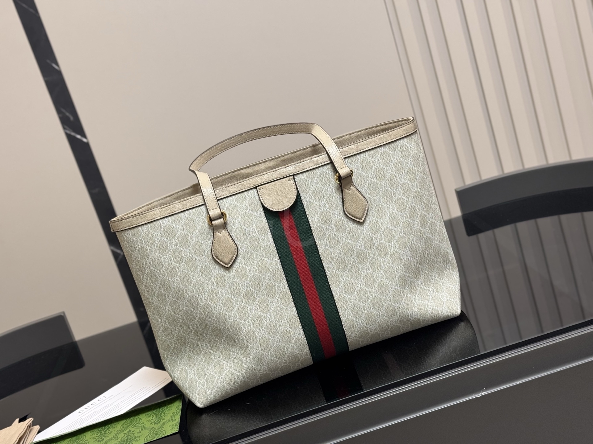 구찌 캔버스 쇼퍼백입니다. 캔버스 특유의 질감이 자연스럽게 살아 있으며 브랜드 특유의 분위기를 편하게 즐기기 좋습니다.