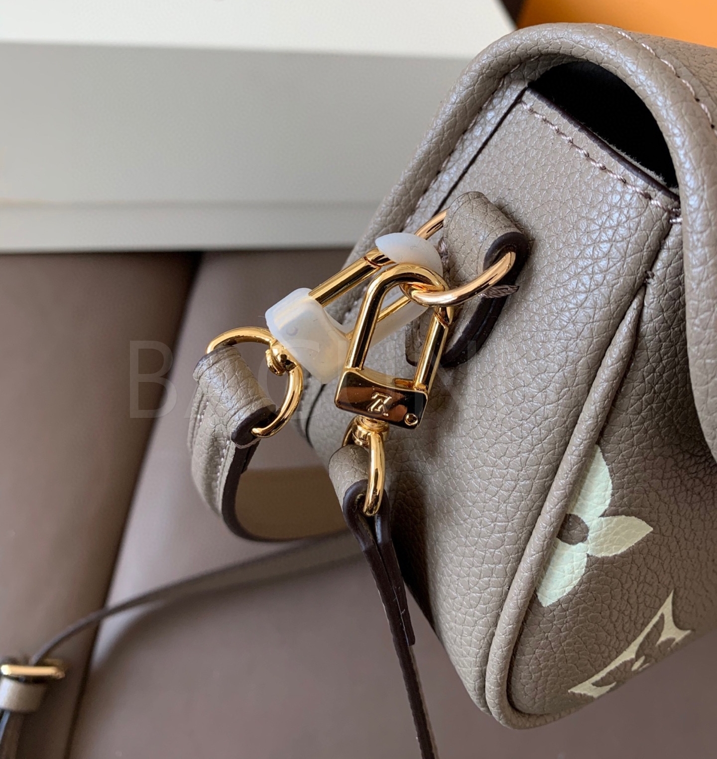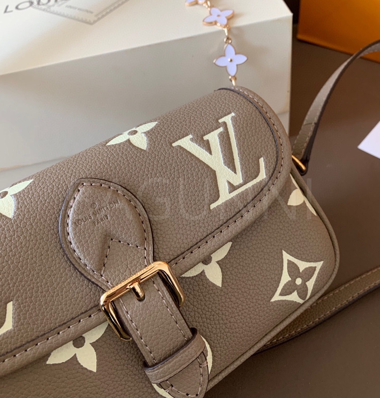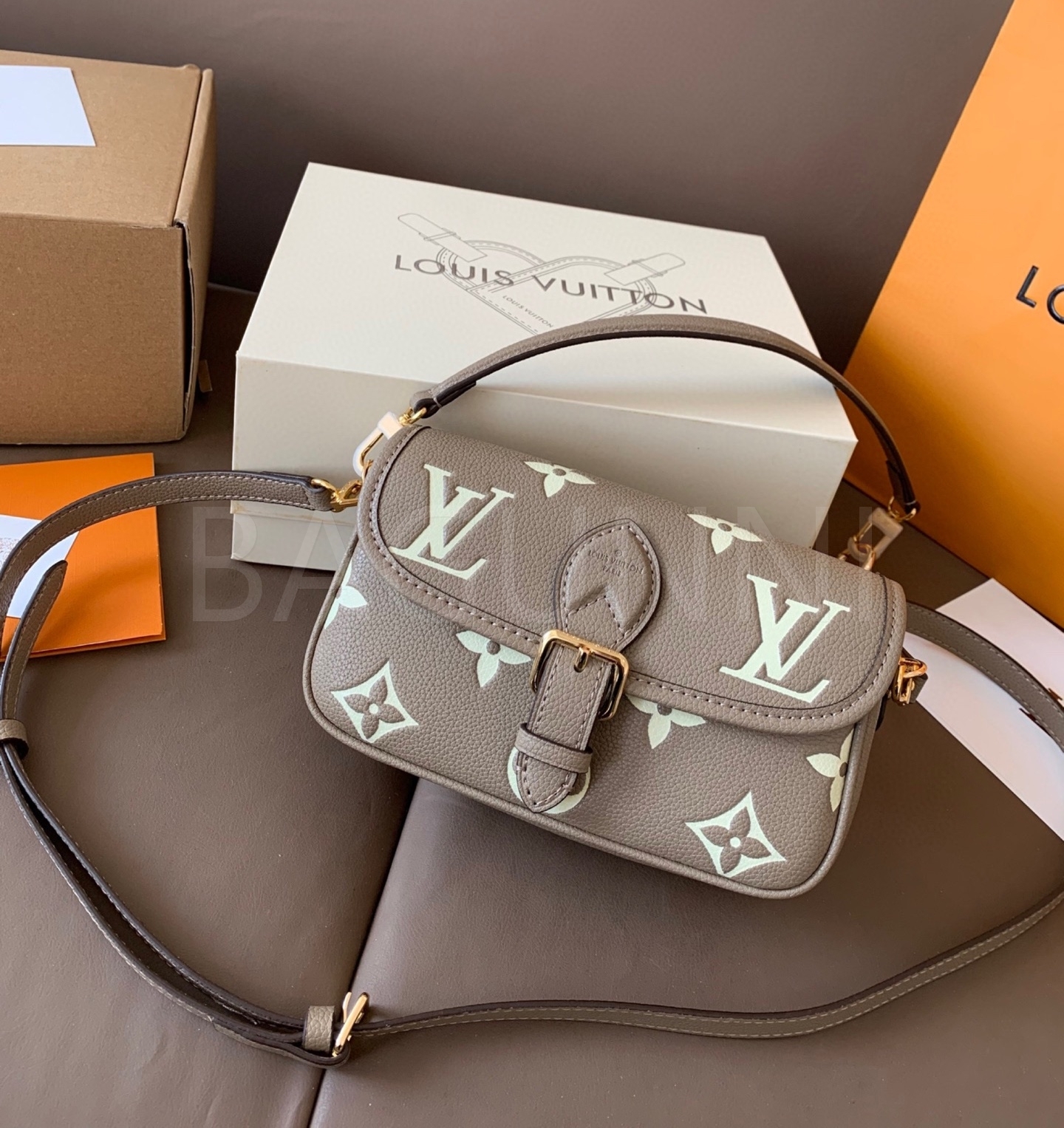 입체적인 엠보싱 가죽 질감이 매력적인 루이비통 앙프렝뜨 숄더백입니다.