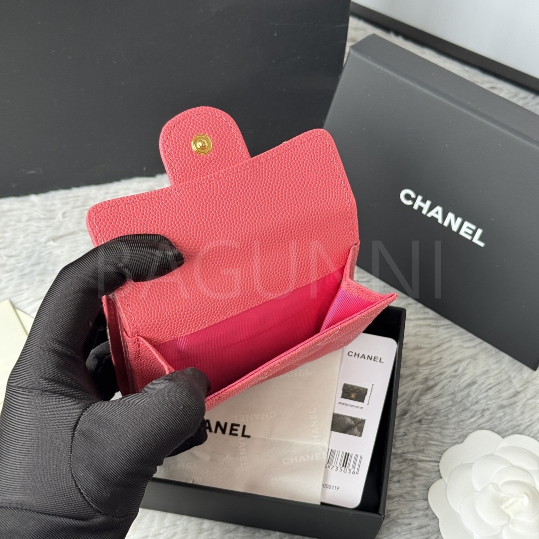 카프스킨의 질감이 돋보이는 샤넬 트리폴드 반지갑입니다.