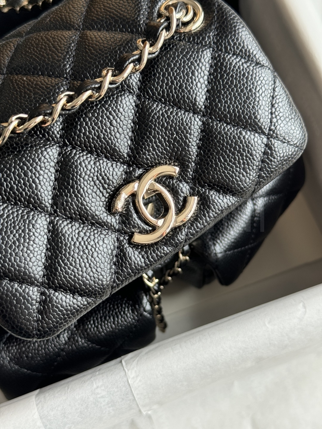 캐비어 가죽 특유의 매력이 돋보이는 샤넬 두마 백팩입니다.