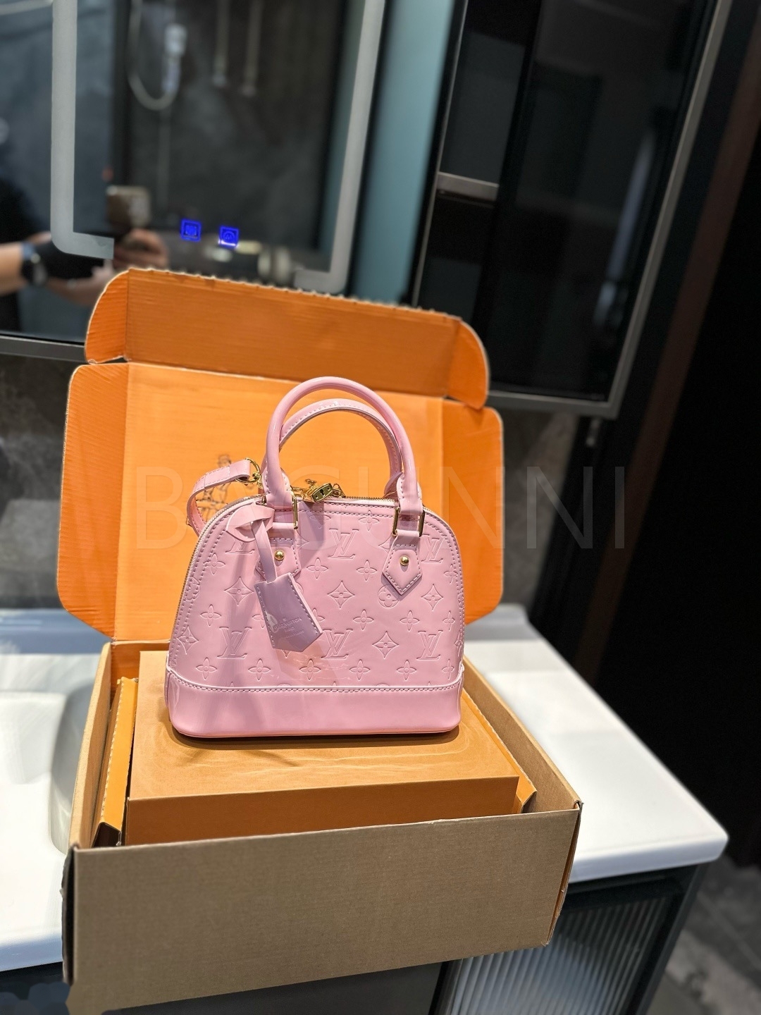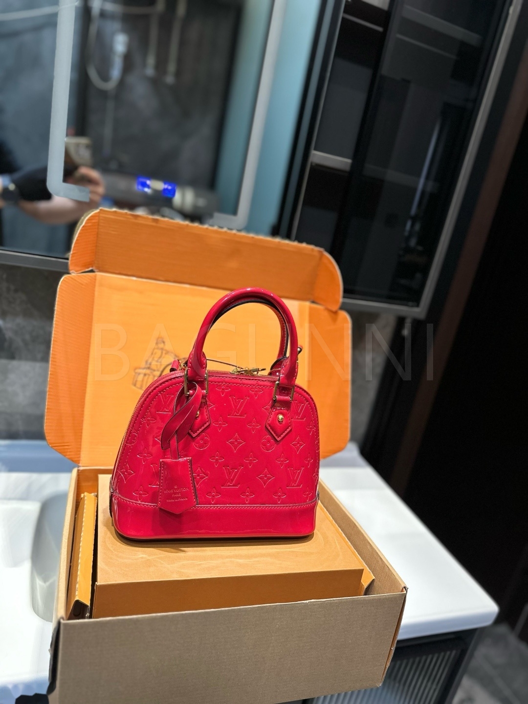 페이턴트 가죽 소재의 매력이 자연스럽게 살아 있는 루이비통 알마 백입니다.