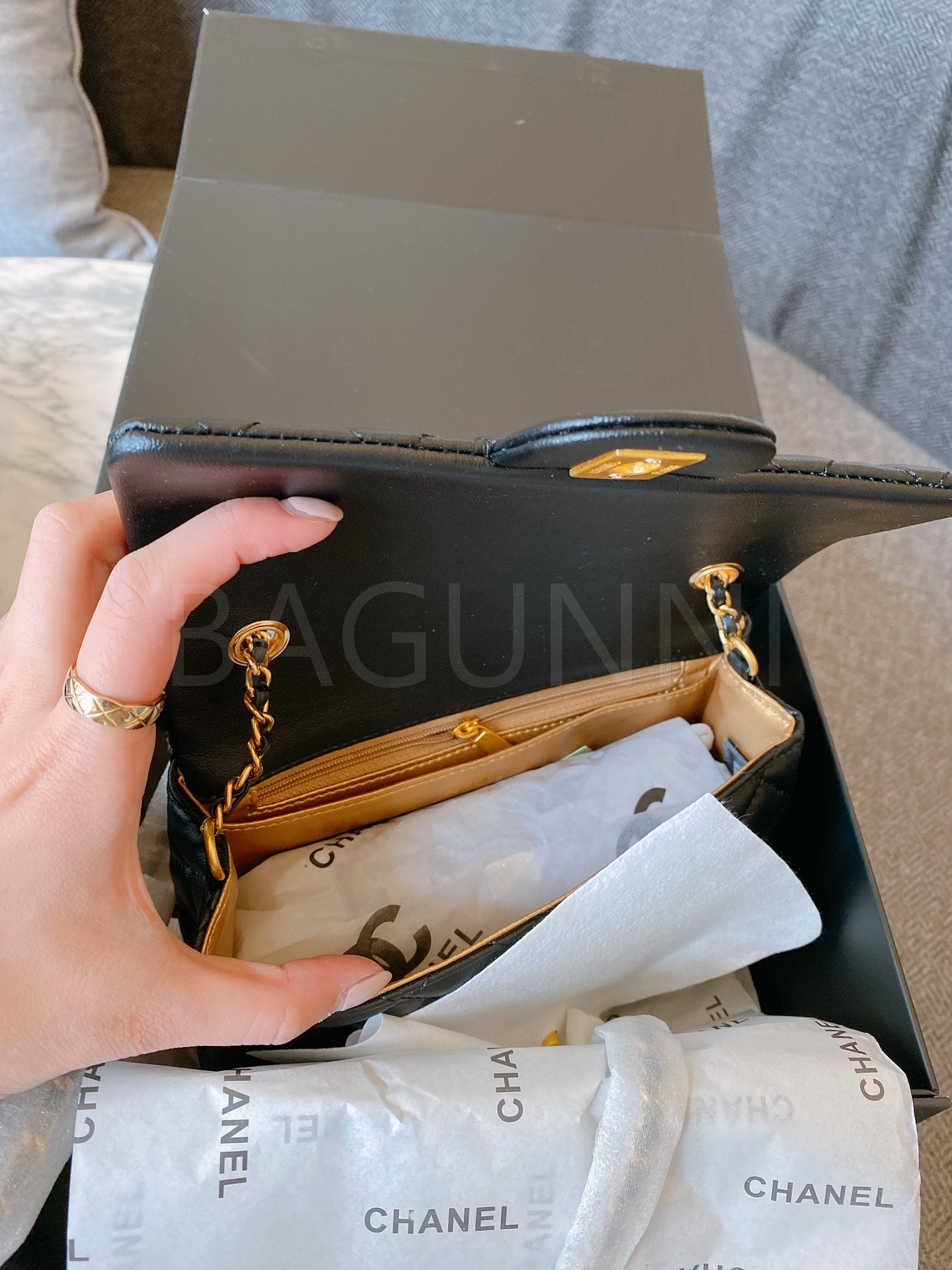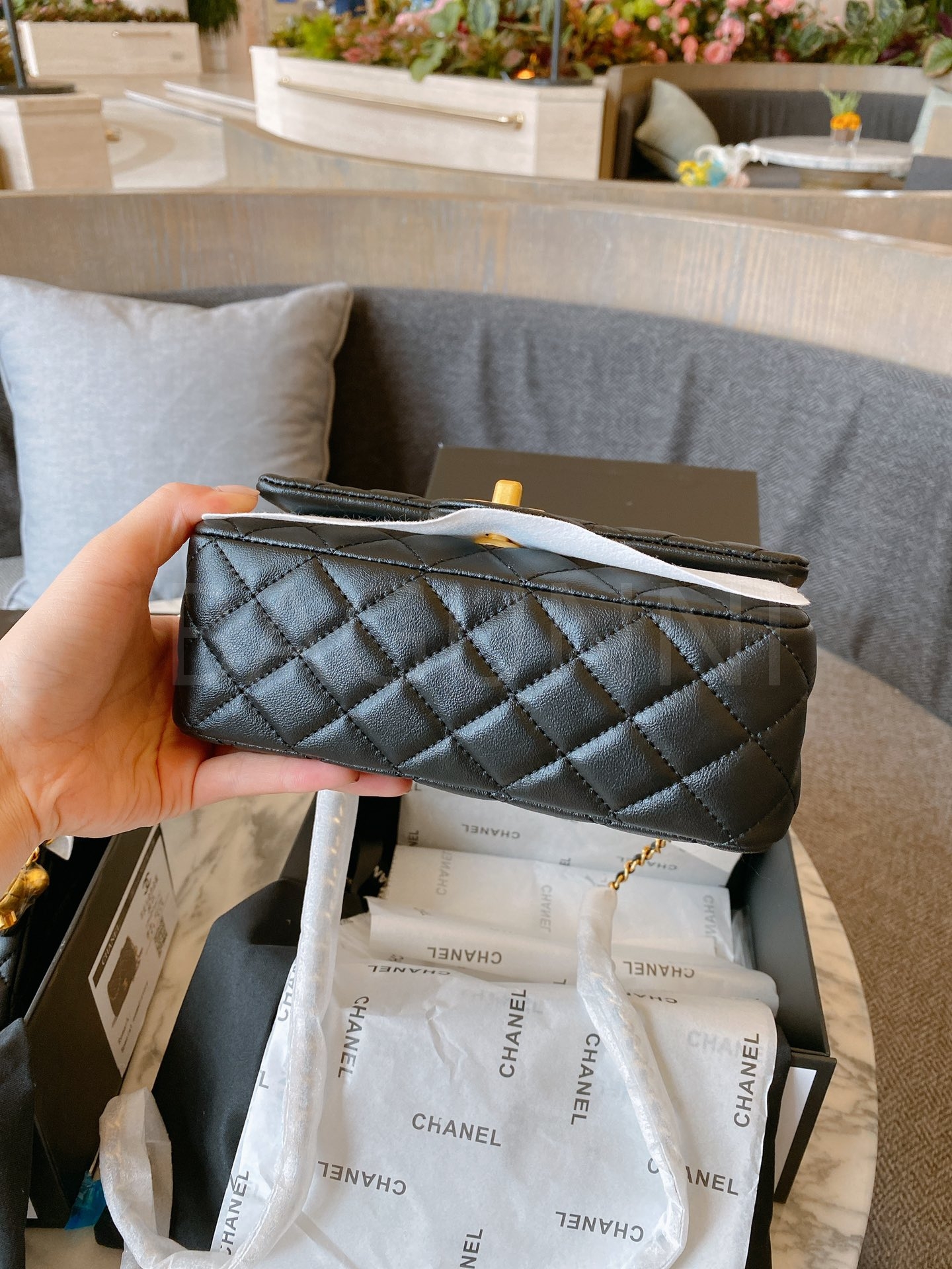 램스킨 특유의 매력이 돋보이는 샤넬 금볼 스퀘어 플랩 백입니다.