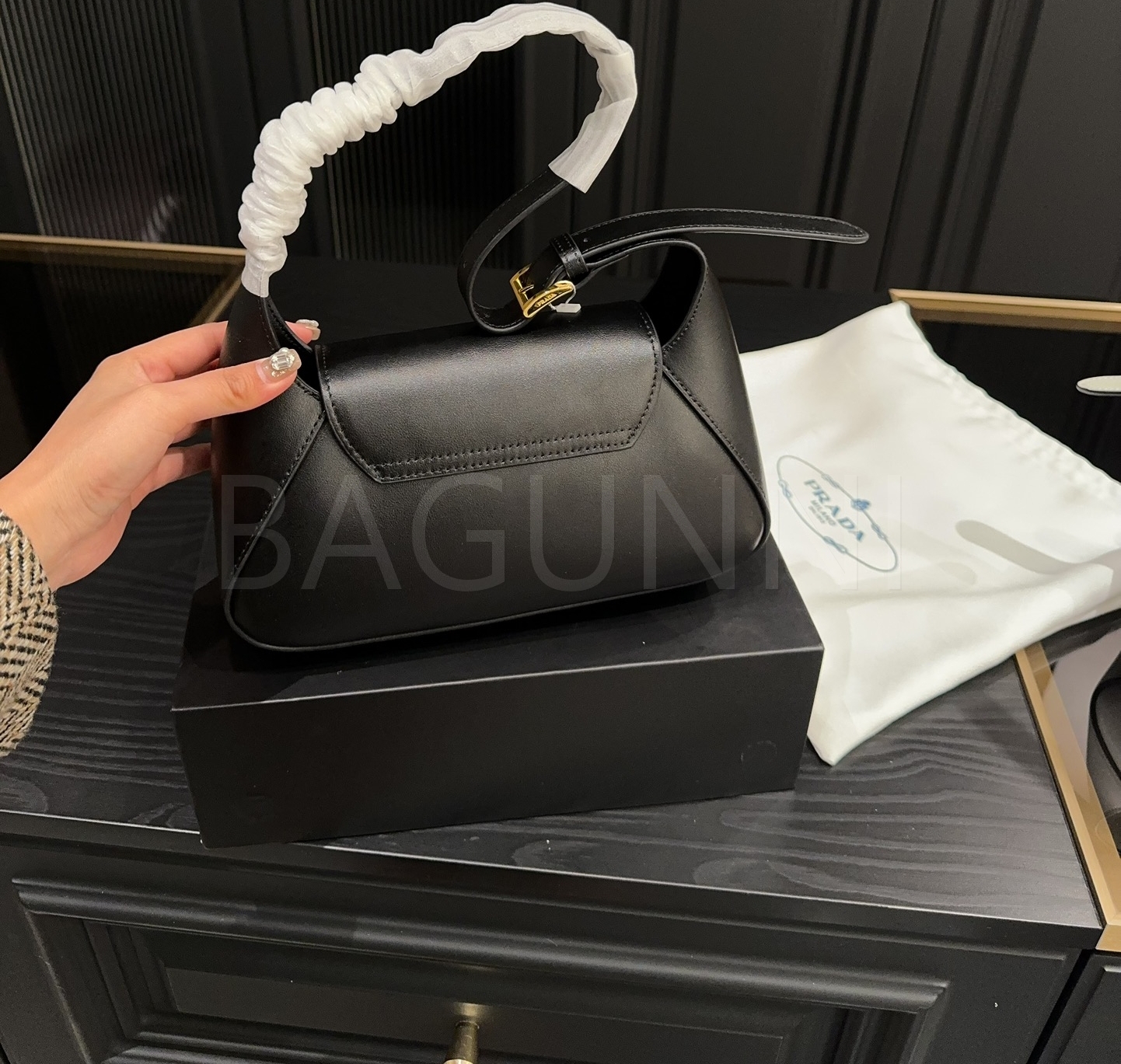 프라다 레더 호보백입니다. 가죽 특유의 질감이 자연스럽게 살아 있으며 브랜드 특유의 분위기를 편하게 즐기기 좋습니다.