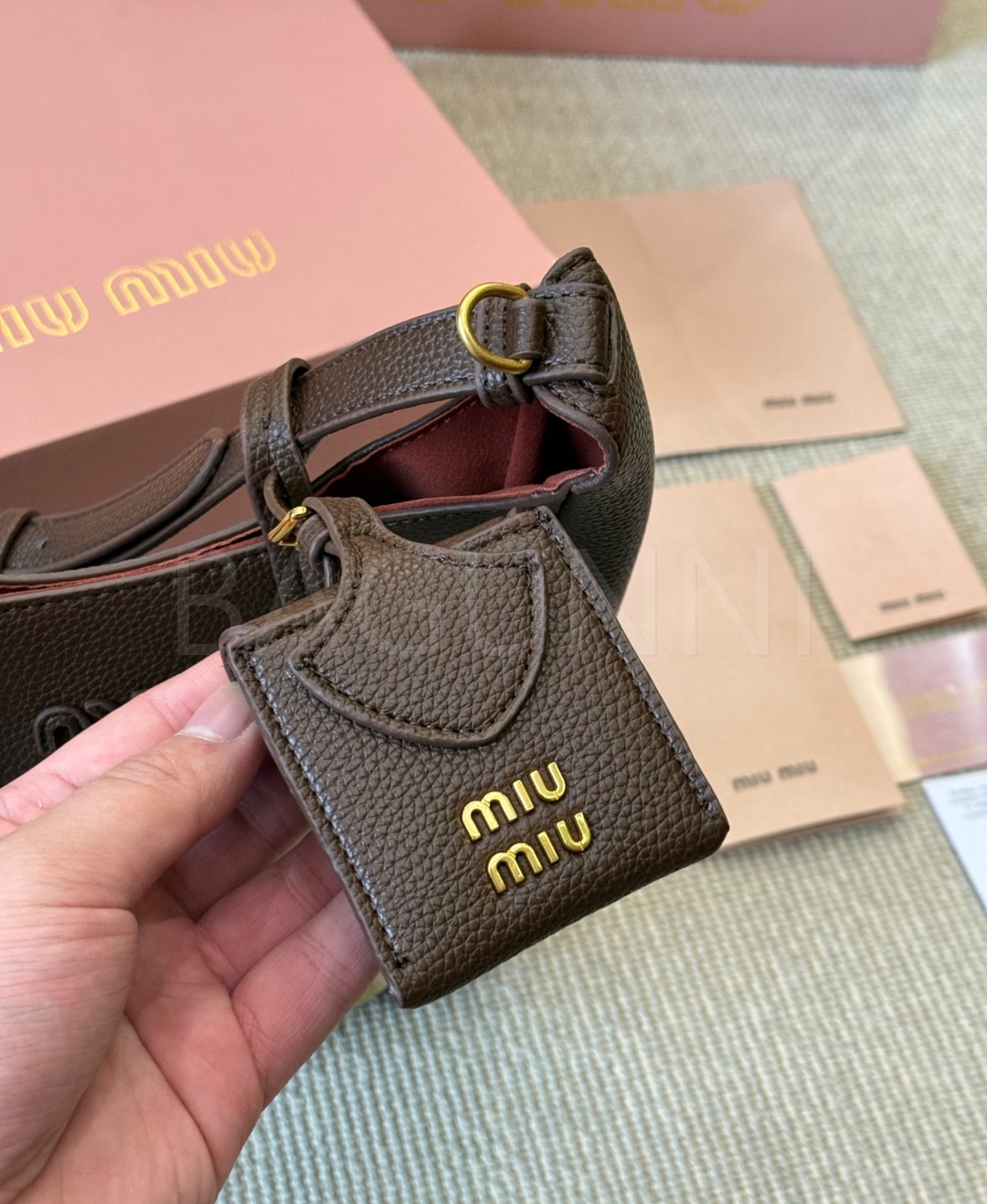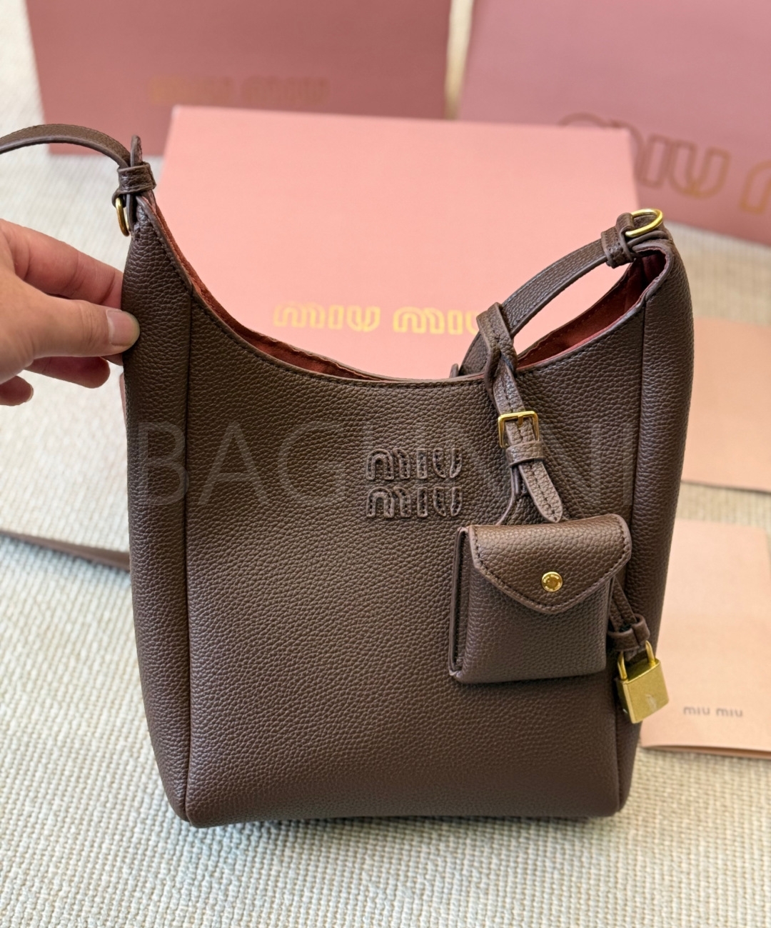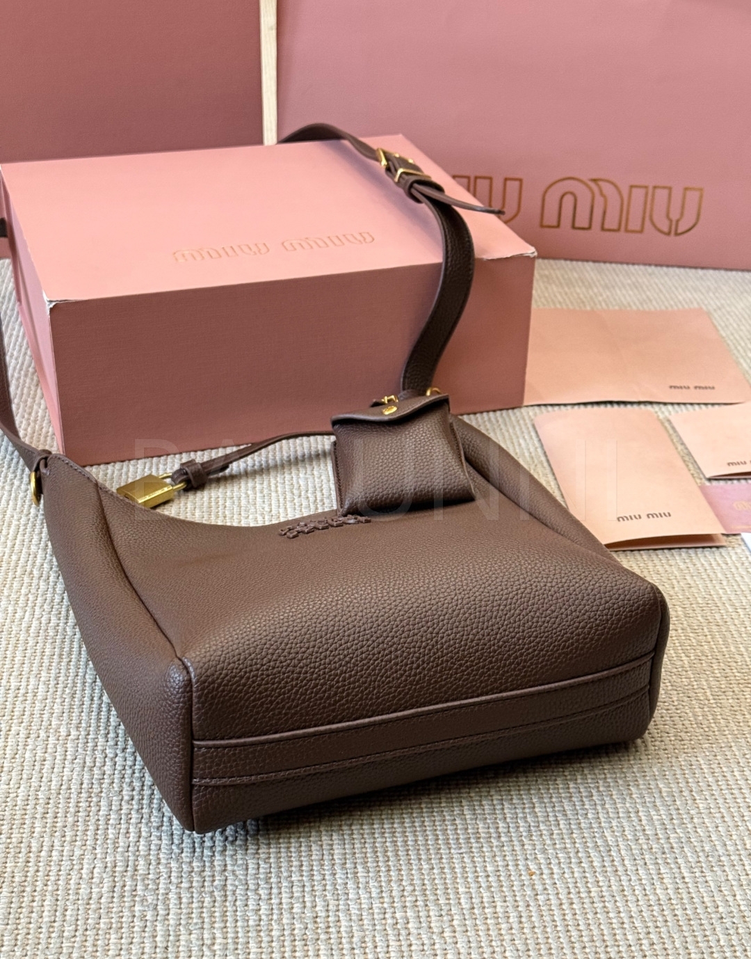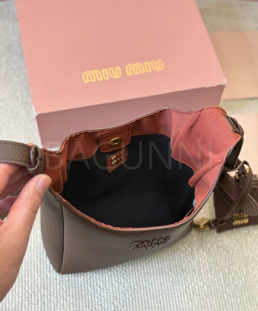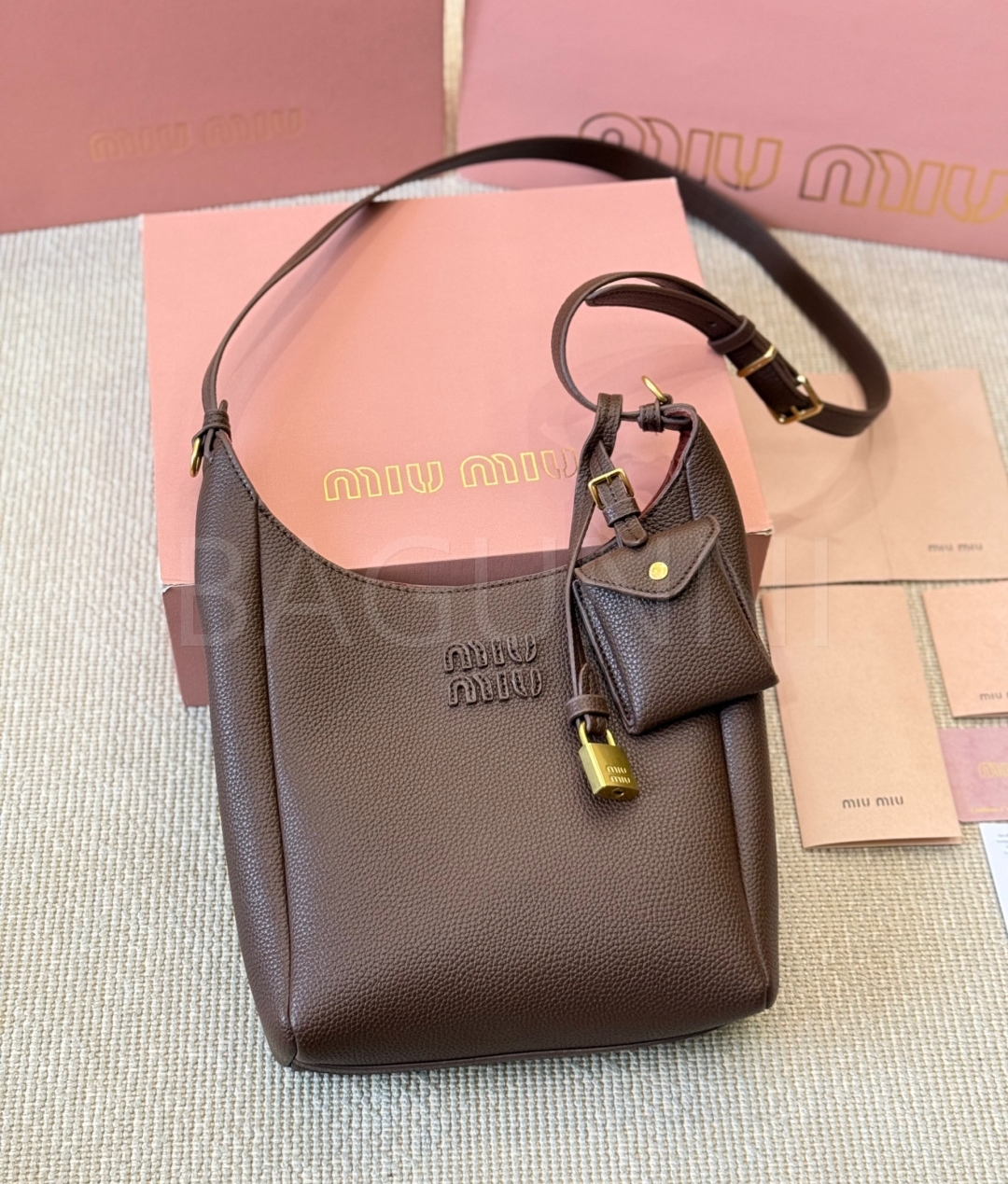 미우미우 로고 버킷백입니다. 가죽 특유의 질감이 자연스럽게 살아 있으며 브라운 톤이 어우러져 브랜드 특유의 분위기를 편하게 즐기기 좋습니다.