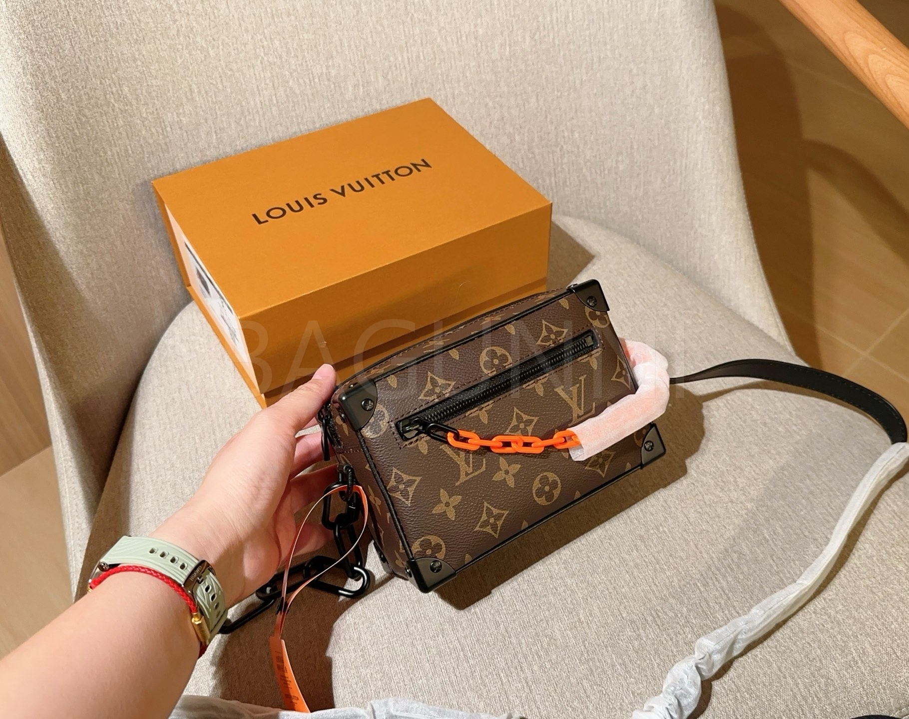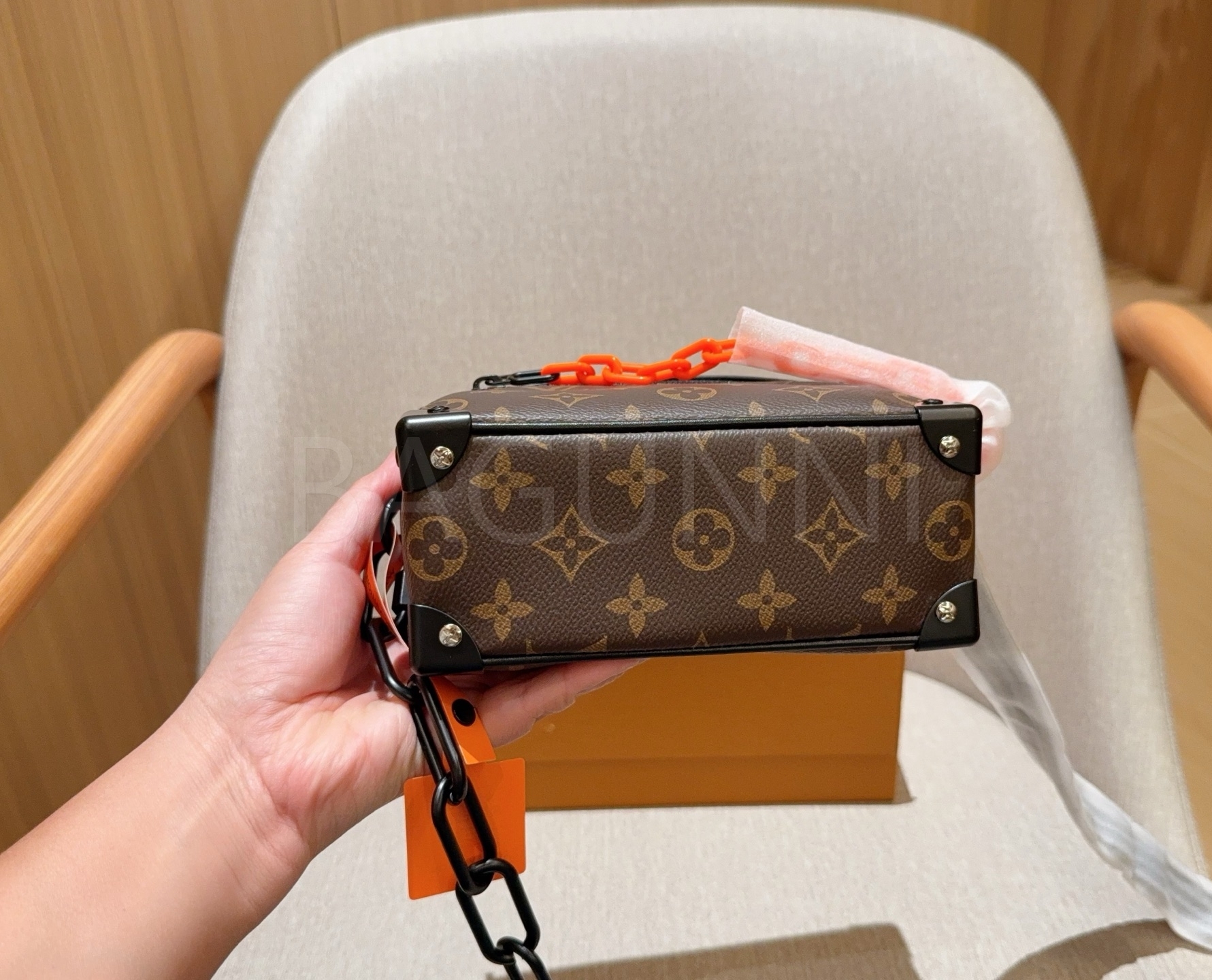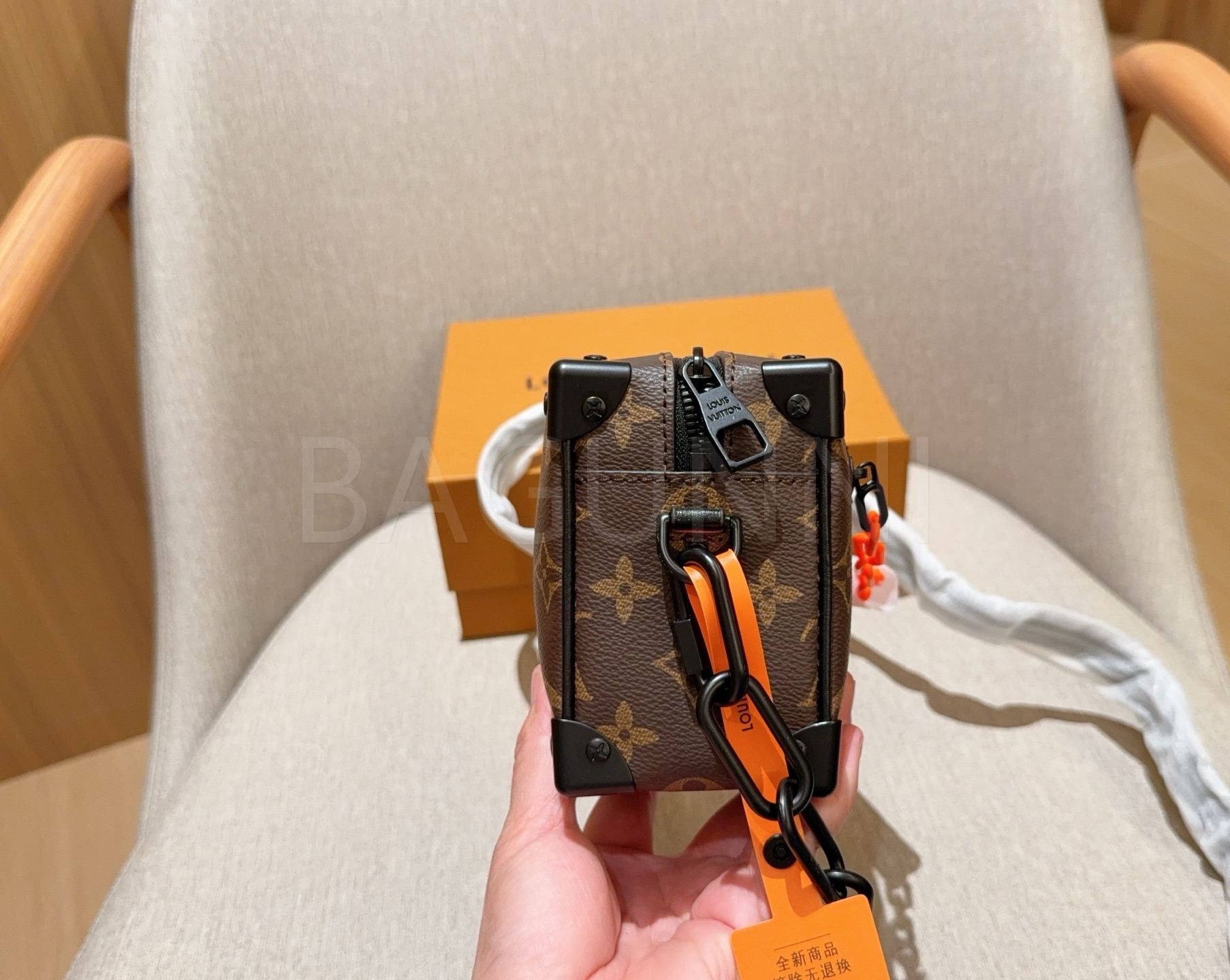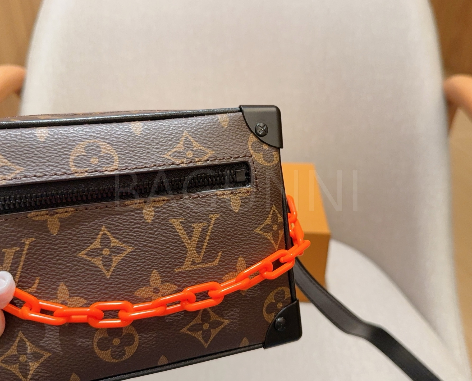 체인 스트랩, 박스 실루엣 디테일이 조화롭게 어우러져 완성도를 높여줍니다