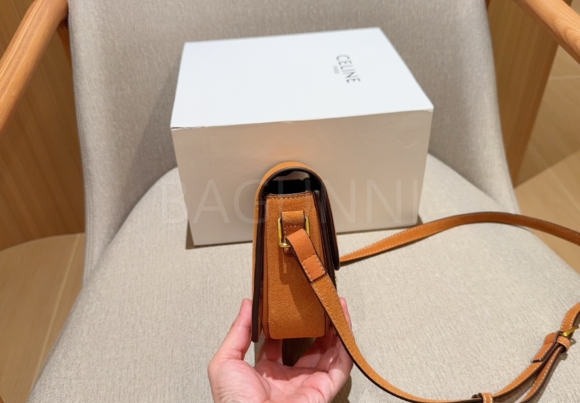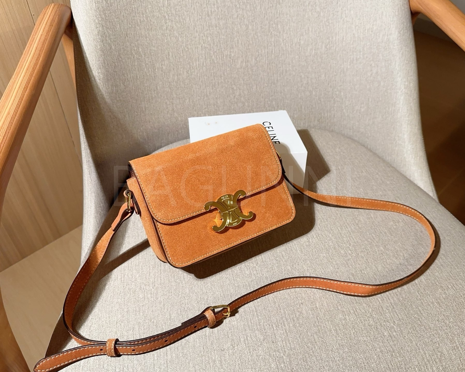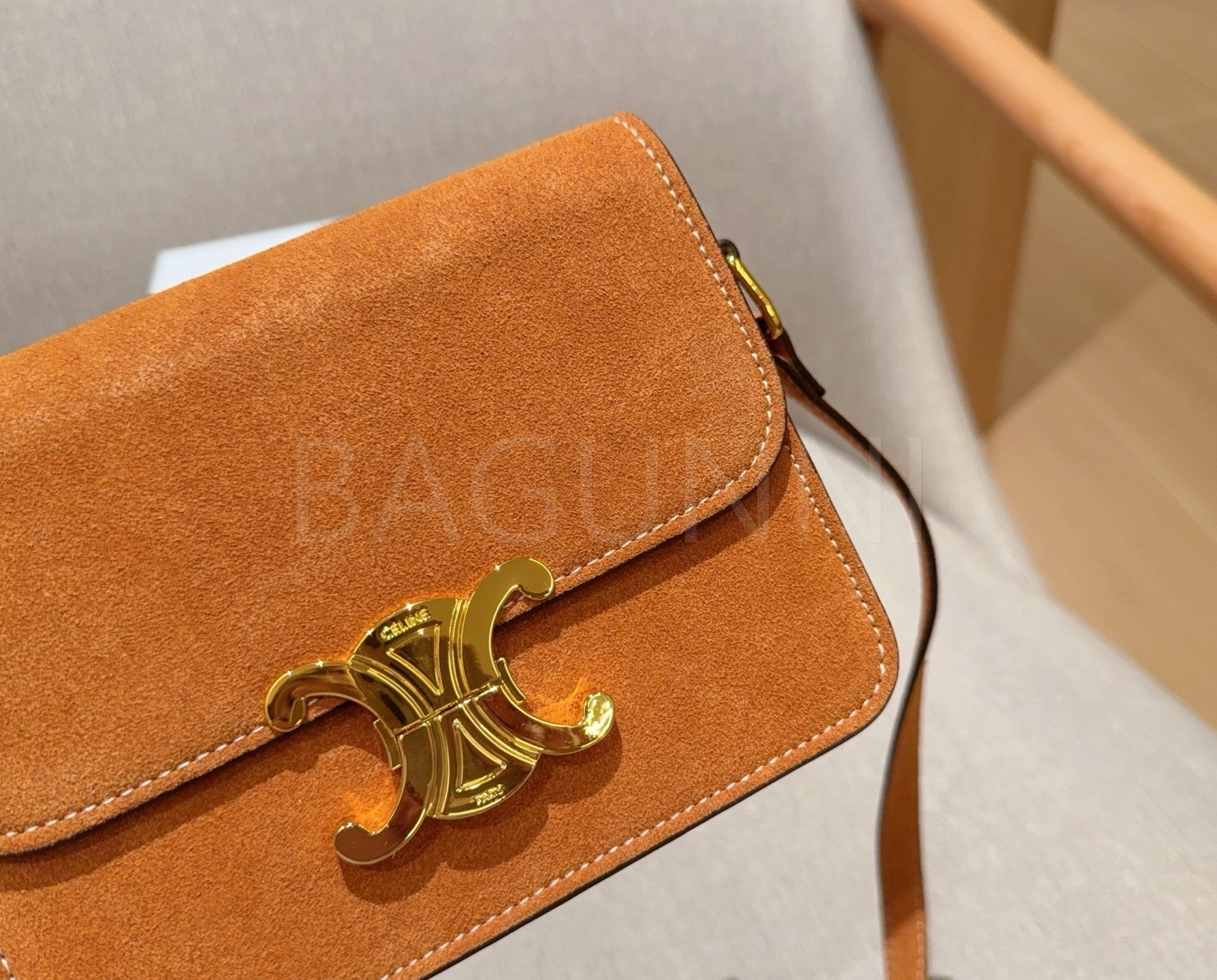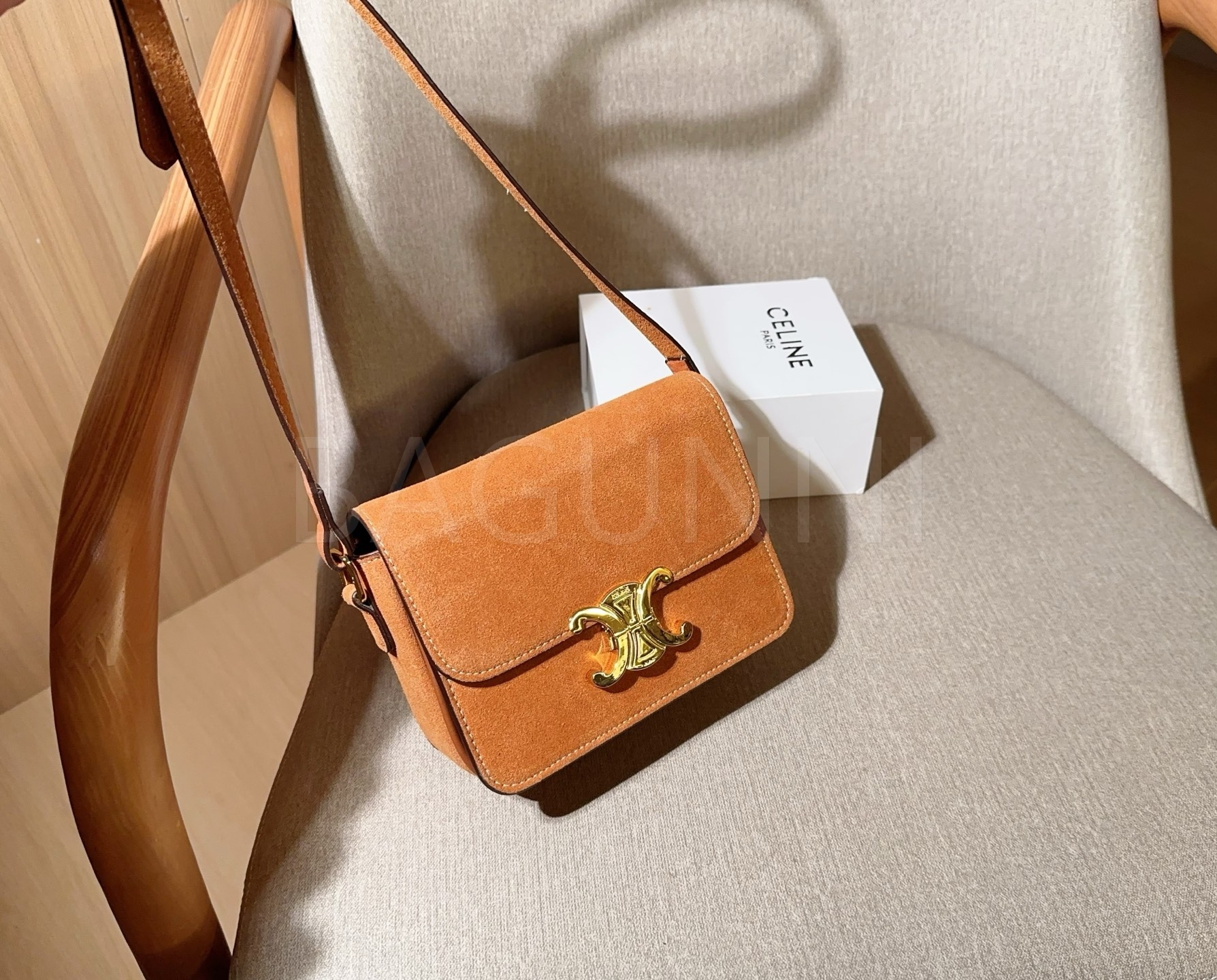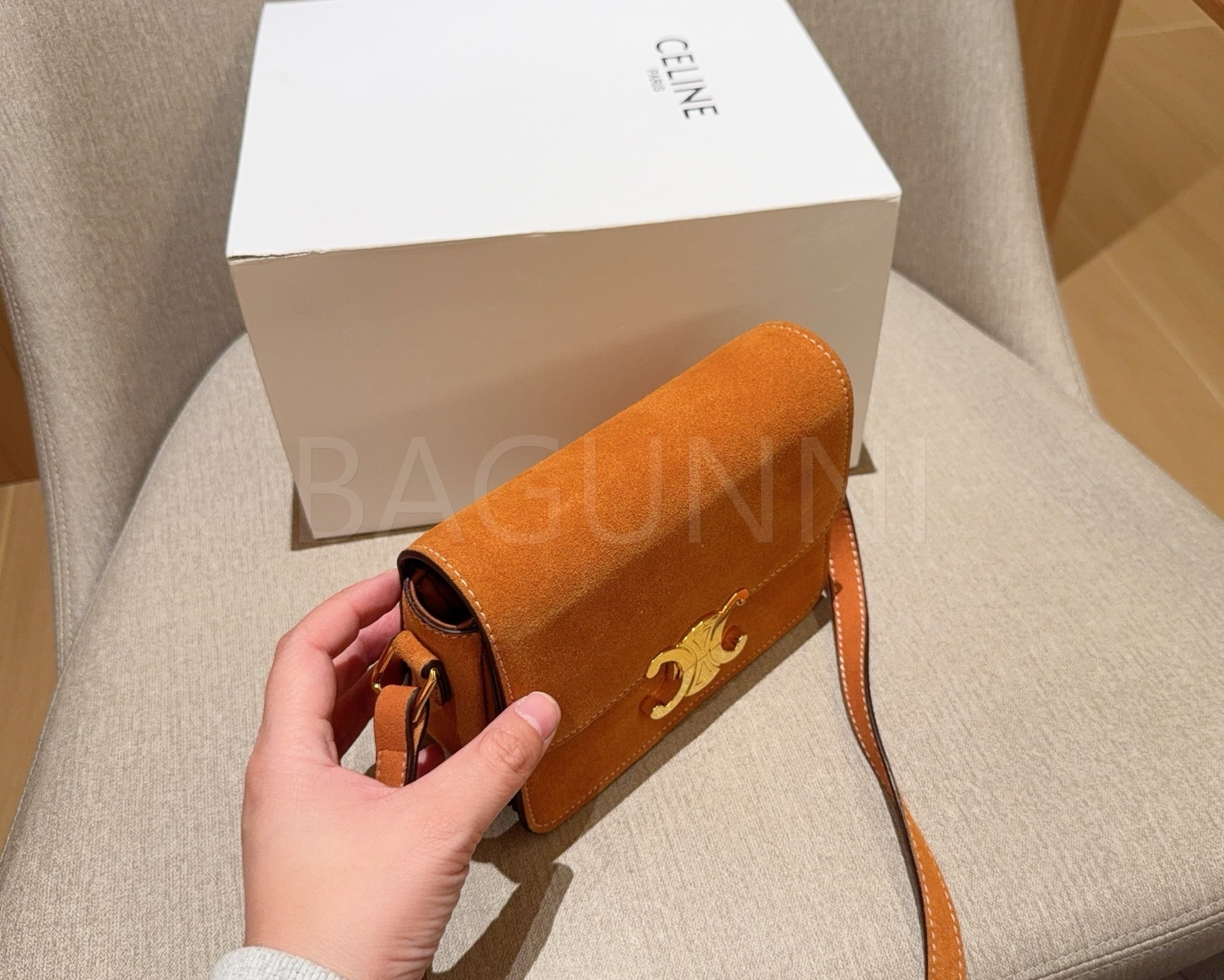 셀린느 트리옹프 스웨이드 숄더백입니다. 스웨이드 특유의 질감이 자연스럽게 살아 있으며 브랜드 특유의 분위기를 편하게 즐기기 좋습니다.