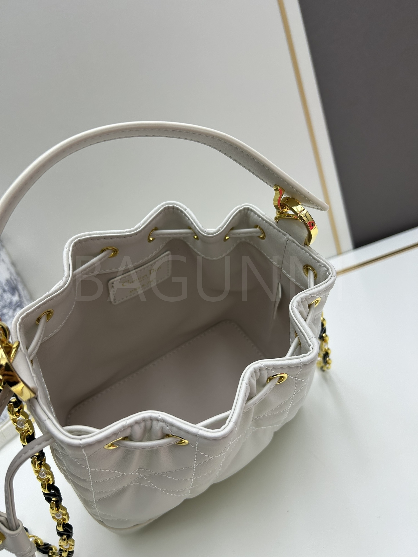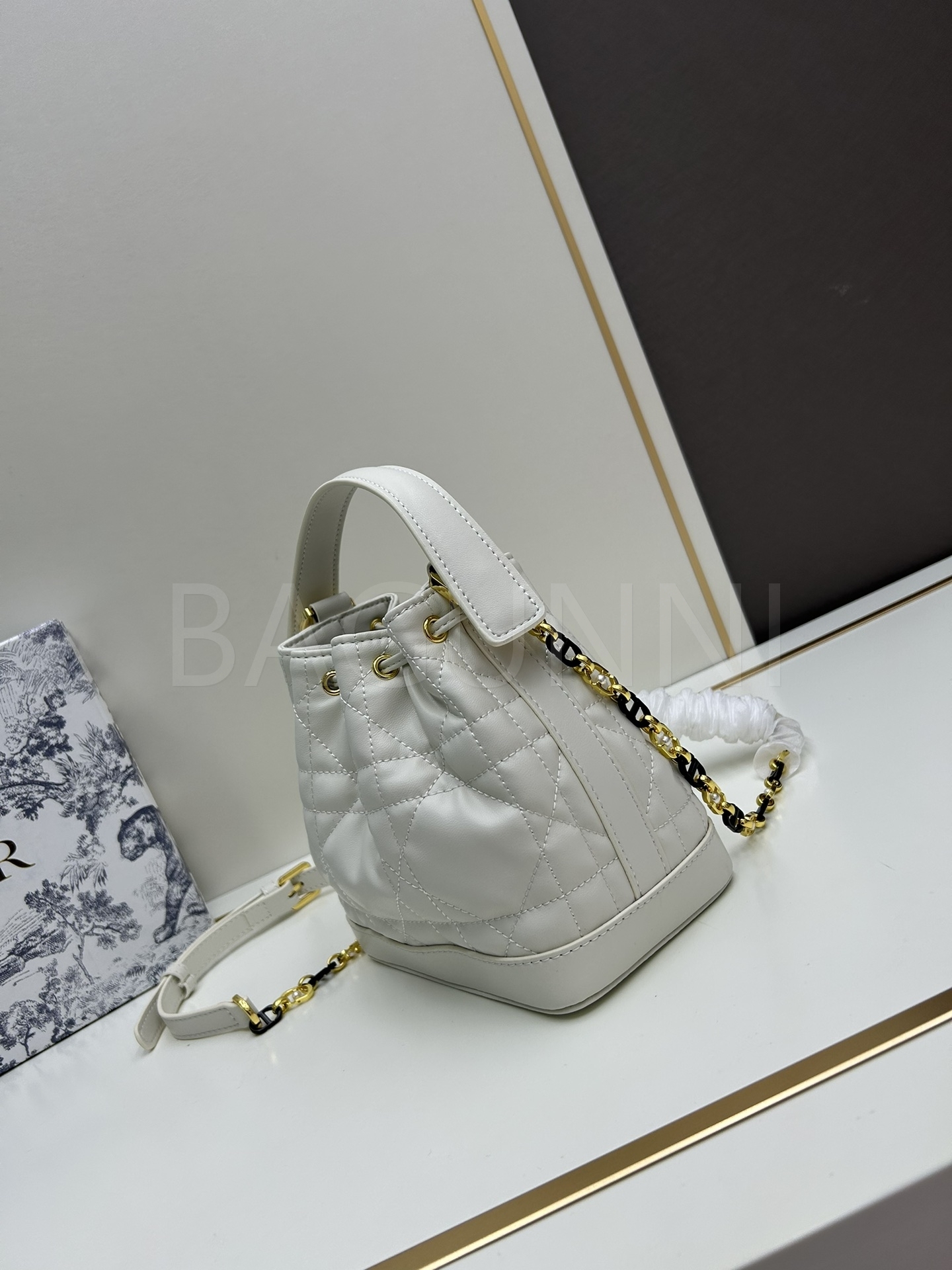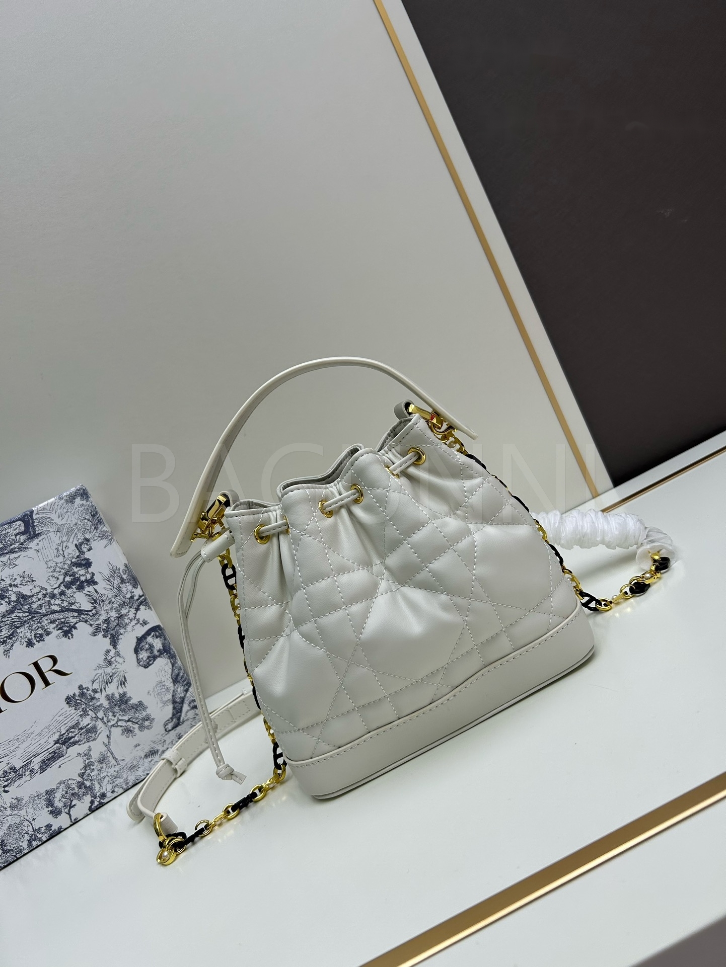 디올 졸리 버킷백입니다. 가죽 특유의 질감이 자연스럽게 살아 있으며 화이트, 골드 톤이 어우러져 브랜드 특유의 분위기를 편하게 즐기기 좋습니다.