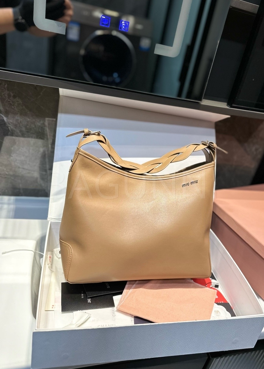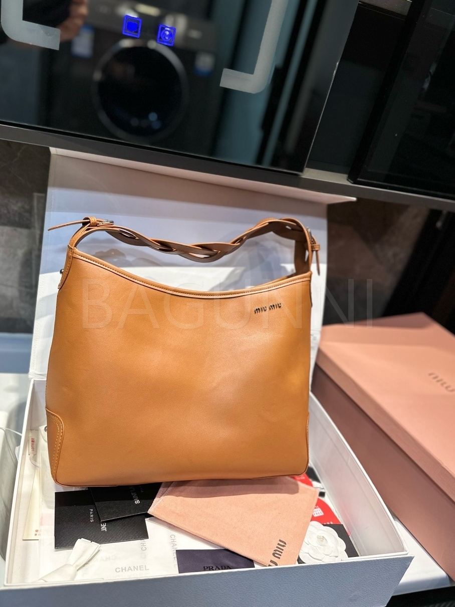 미우미우 워크 토트백입니다. 브라운 톤이 어우러져 브랜드 특유의 분위기를 편하게 즐기기 좋습니다.