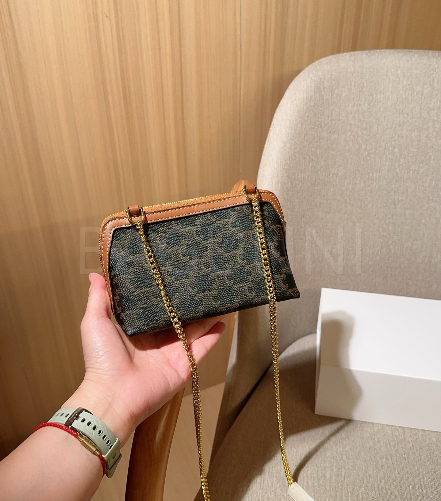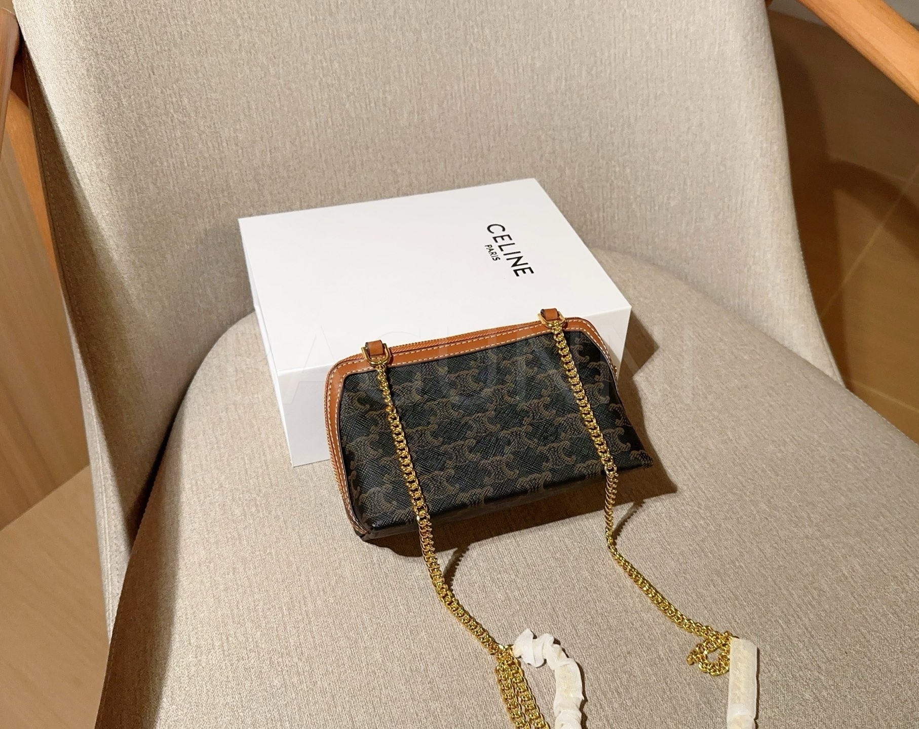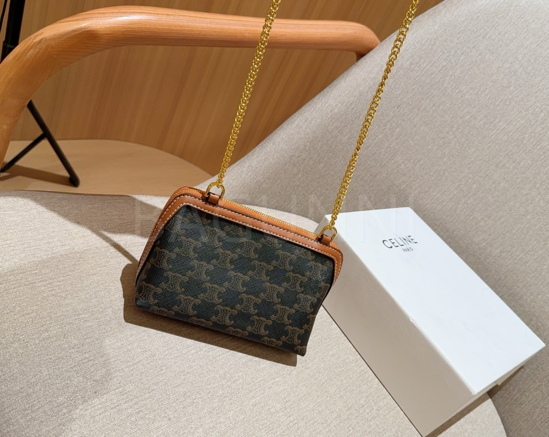 셀린느 트리옹프 체인 클러치입니다. 브랜드 특유의 분위기를 편하게 즐기기 좋습니다.