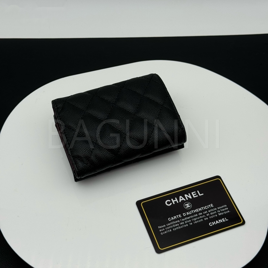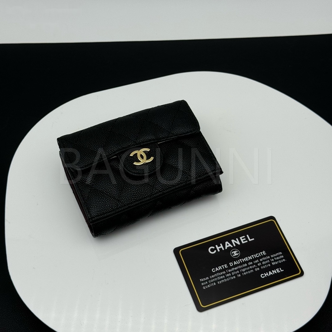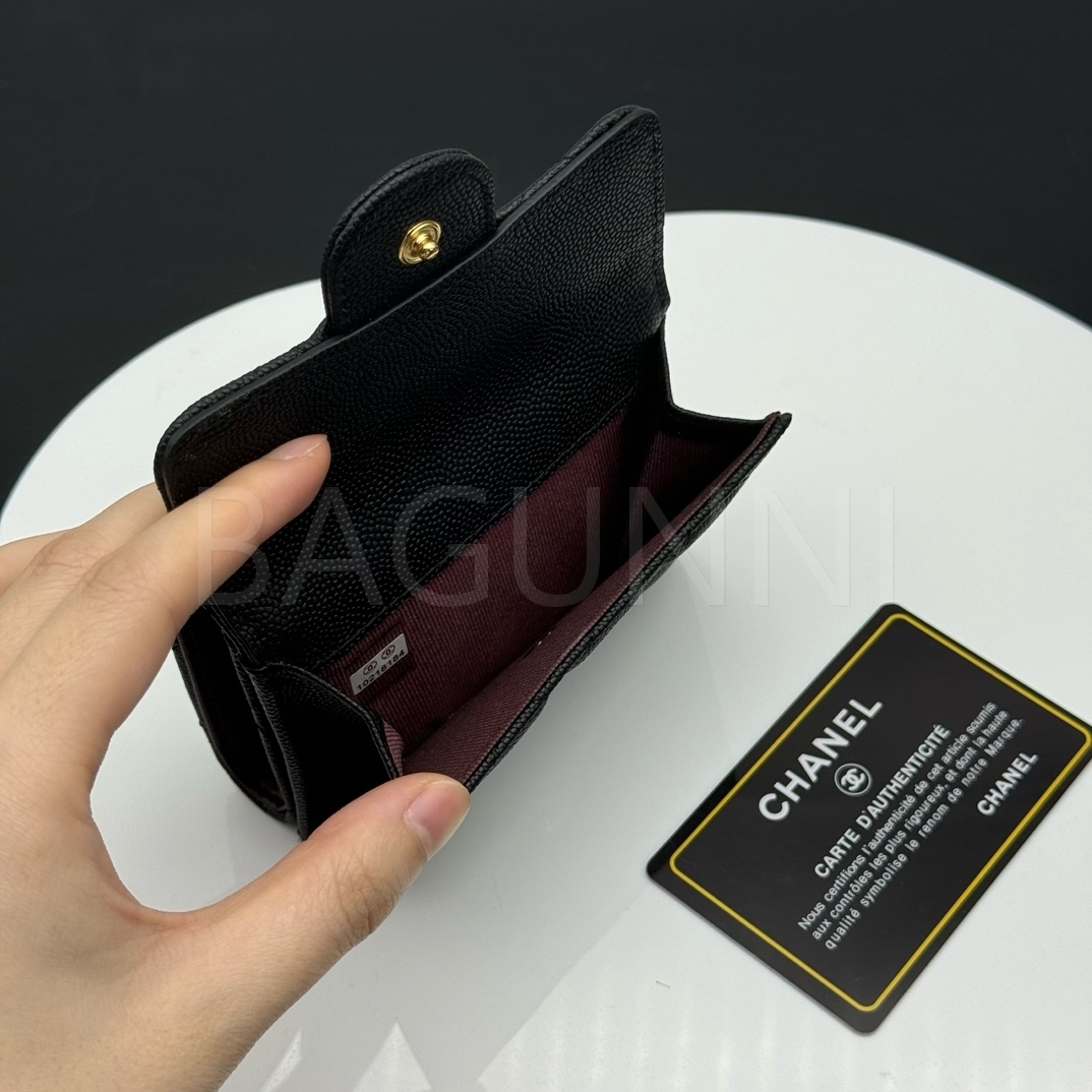 카프스킨의 질감이 돋보이는 샤넬 지갑입니다.