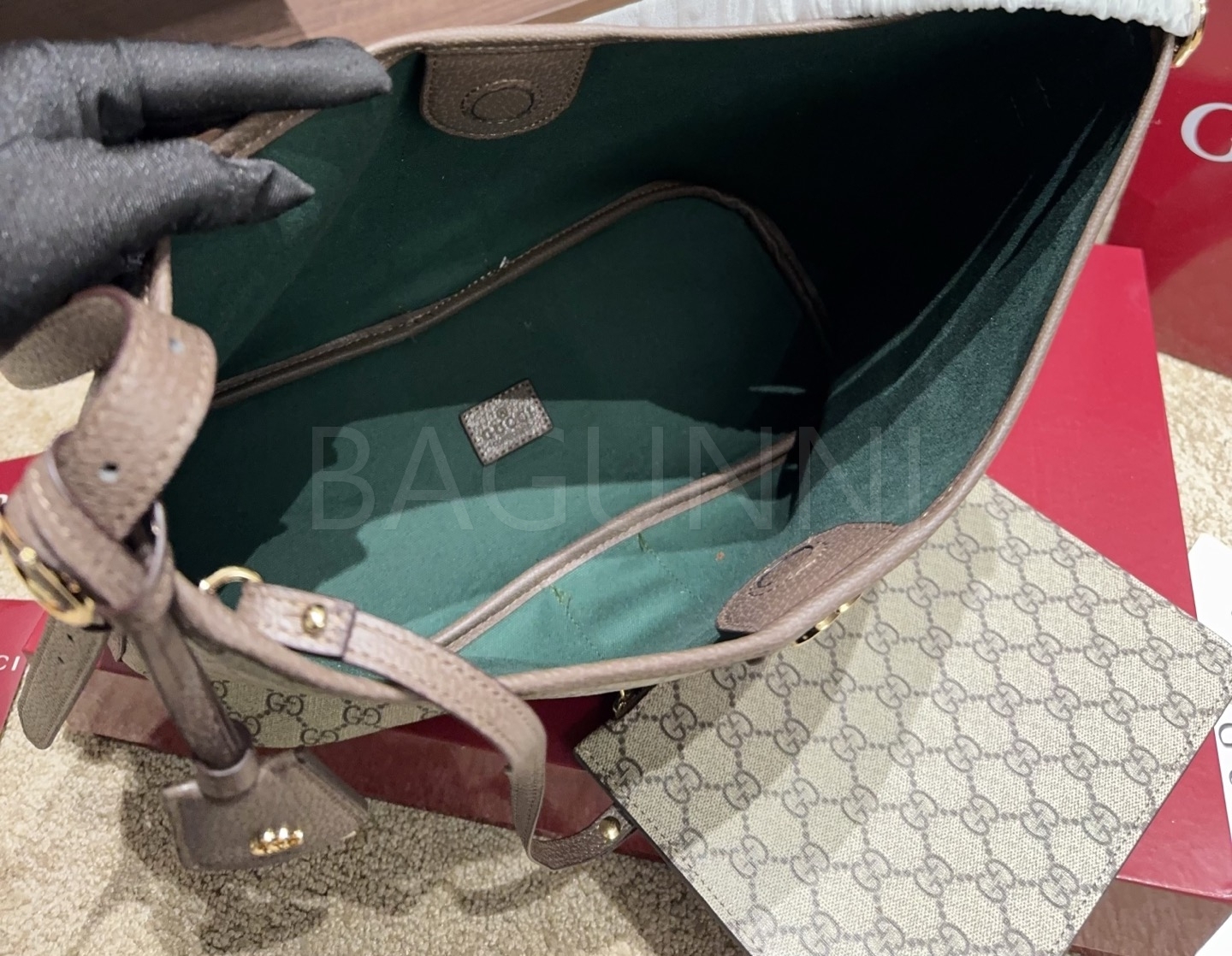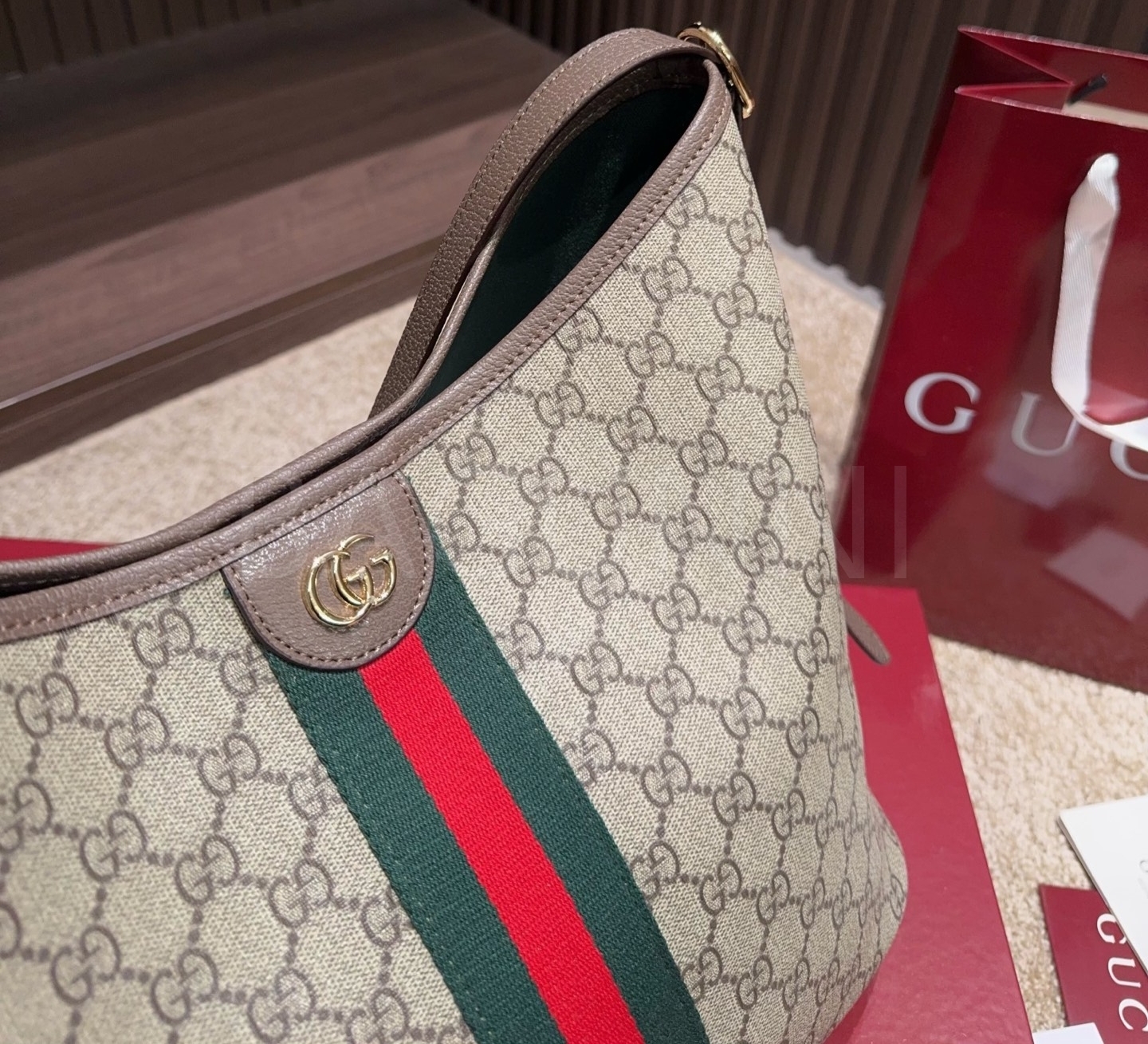 구찌 오피디아 버킷백입니다. 가죽 특유의 질감이 자연스럽게 살아 있으며 베이지 톤이 어우러져 브랜드 특유의 분위기를 편하게 즐기기 좋습니다.