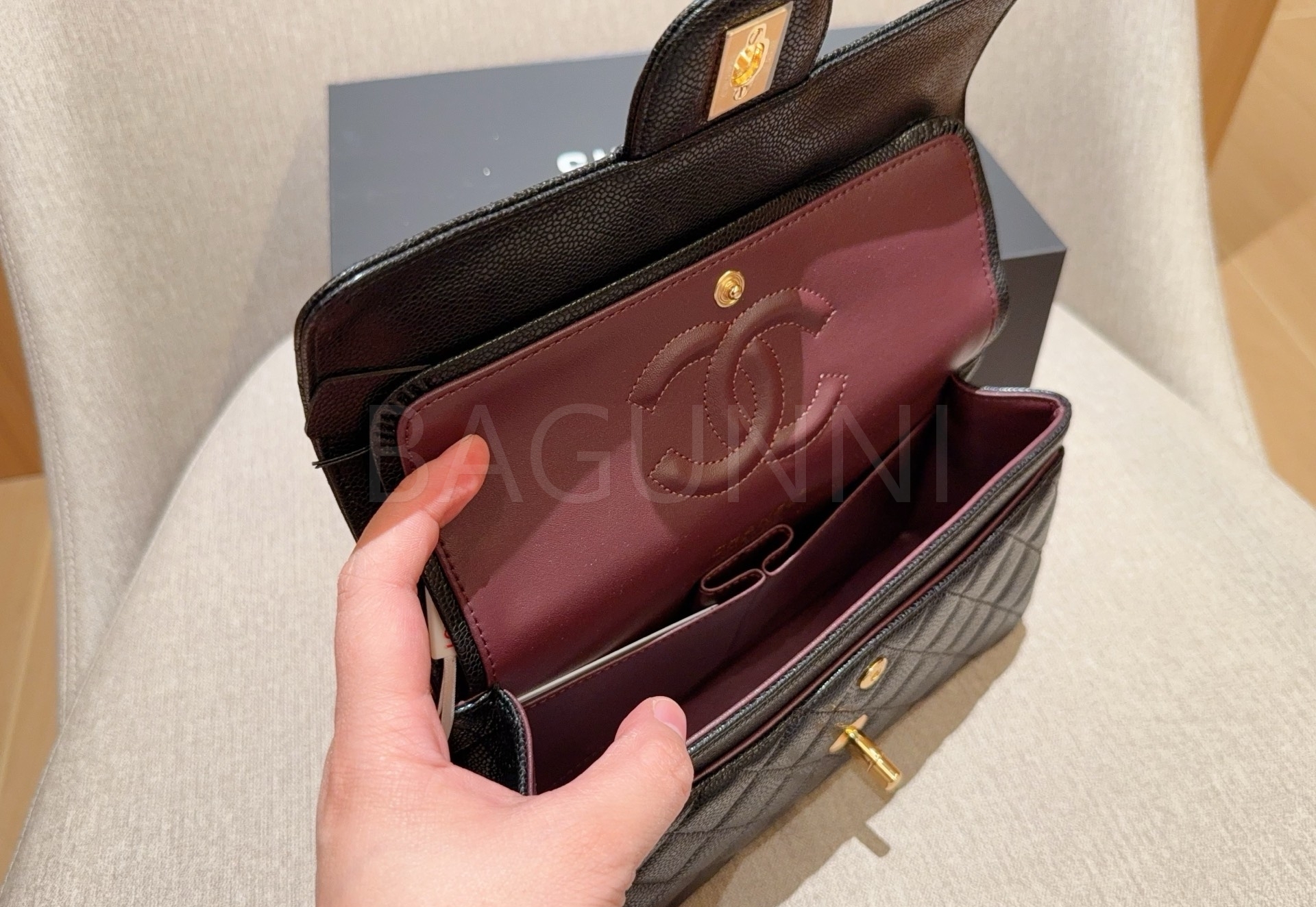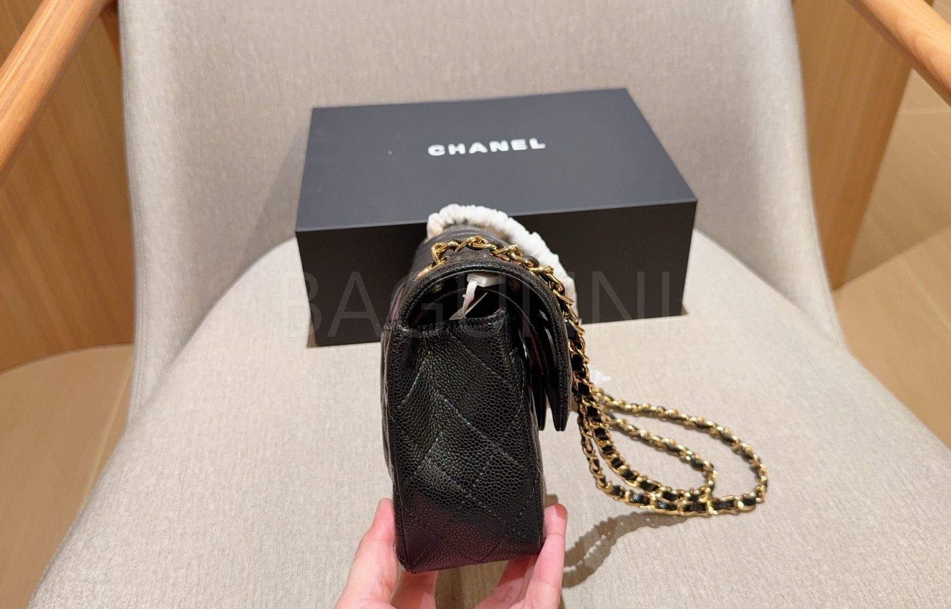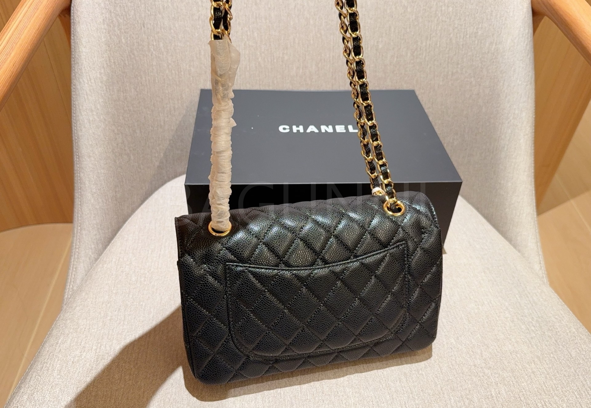 캐비어 가죽 특유의 매력이 돋보이는 샤넬 클래식 플랩 백입니다.