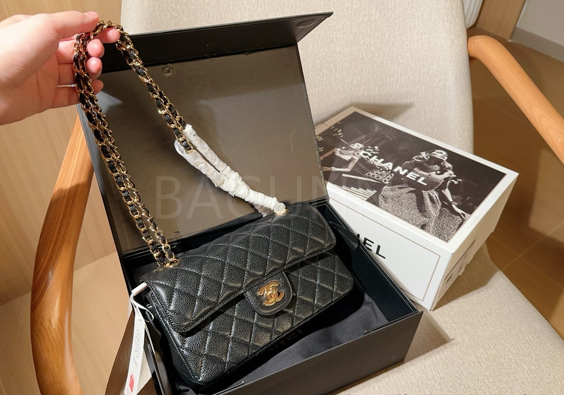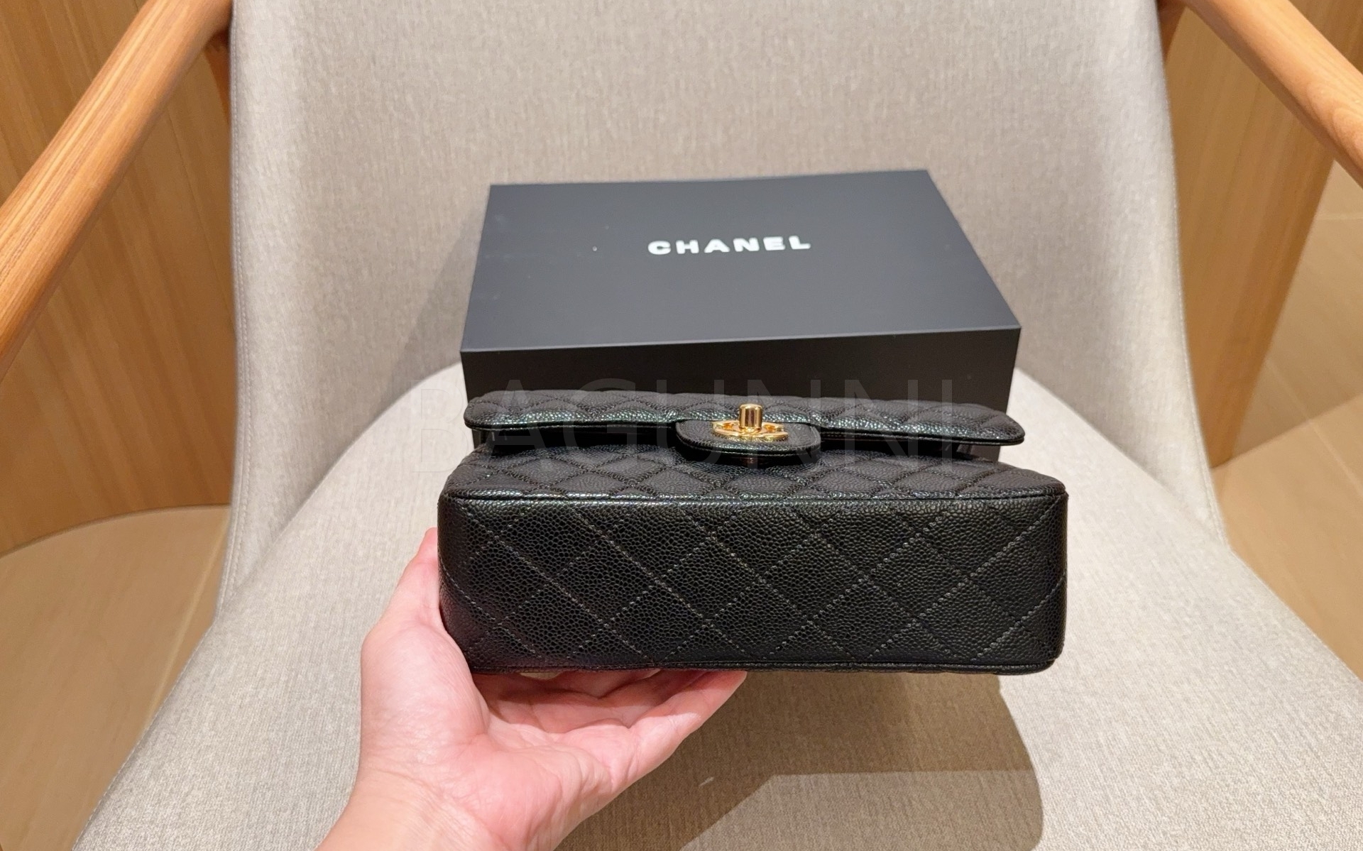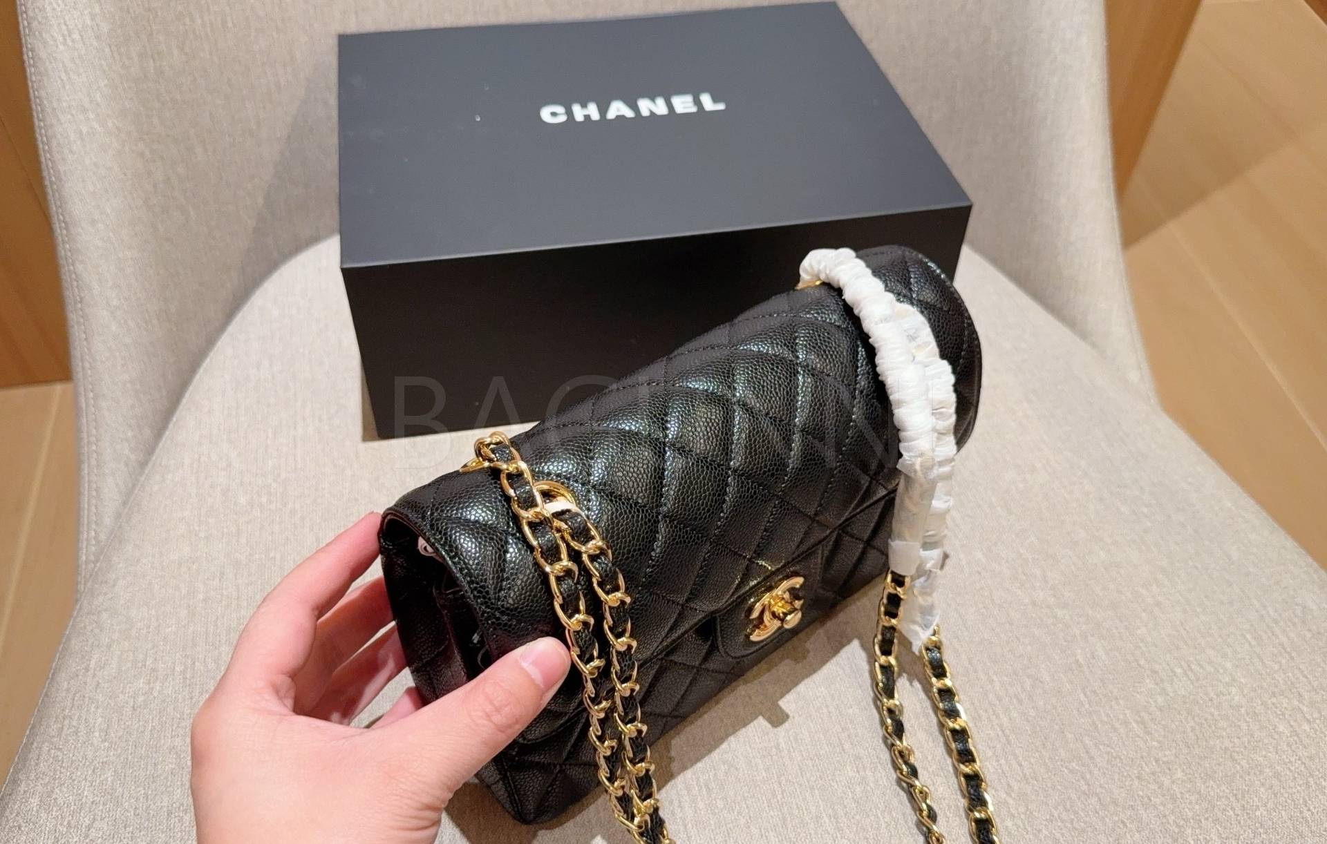 캐비어 가죽 특유의 매력이 돋보이는 샤넬 클래식 플랩 백입니다.