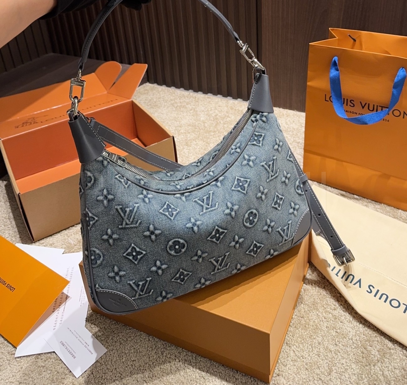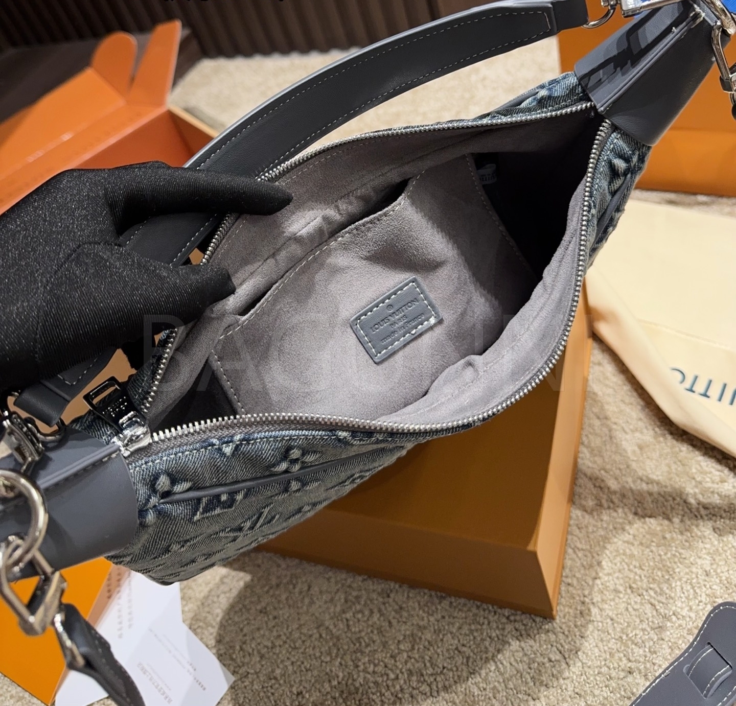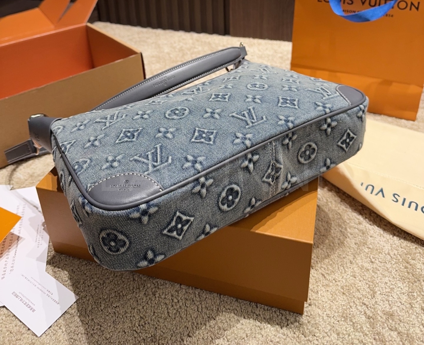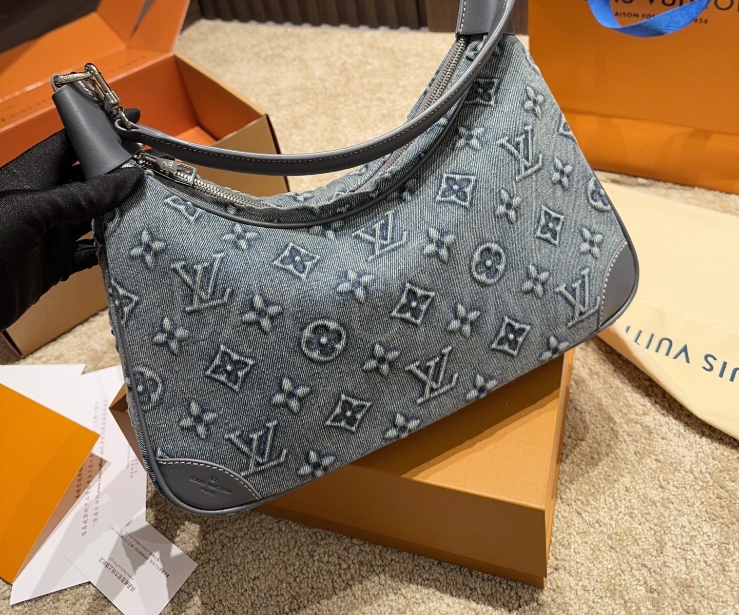 데님 특유의 캐주얼한 무드가 돋보이는 루이비통 데님 숄더백입니다.