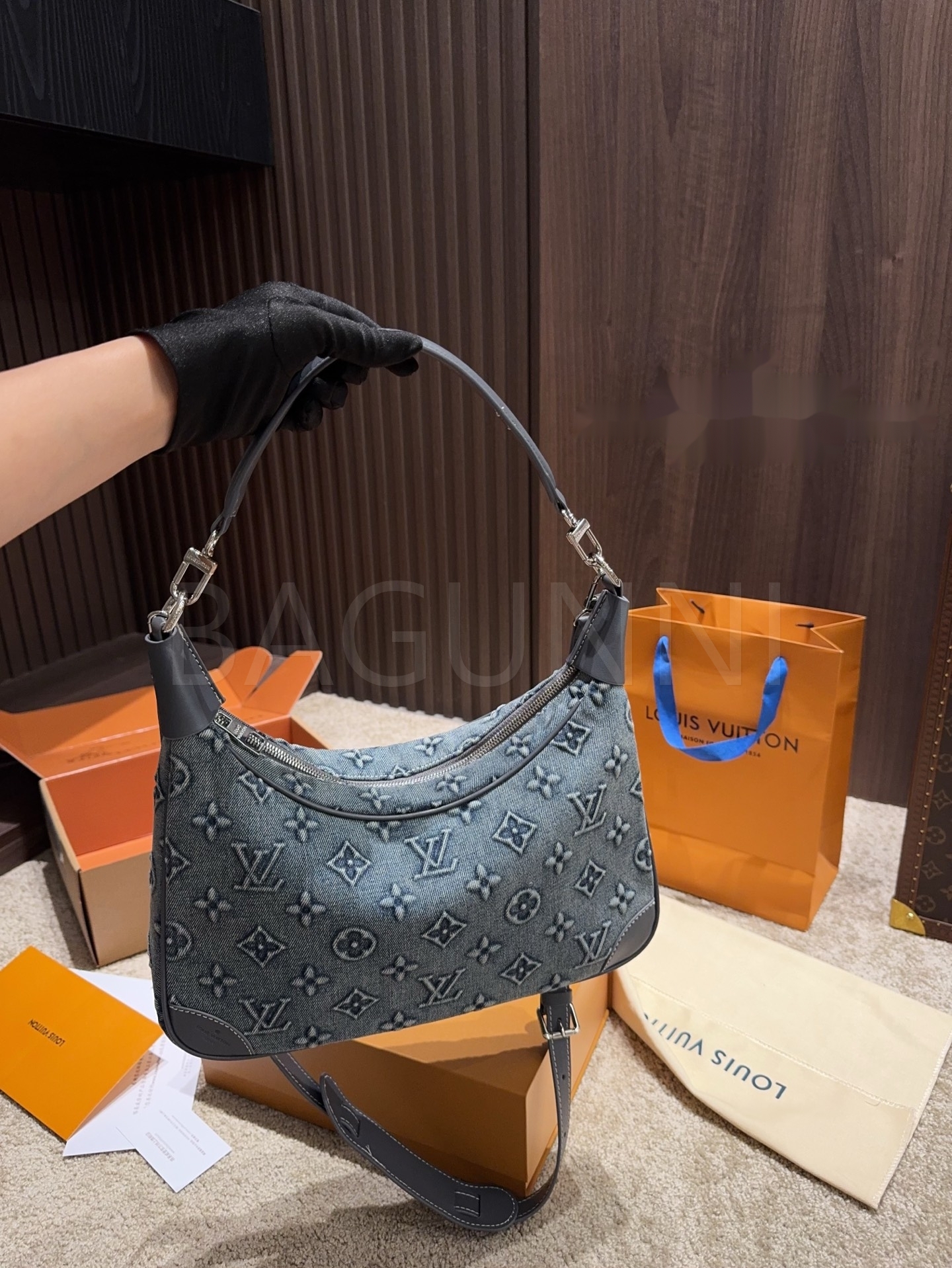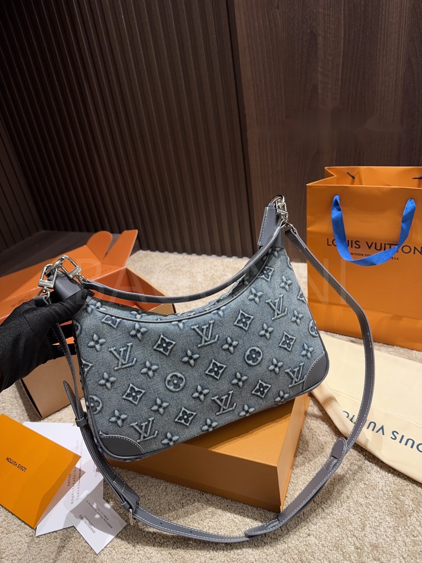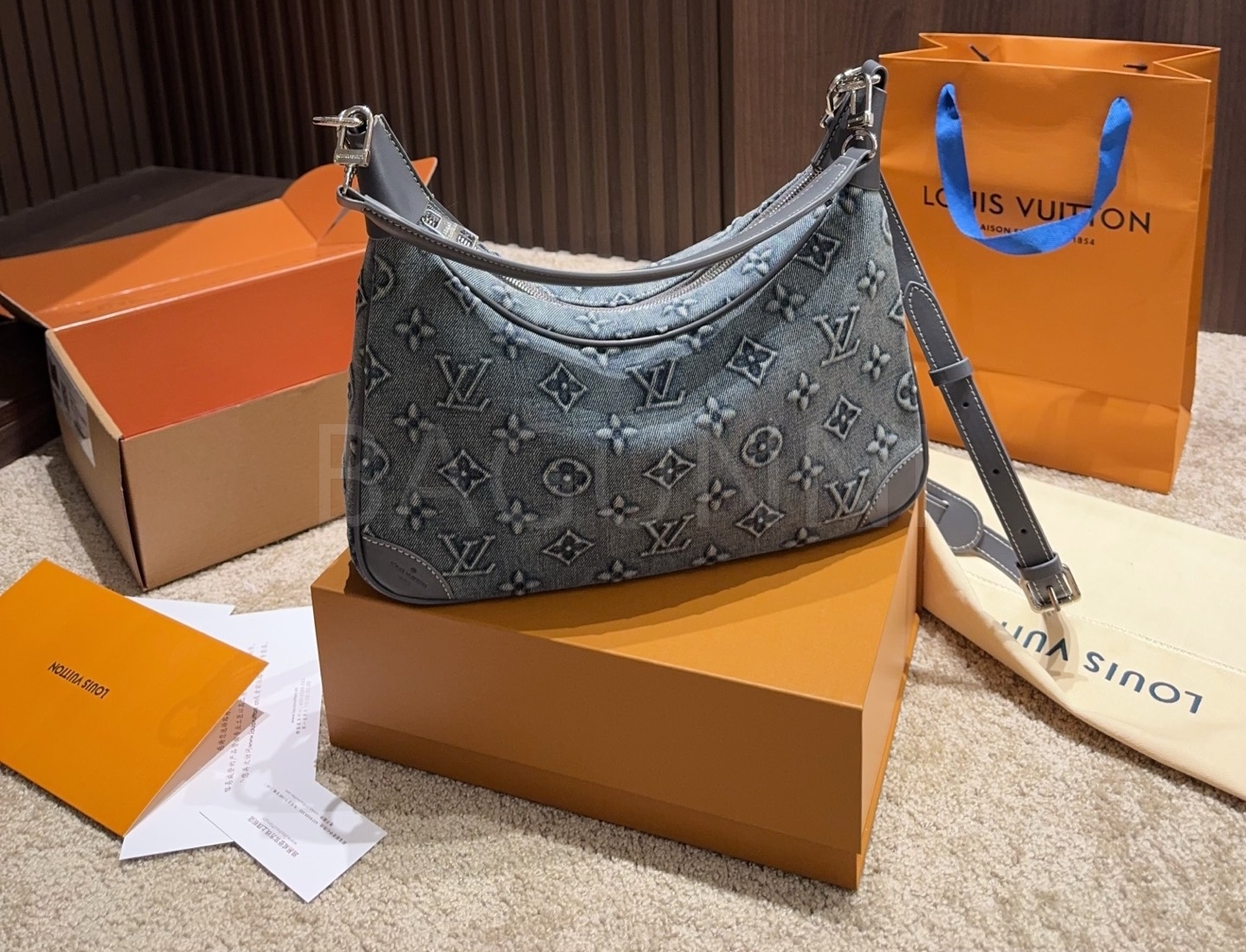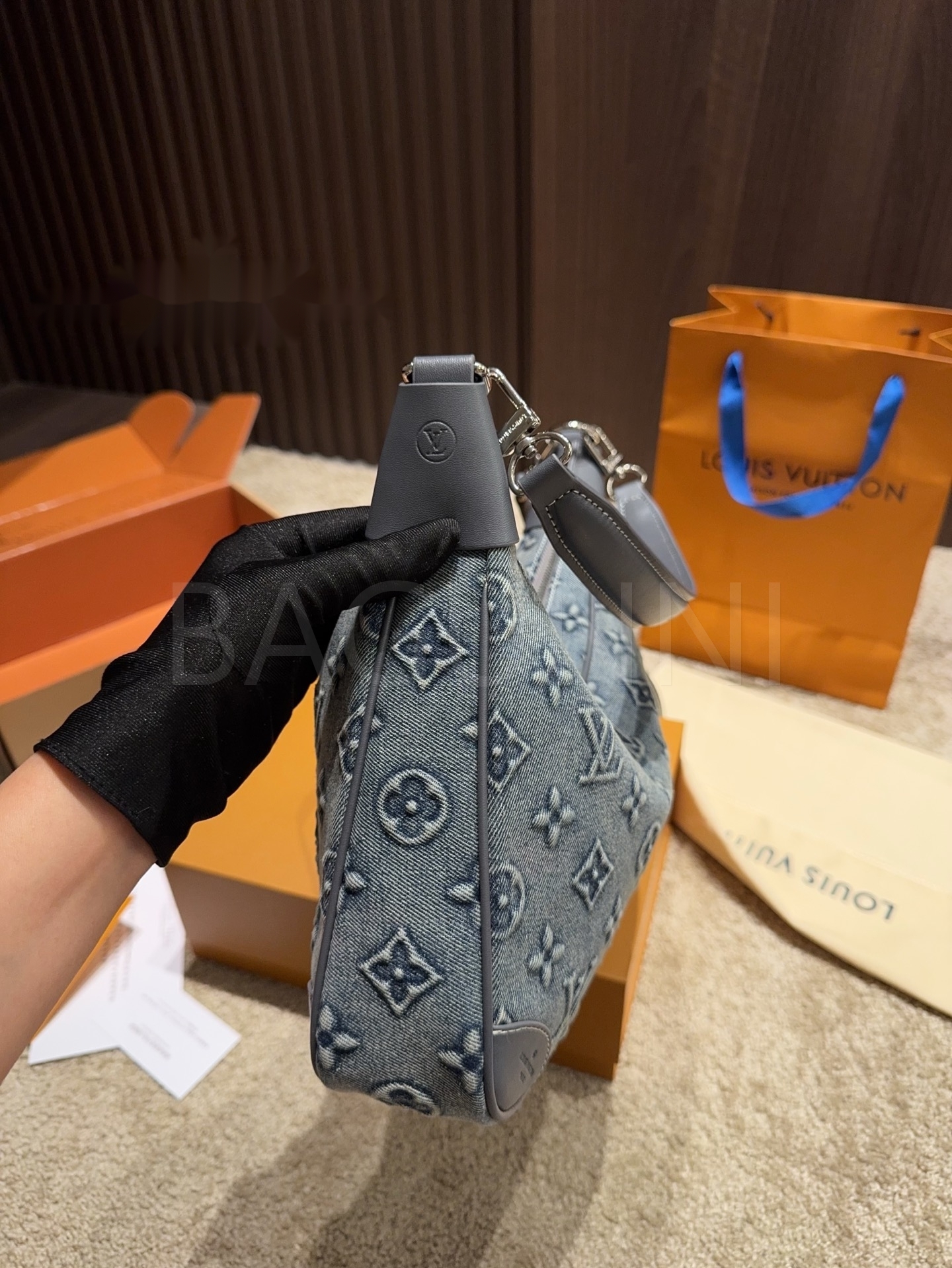 데님 특유의 캐주얼한 무드가 돋보이는 루이비통 데님 숄더백입니다.