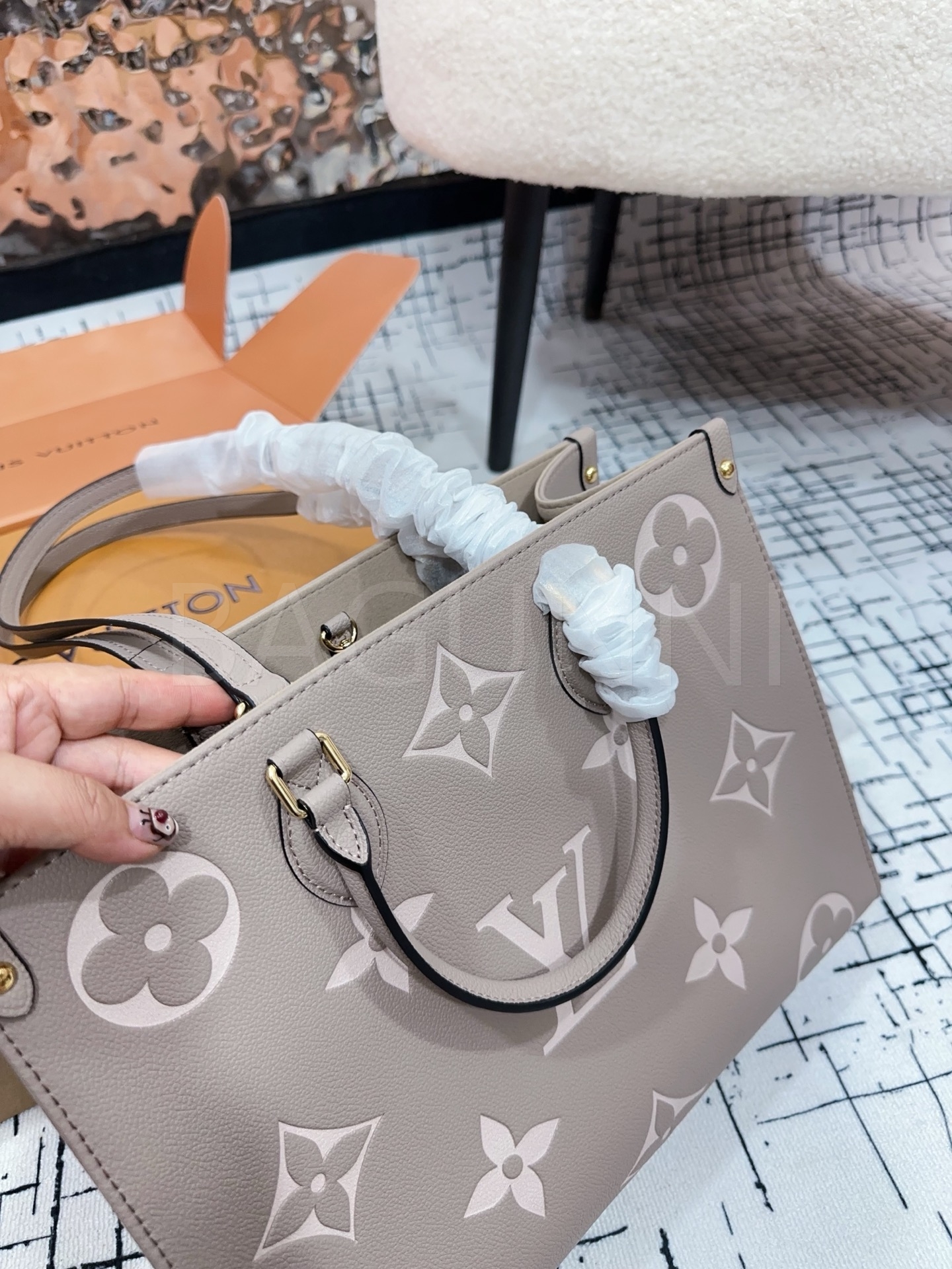 가죽 소재의 매력이 자연스럽게 살아 있는 루이비통 온더고 토트백입니다.