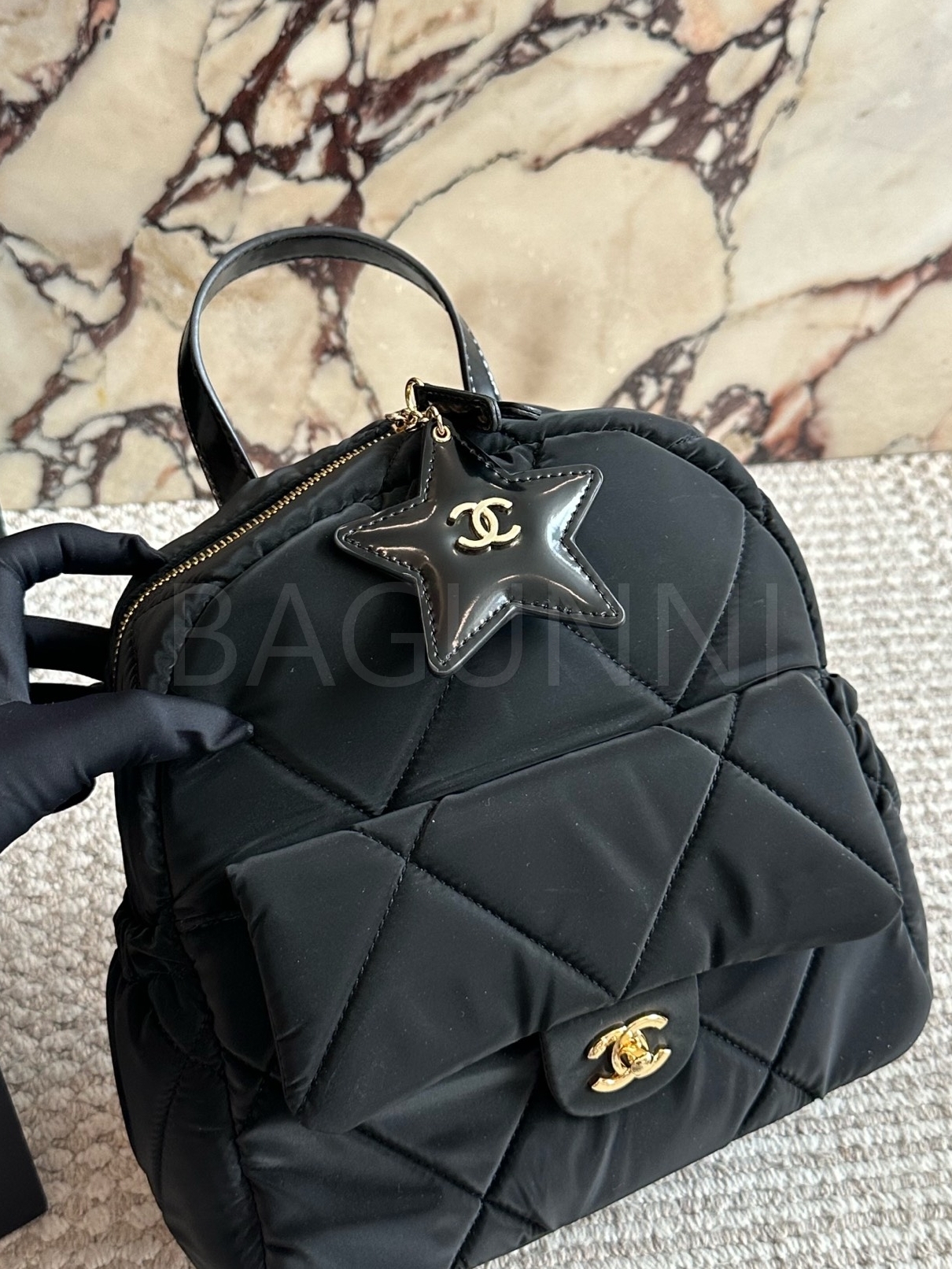 샤넬 퀼팅 스타 참 백팩은 세련된 실루엣을 담은 아이템입니다.