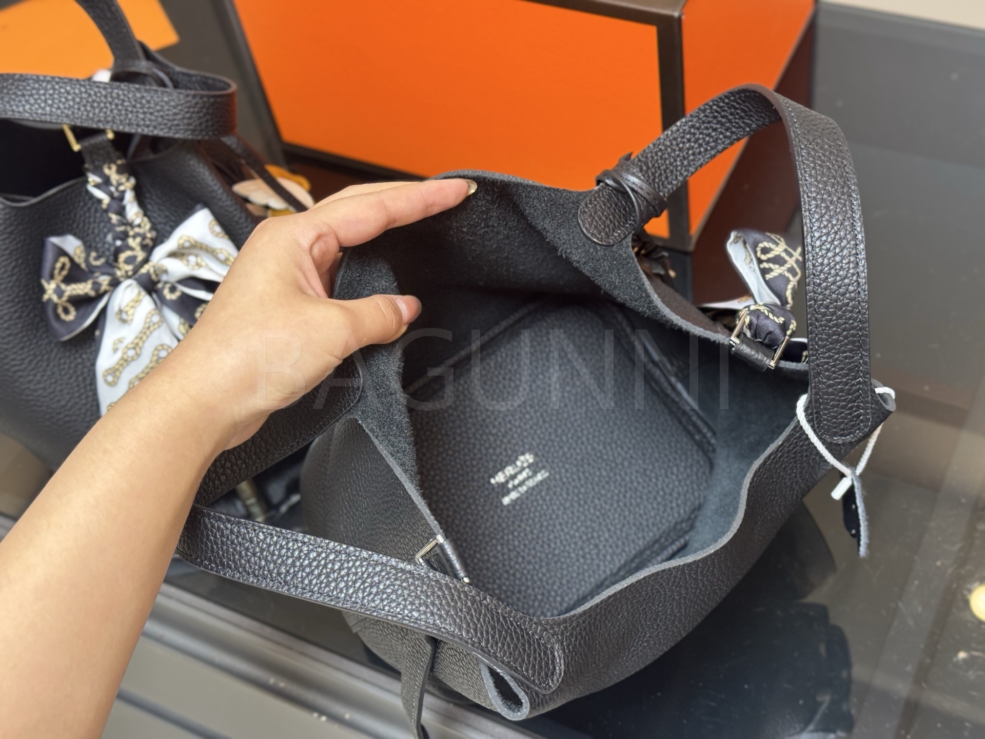 에르메스 피코탄 락 버킷백입니다. 가죽 특유의 질감이 자연스럽게 살아 있으며 브랜드 특유의 분위기를 편하게 즐기기 좋습니다.