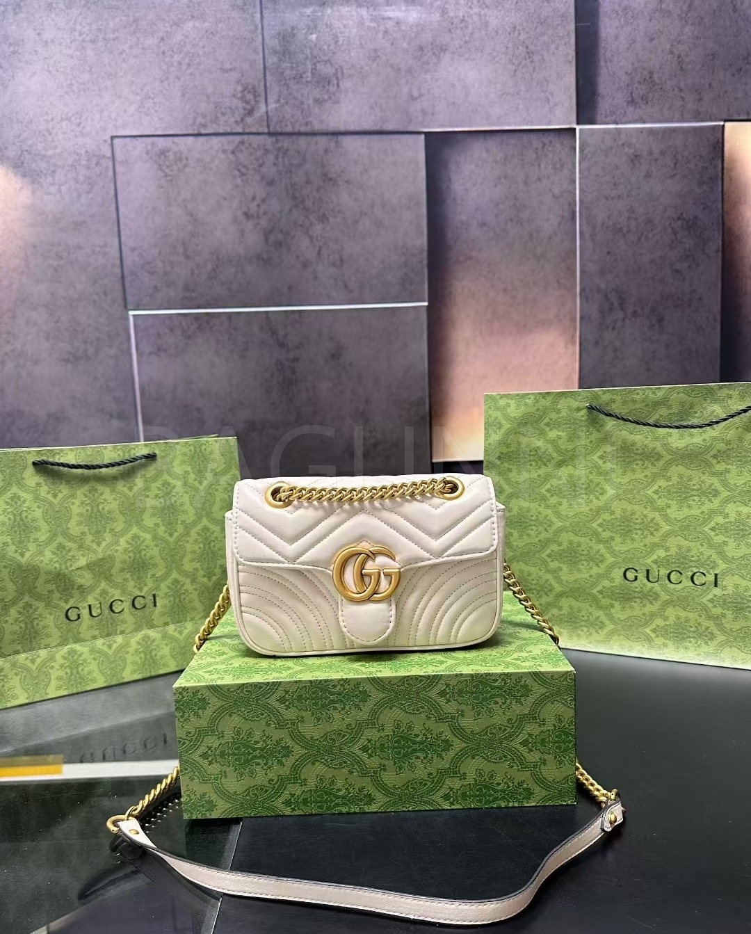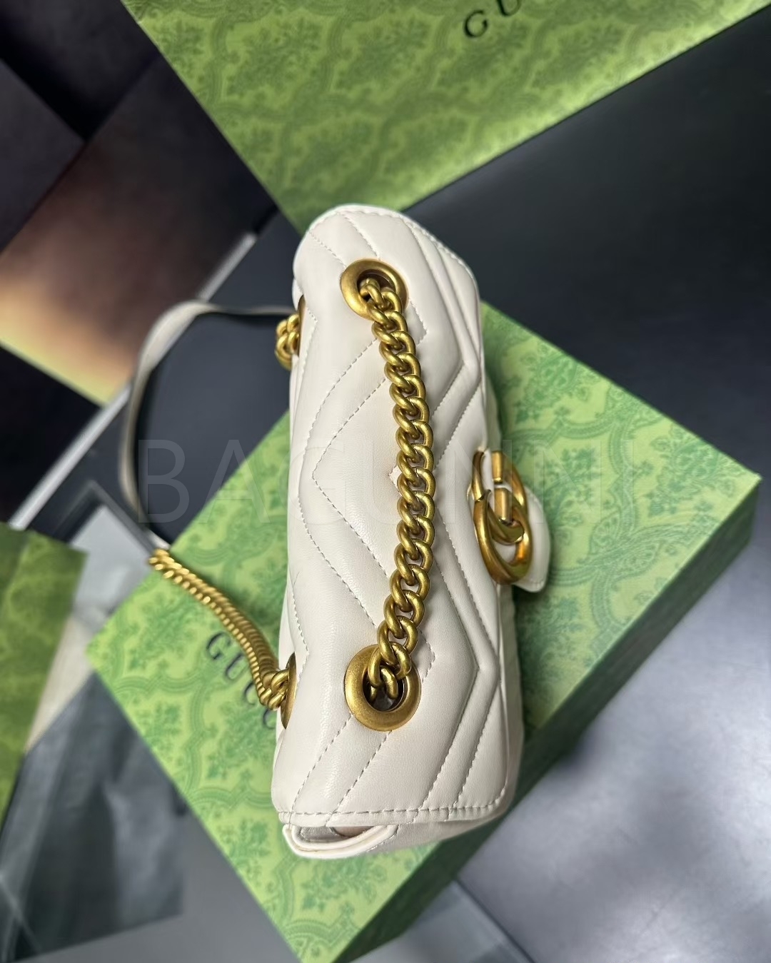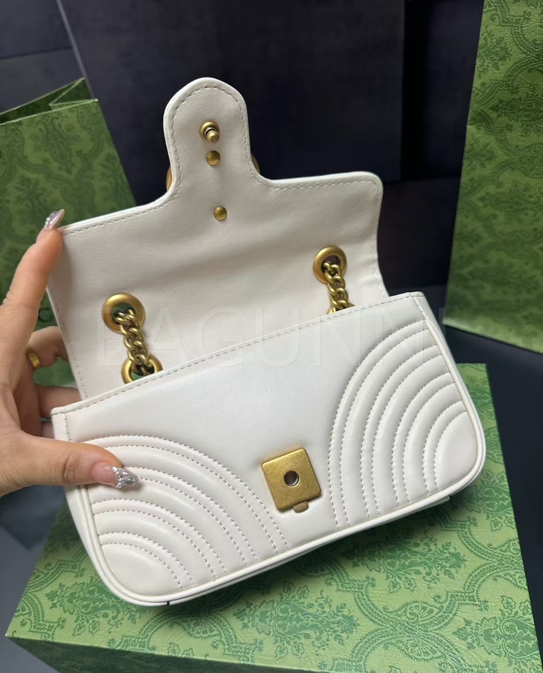구찌 마몬트 체인백입니다. 가죽 특유의 질감이 자연스럽게 살아 있으며 화이트, 골드 톤이 어우러져 브랜드 특유의 분위기를 편하게 즐기기 좋습니다.