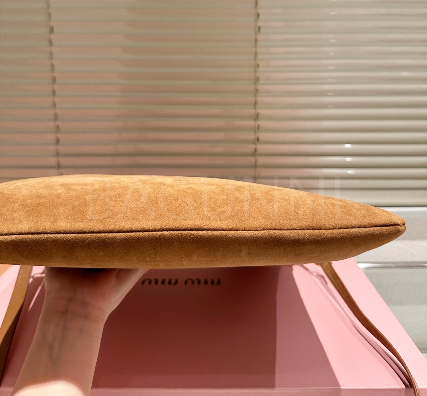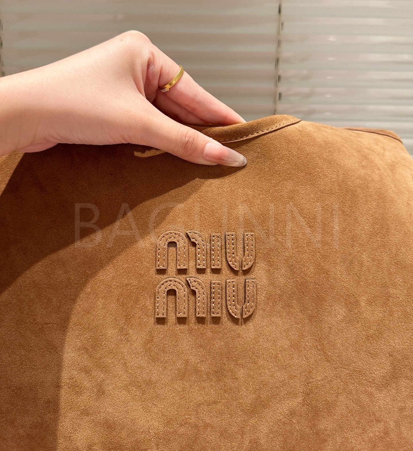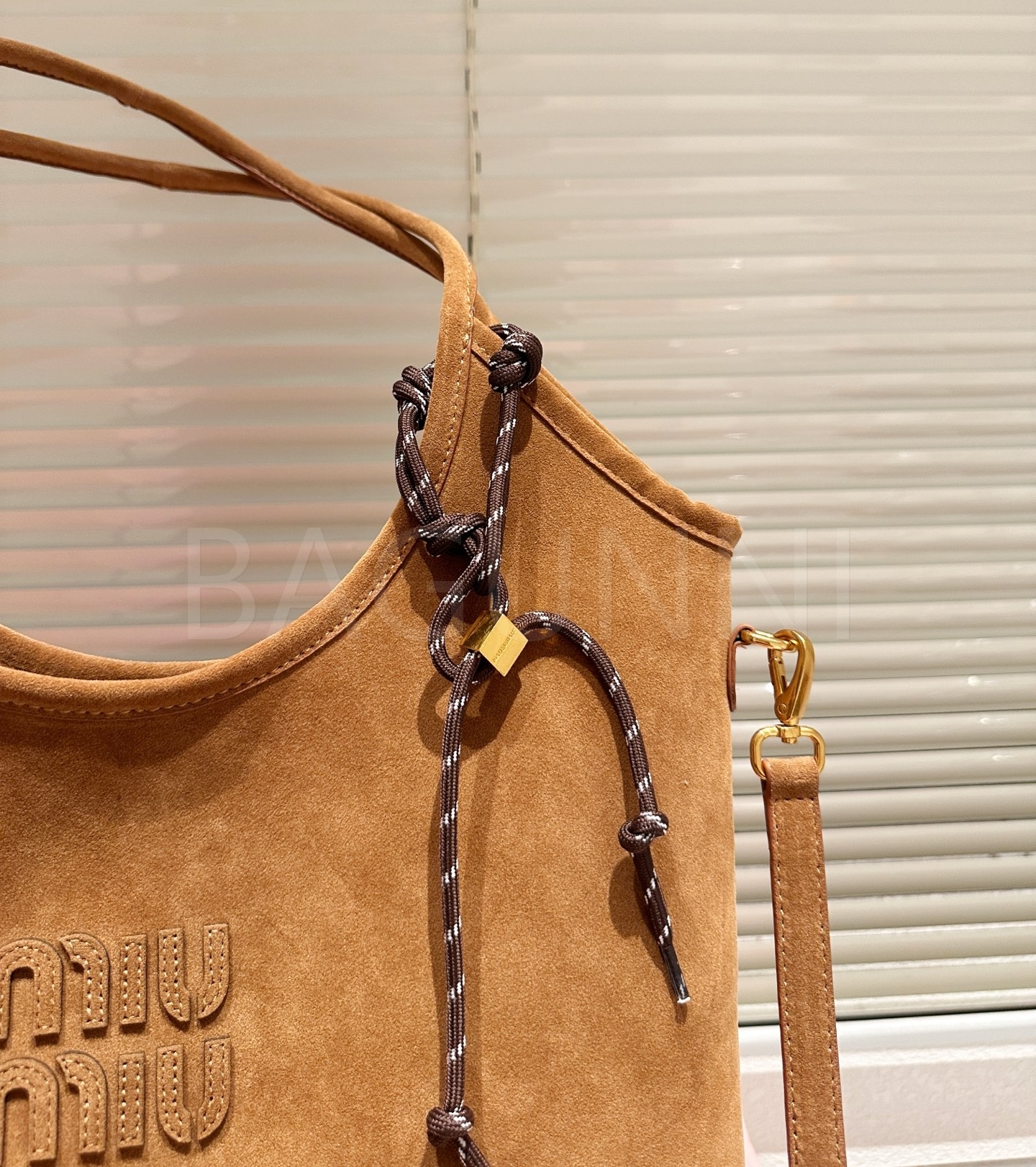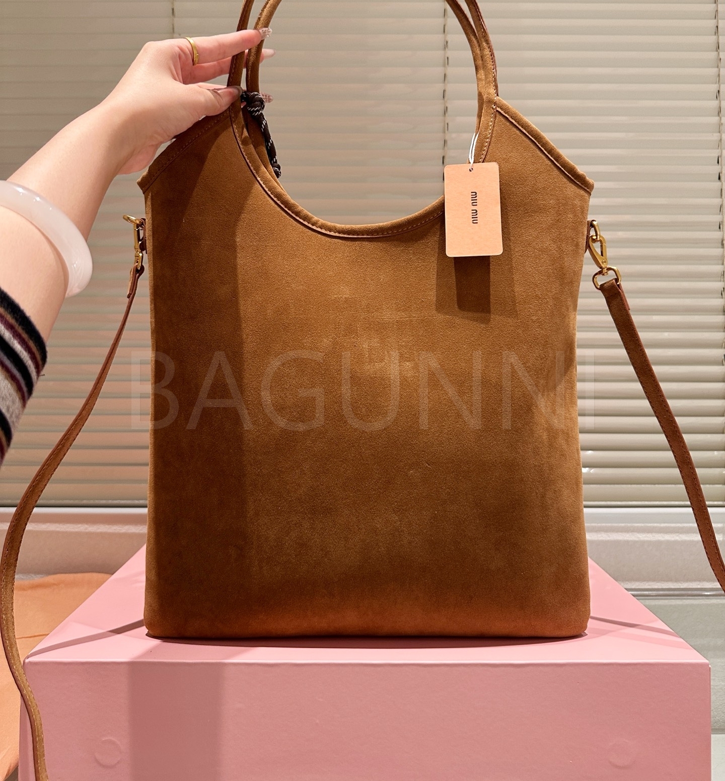 미우미우 스웨이드 토트백입니다. 스웨이드 특유의 질감이 자연스럽게 살아 있으며 브랜드 특유의 분위기를 편하게 즐기기 좋습니다.
