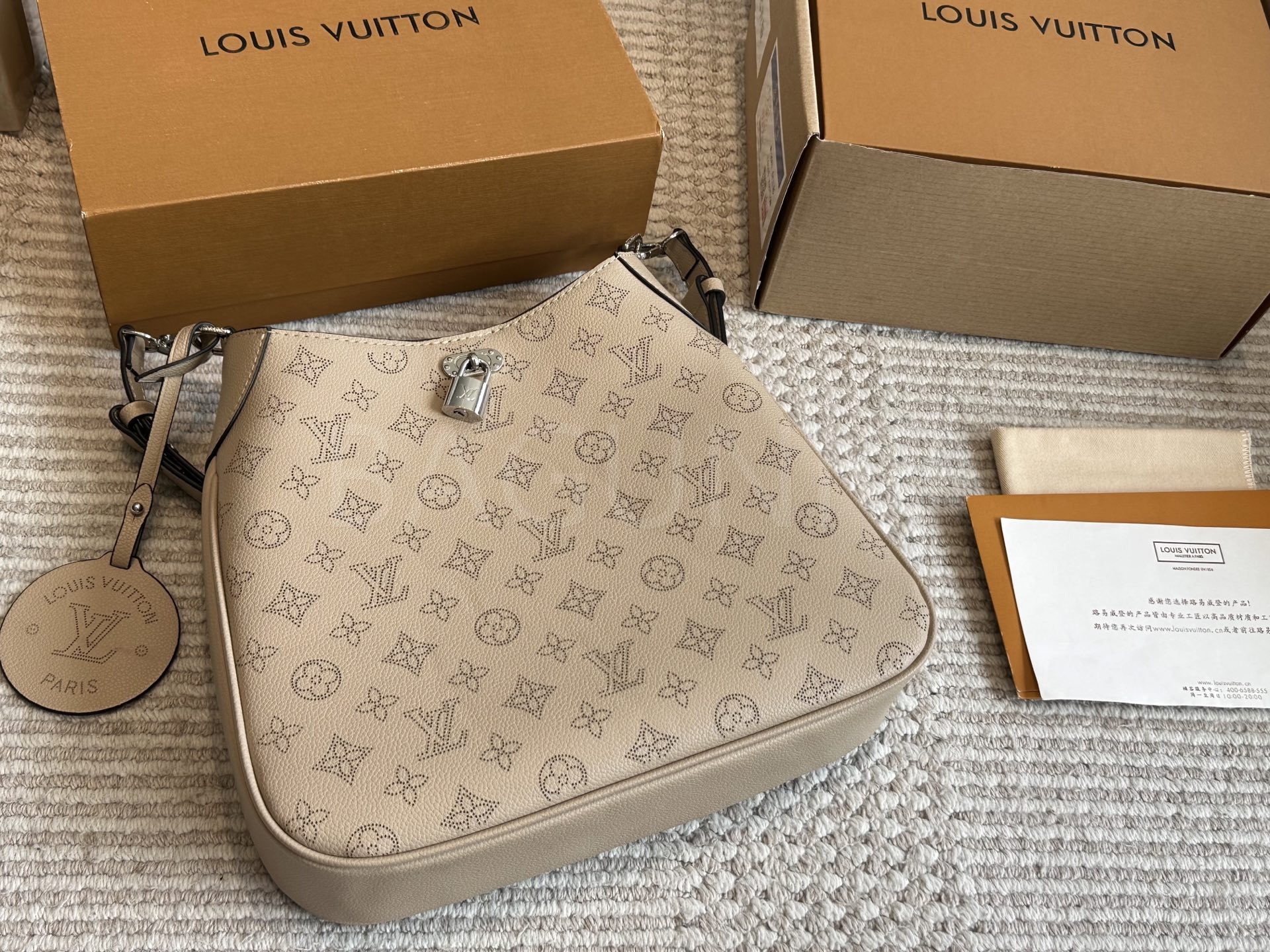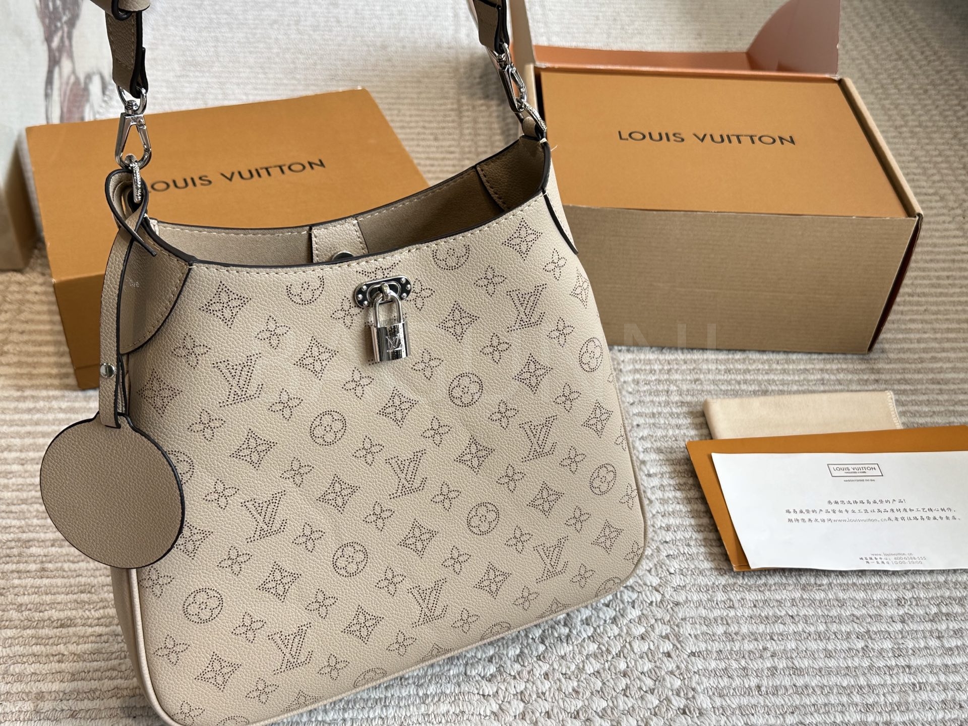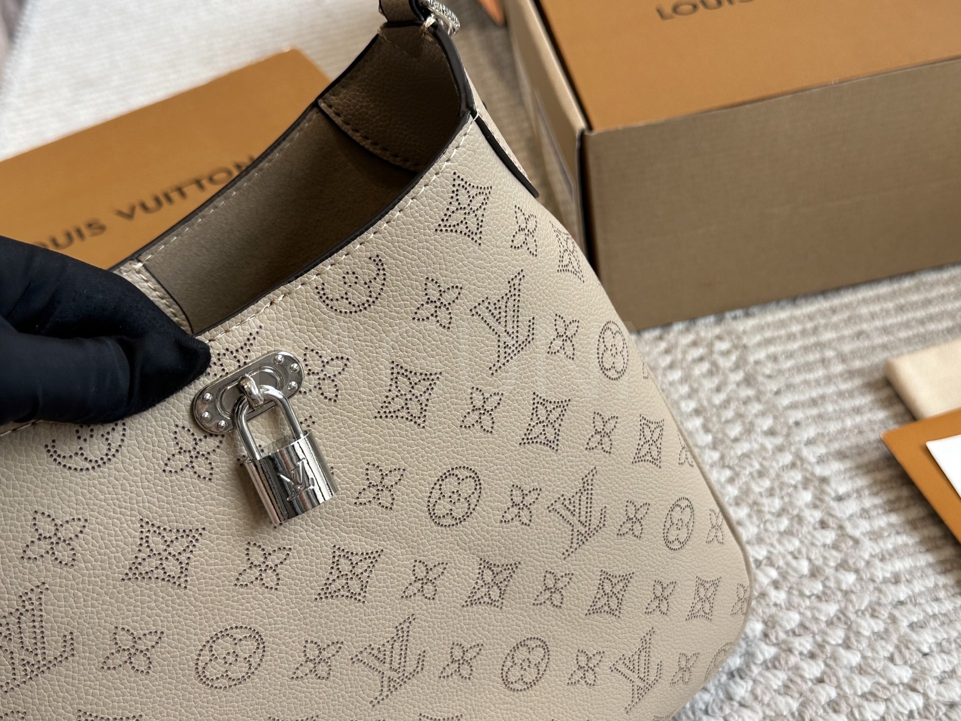 가죽 소재의 매력이 자연스럽게 살아 있는 루이비통 노에 버킷 백입니다.