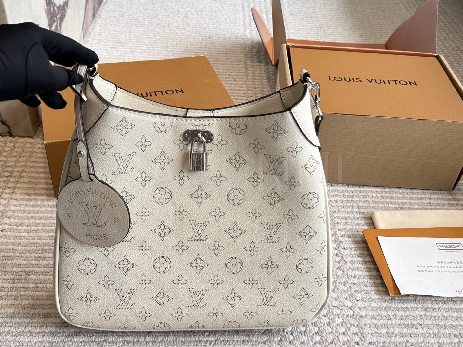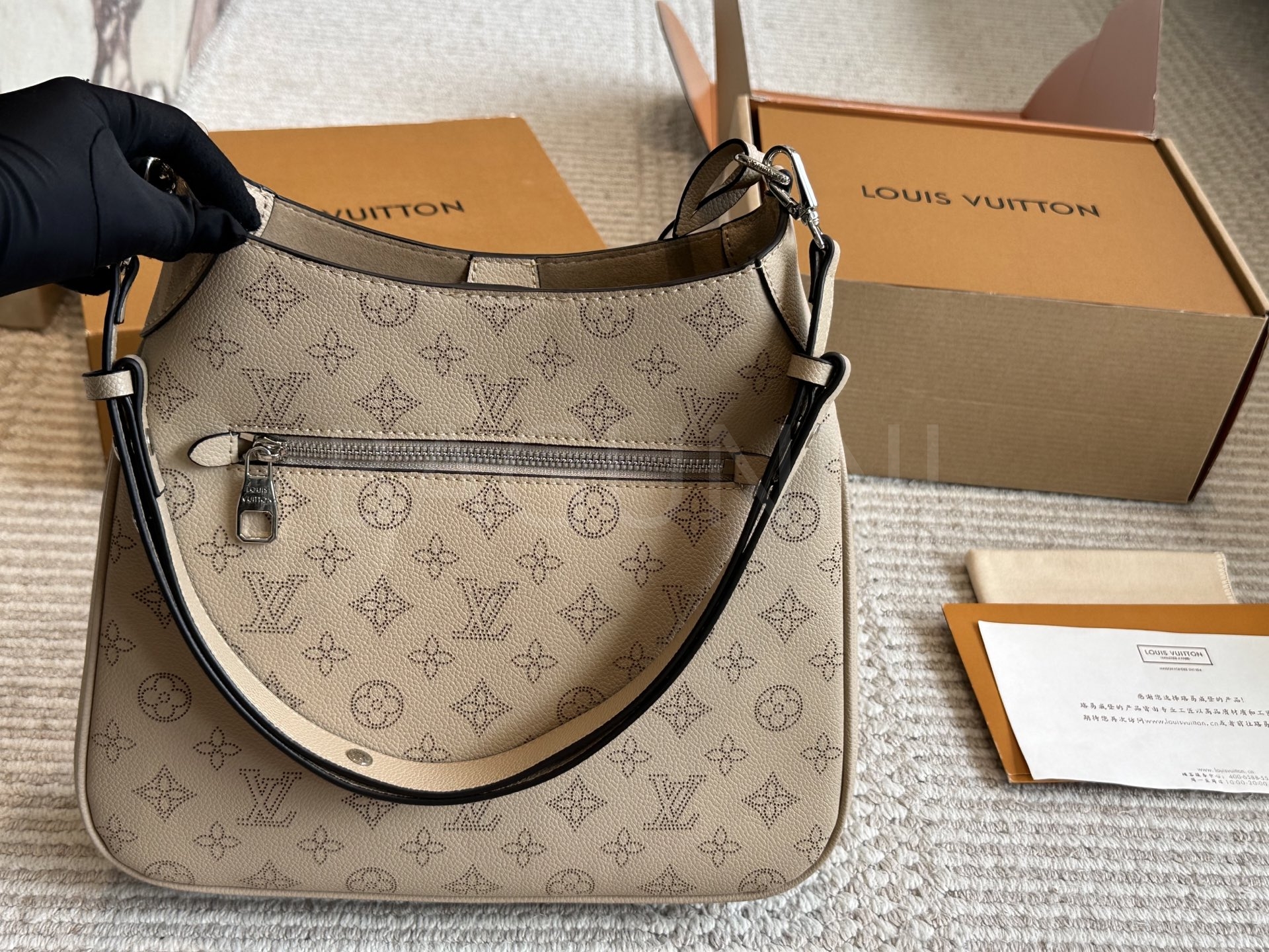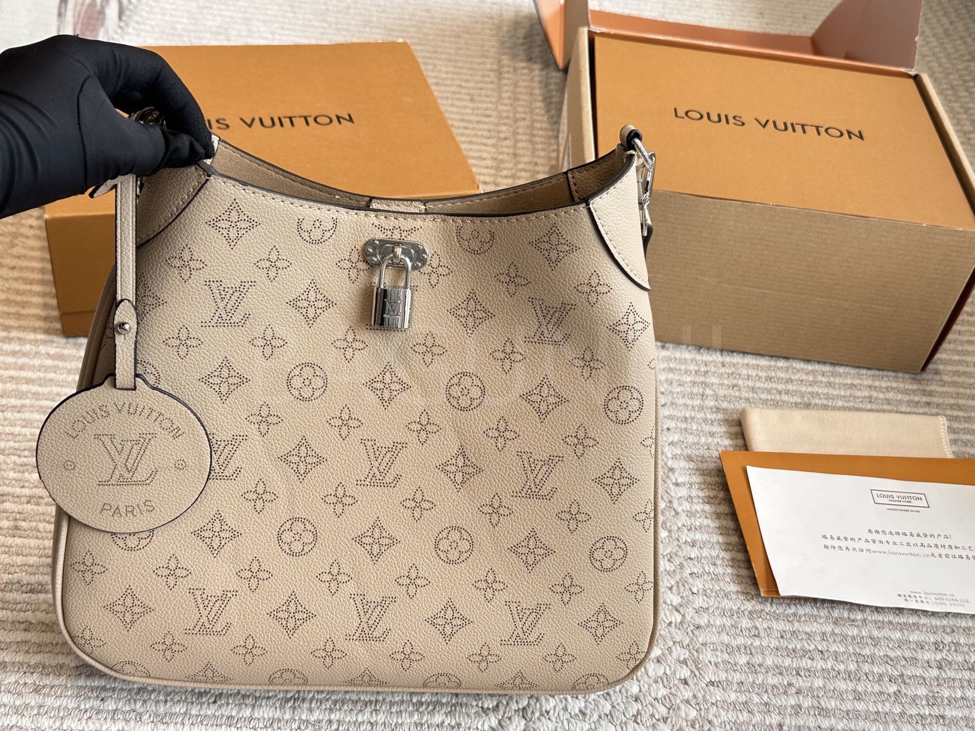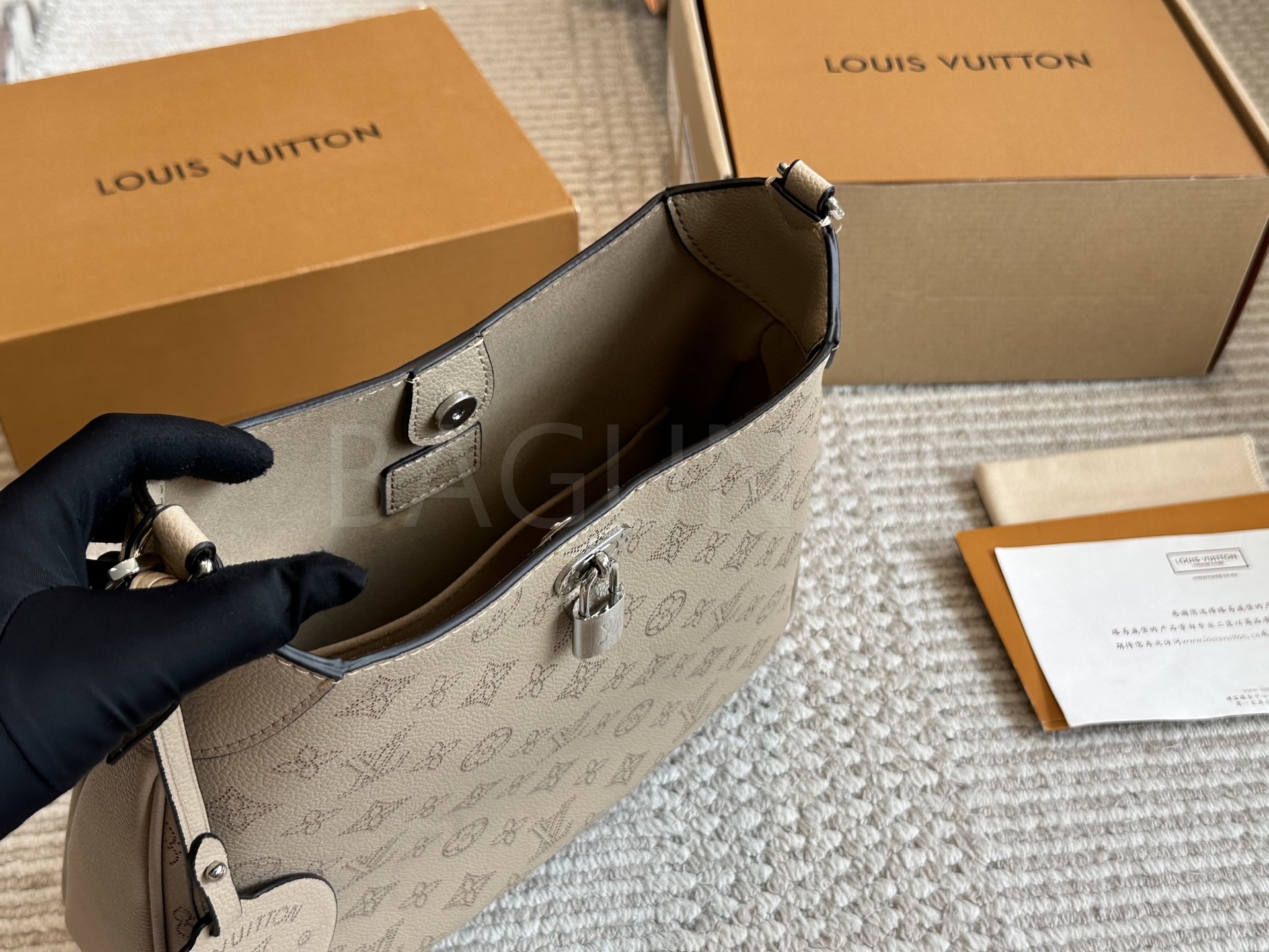 가죽 소재의 매력이 자연스럽게 살아 있는 루이비통 노에 버킷 백입니다.