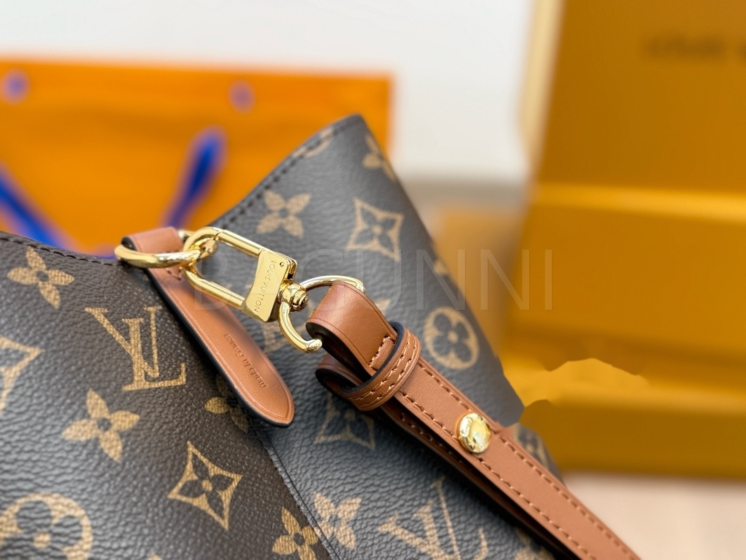 모노그램 패턴, 버킷 실루엣, 여유 있는 수납력 디테일이 조화롭게 어우러져 완성도를 높여줍니다 필수 소지품을 여유 있게 수납하기 좋습니다