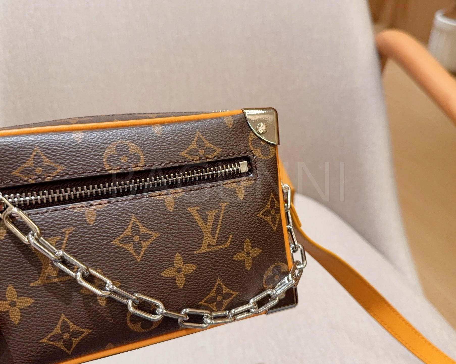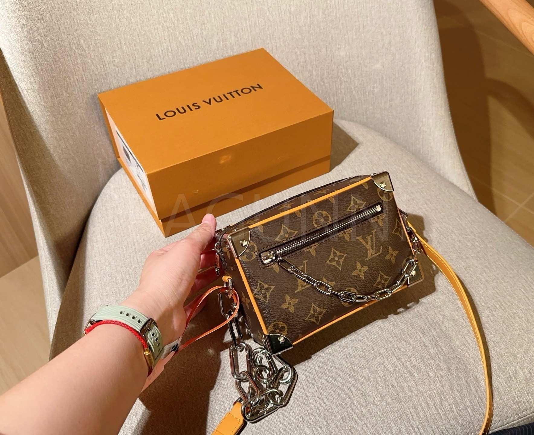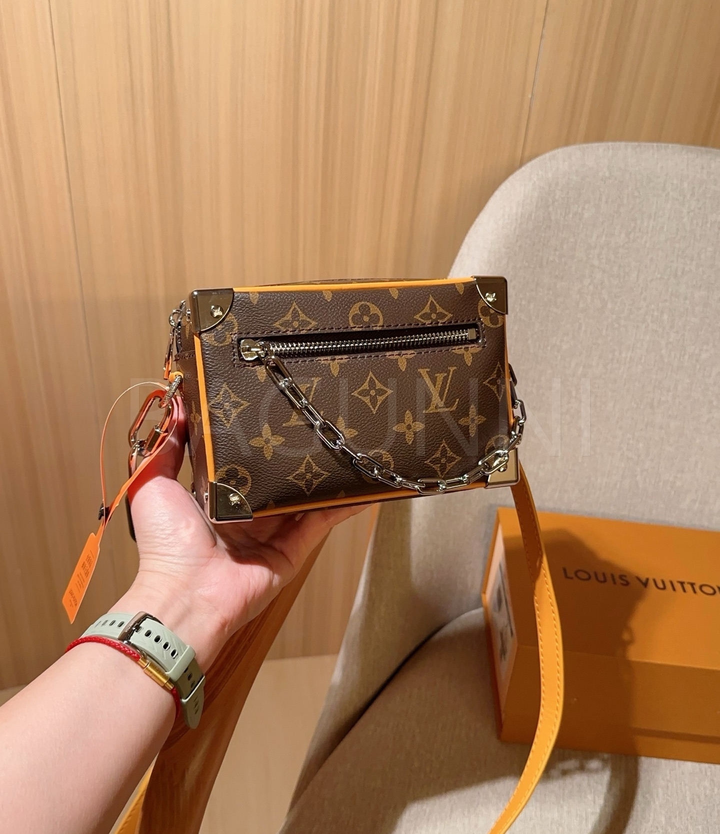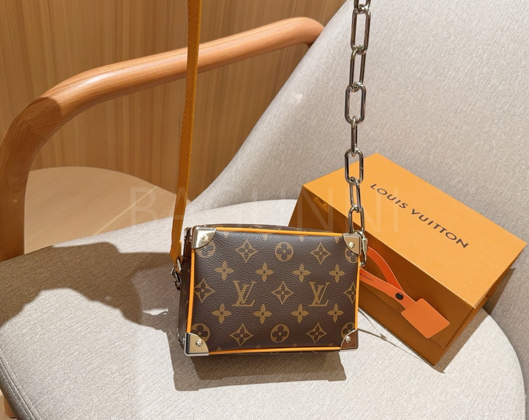 체인 스트랩, 박스 실루엣 디테일이 조화롭게 어우러져 완성도를 높여줍니다