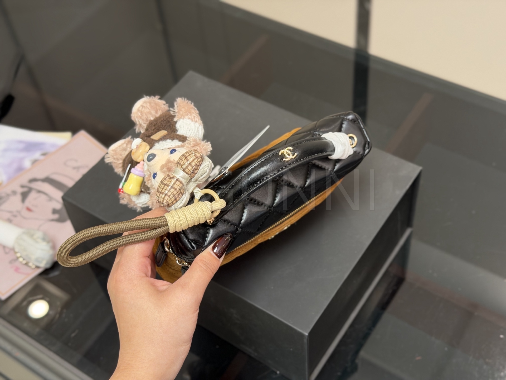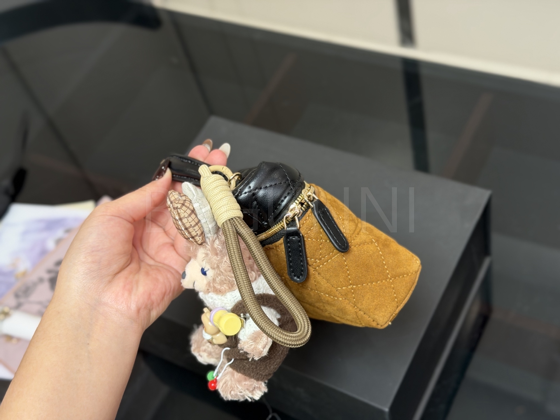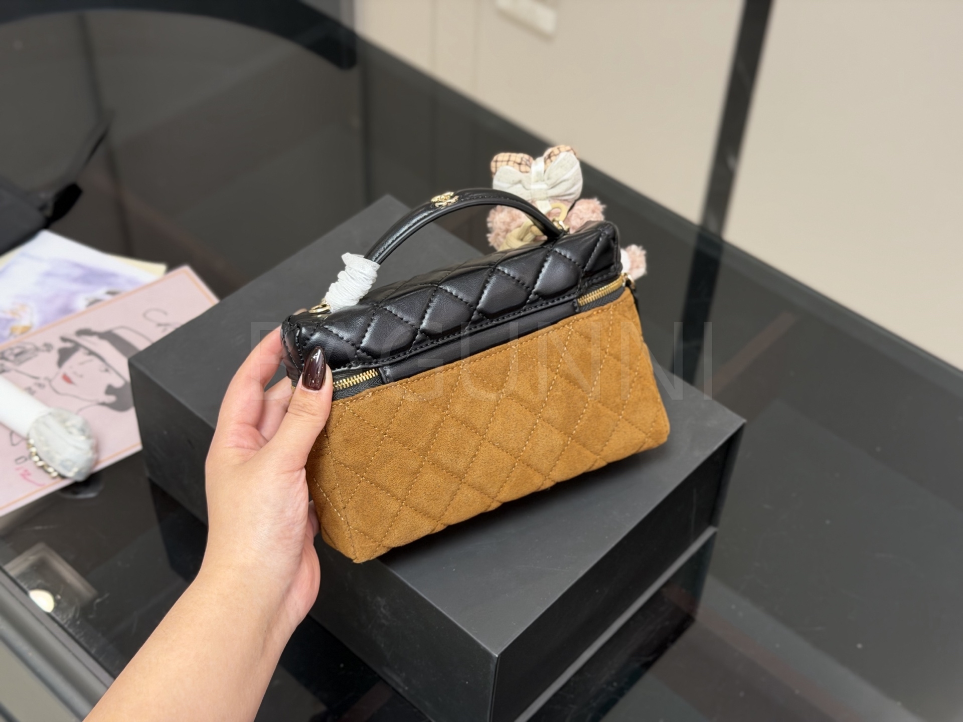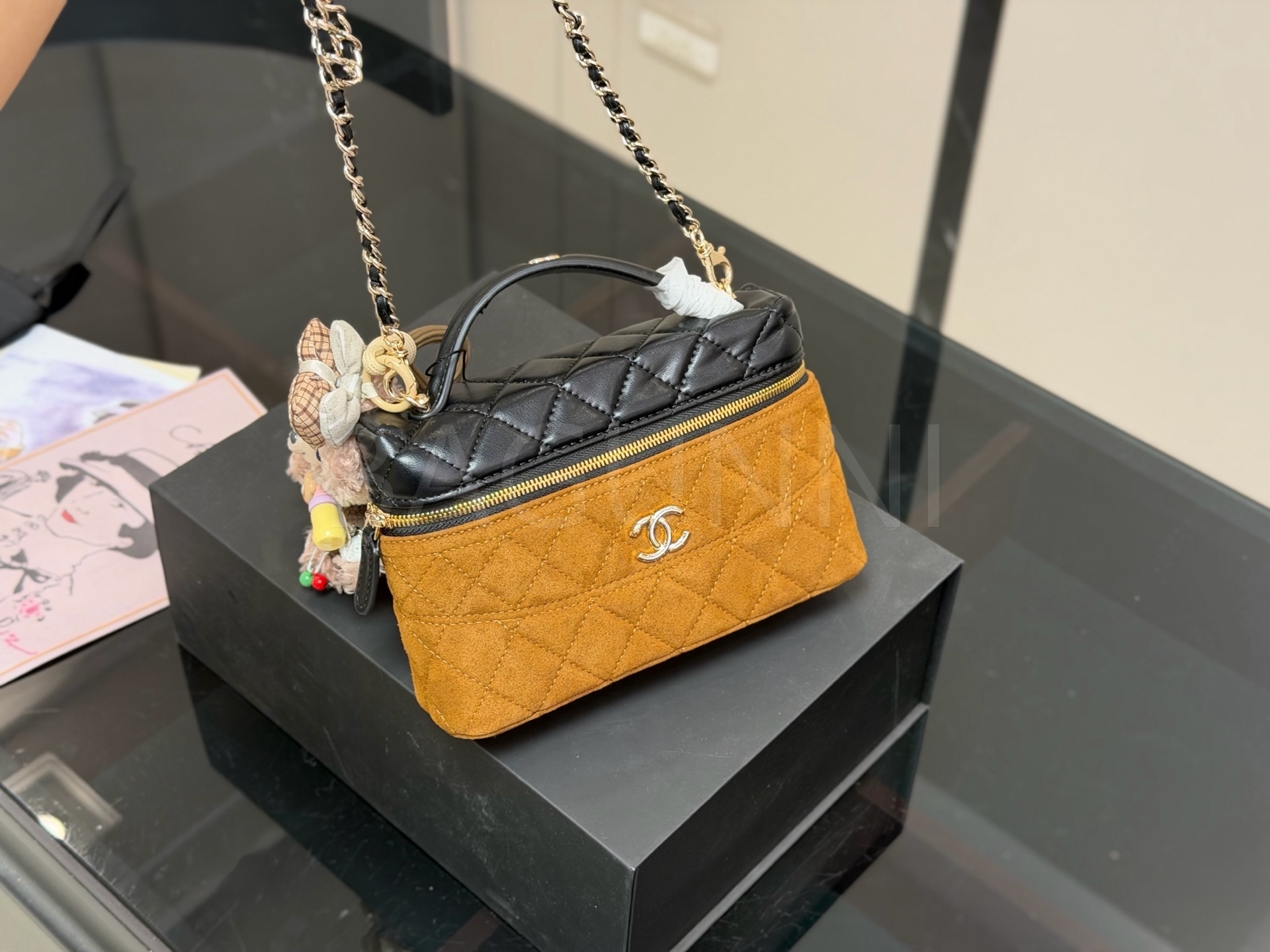 스웨이드 특유의 매력이 돋보이는 샤넬 박스 체인 백입니다.