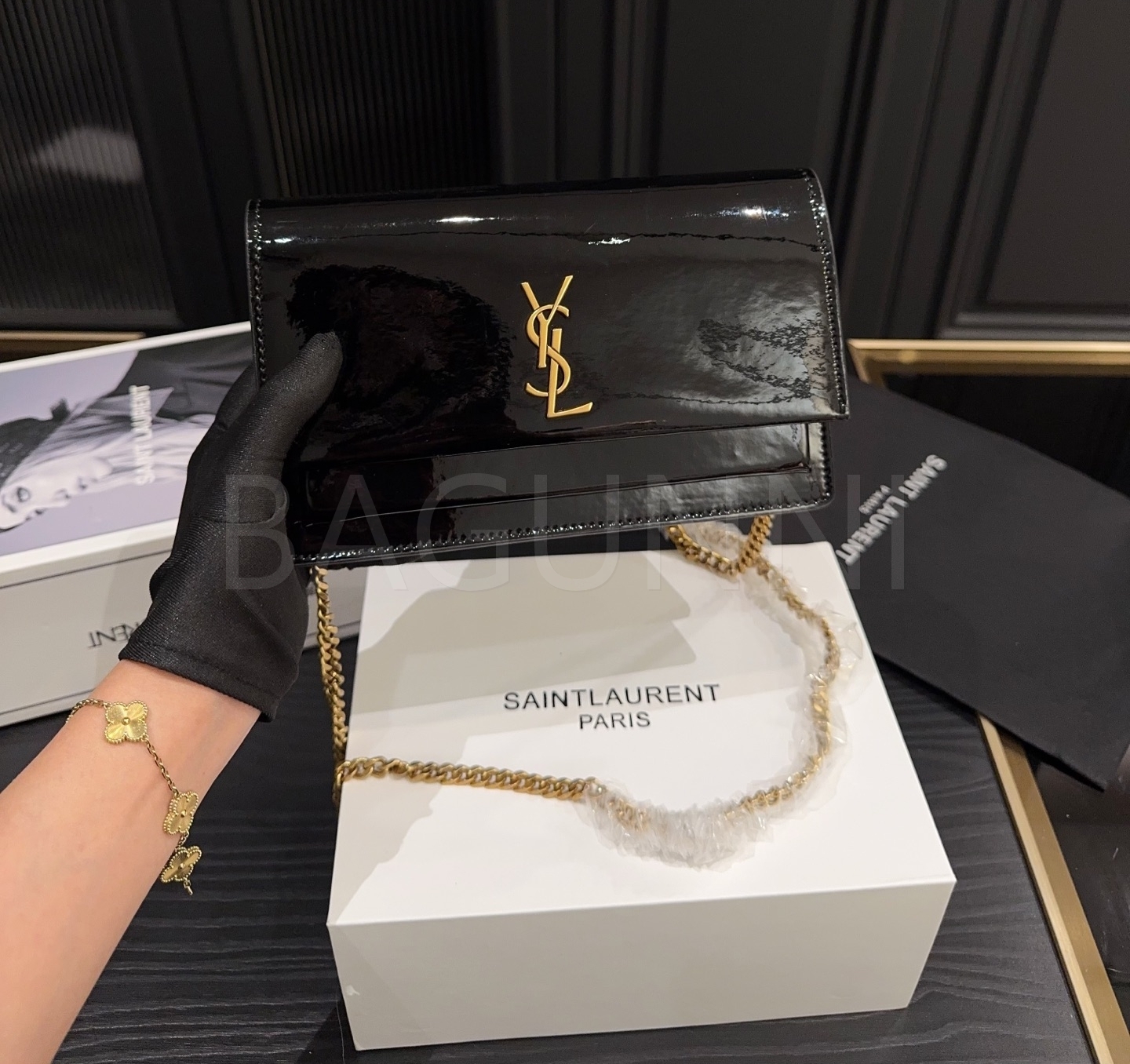 YSL 선셋 숄더백입니다. 페이턴트 가죽 특유의 질감이 자연스럽게 살아 있으며 브랜드 특유의 분위기를 편하게 즐기기 좋습니다.