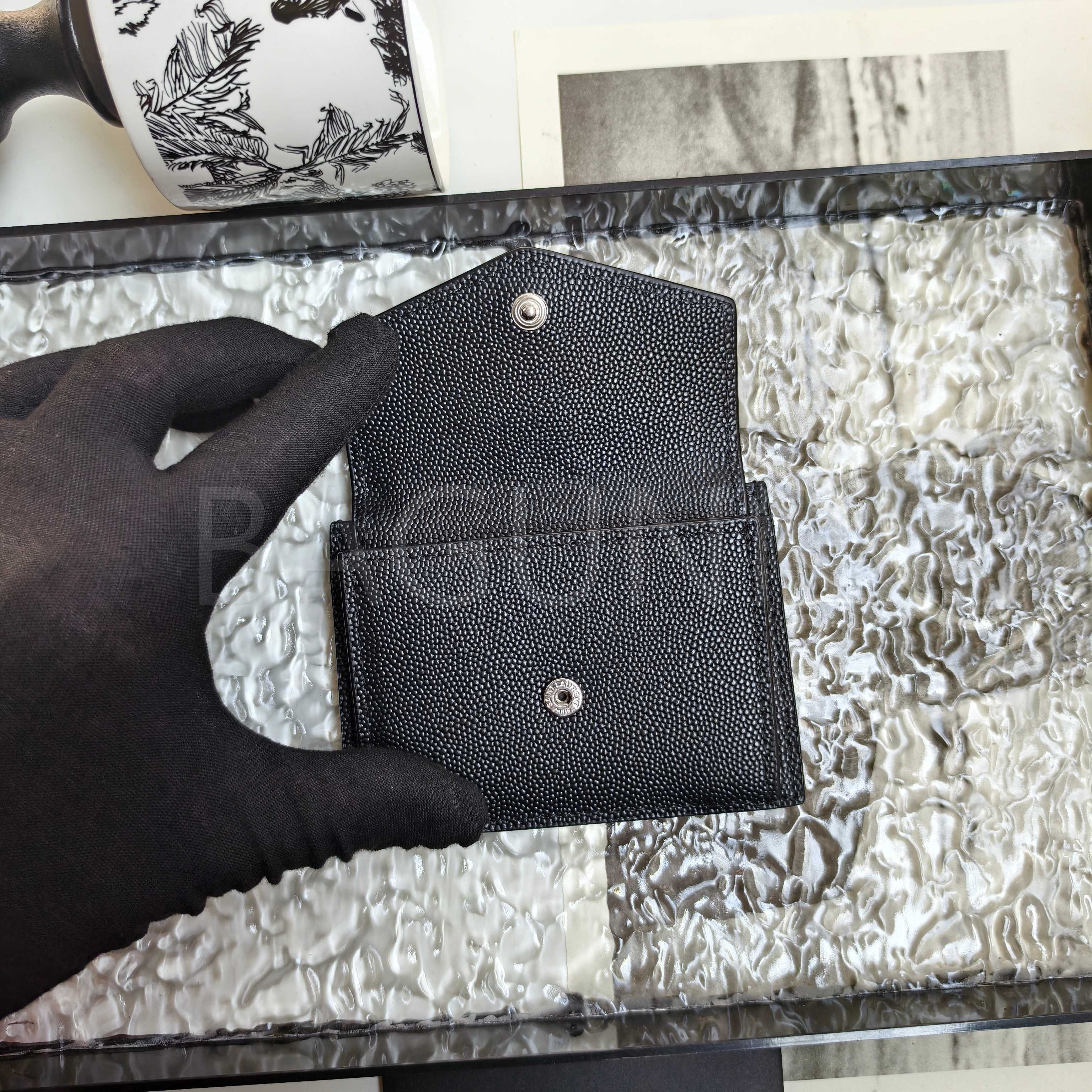 YSL 카산드라 플랩 카드지갑 특유의 분위기가 자연스럽게 드러나는 디자인입니다.