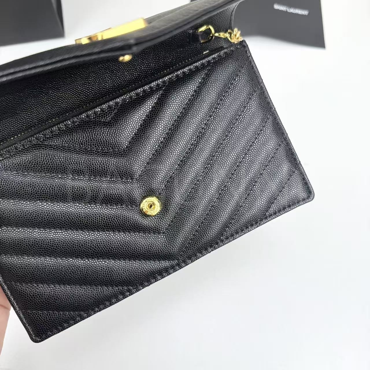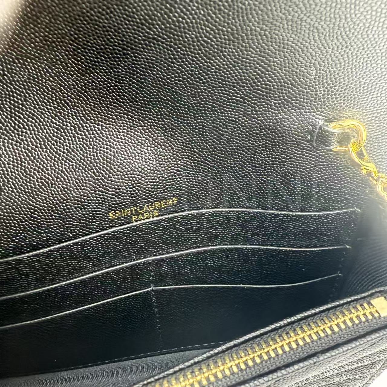 카프스킨의 질감이 돋보이는 YSL 모노그램 체인 지갑입니다.
