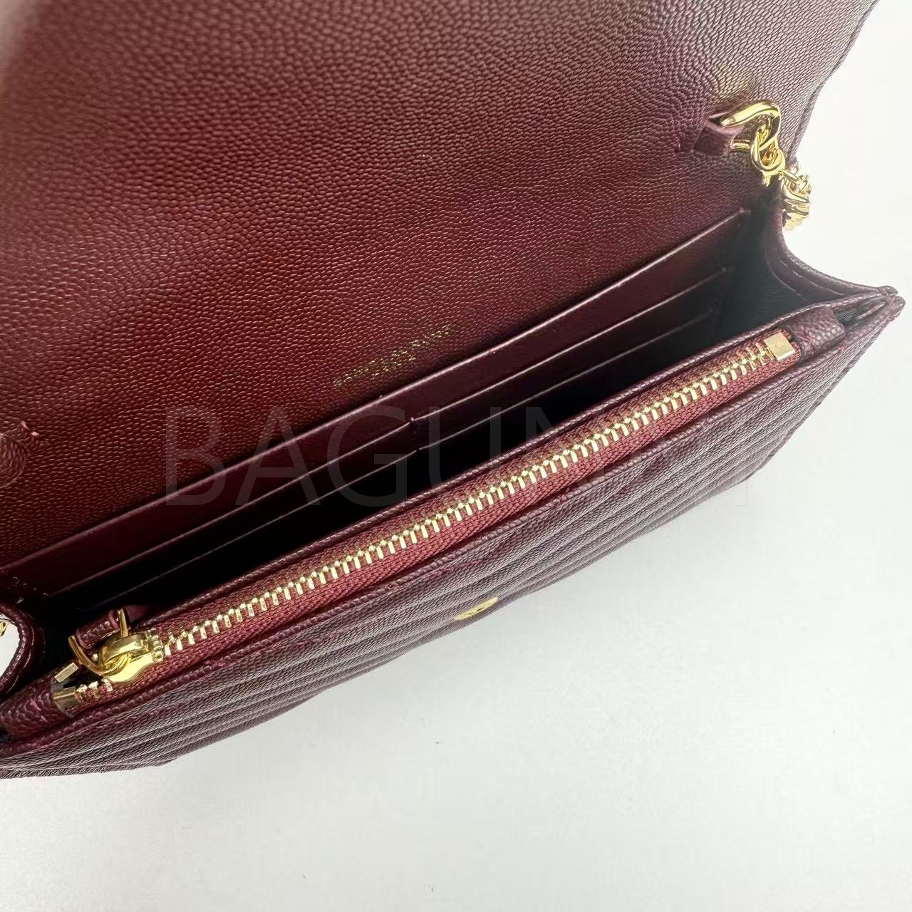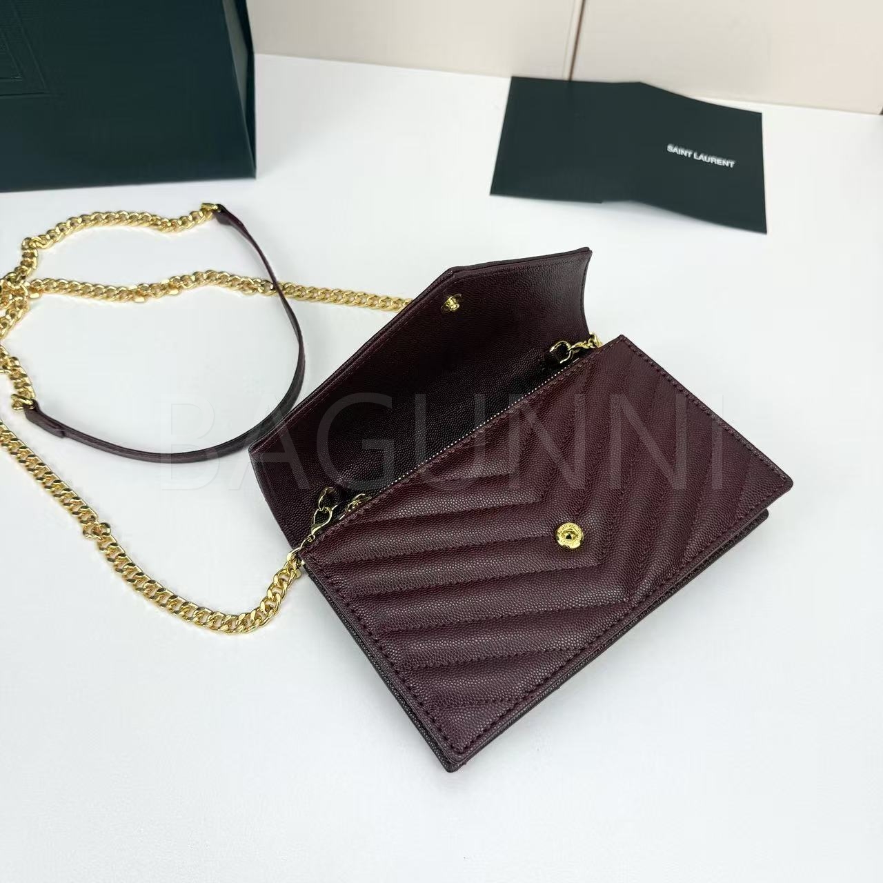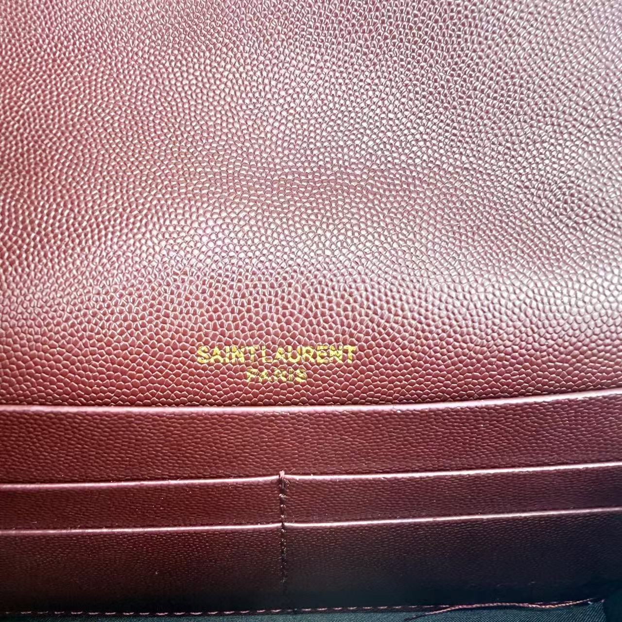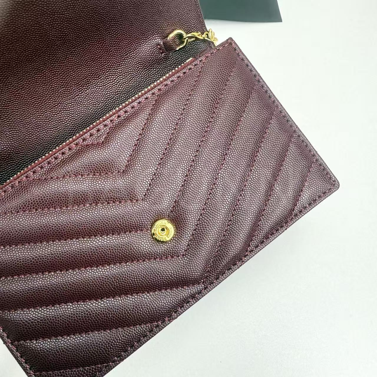 카프스킨의 질감이 돋보이는 YSL 모노그램 체인 지갑입니다.