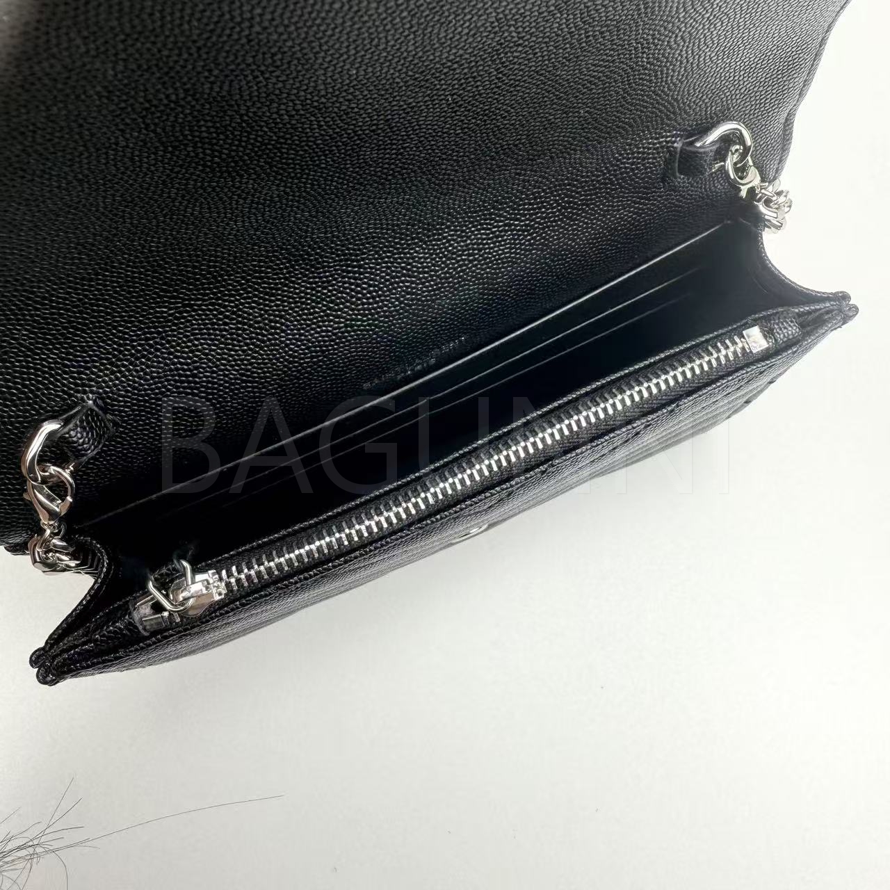카프스킨의 질감이 돋보이는 YSL 모노그램 체인 지갑입니다.