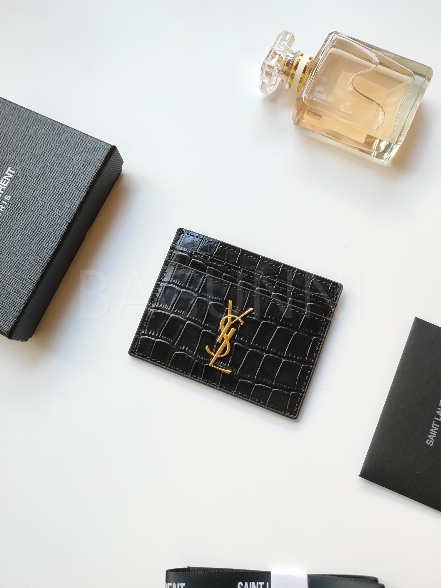 카프스킨의 질감이 돋보이는 YSL 플랩 카드지갑입니다.