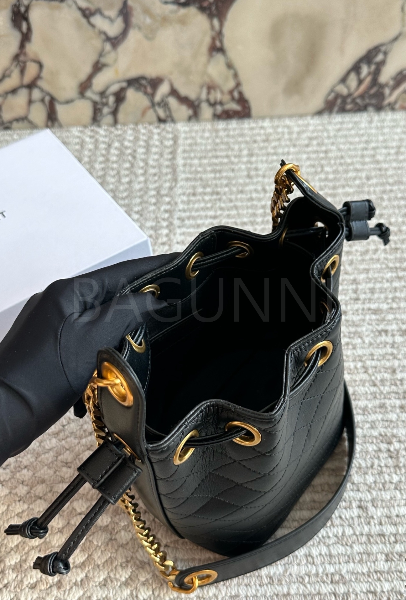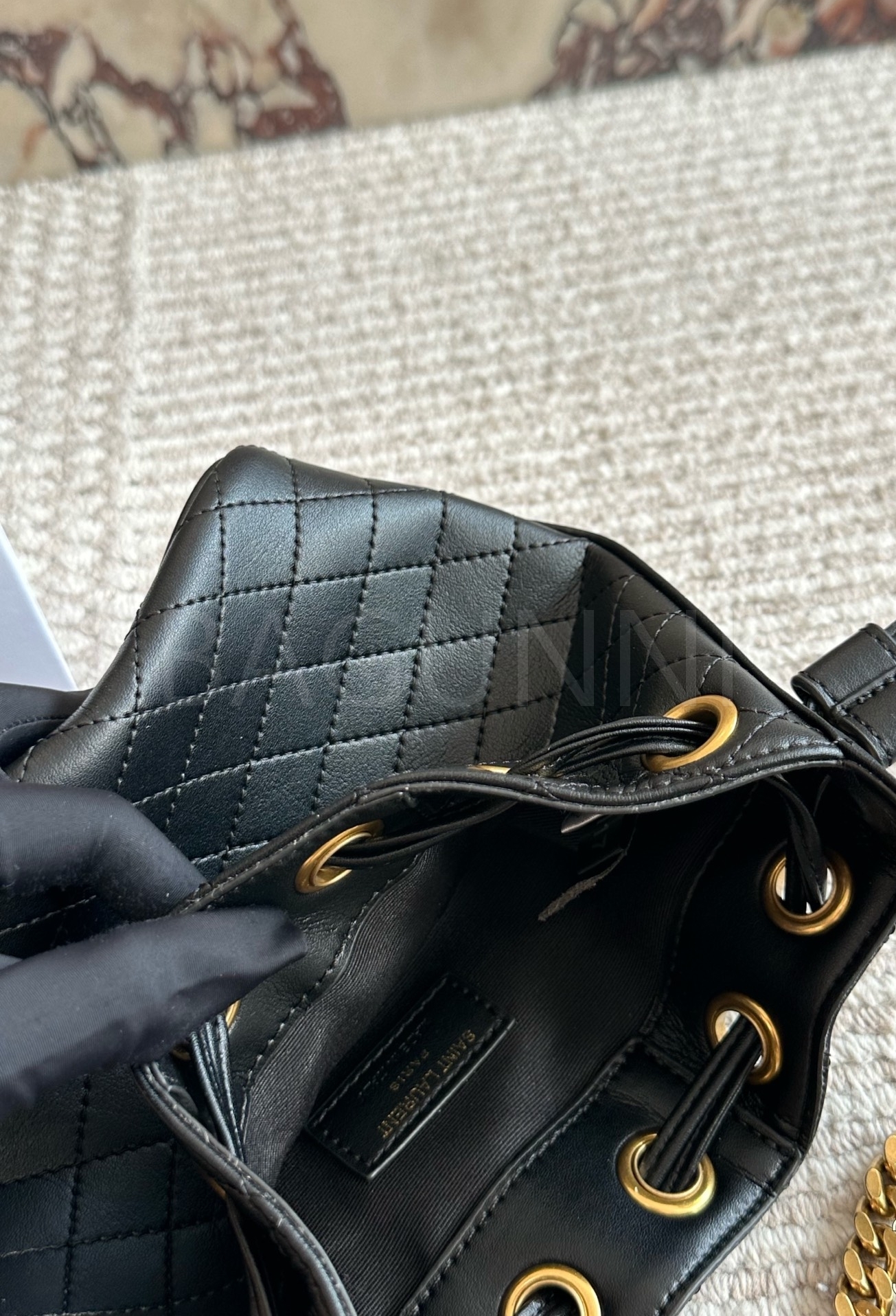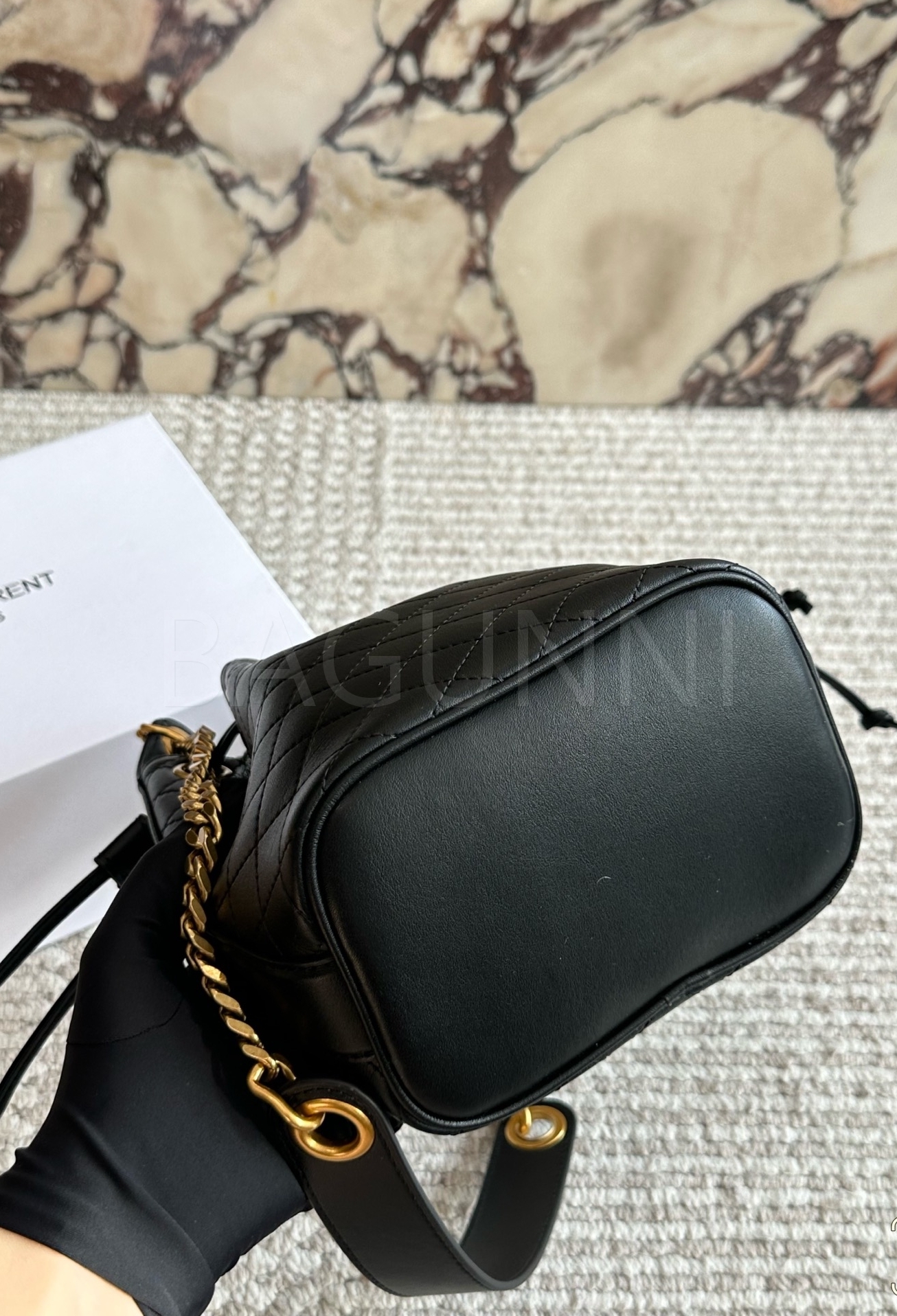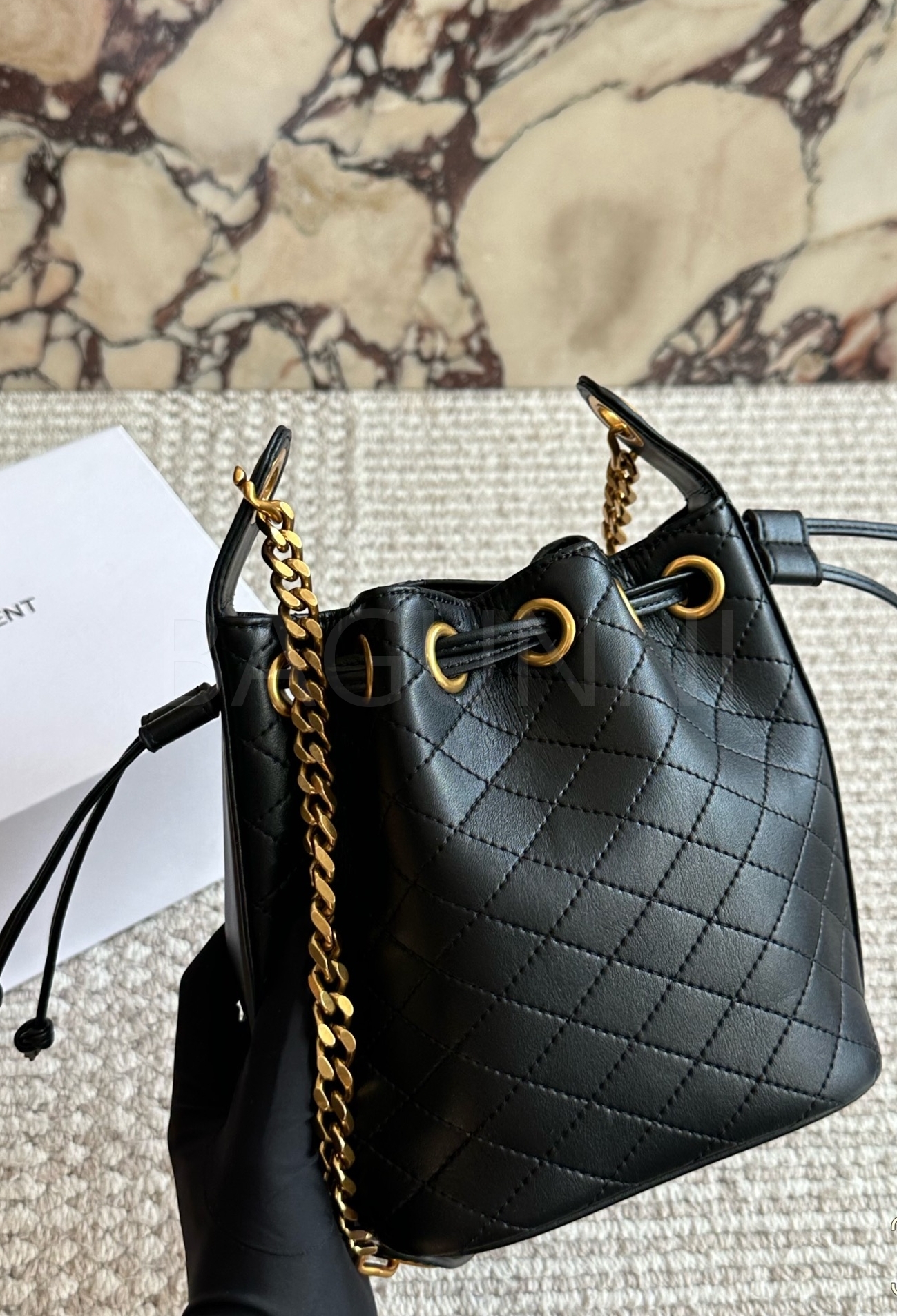 YSL 로고 버킷백입니다. 가죽 특유의 질감이 자연스럽게 살아 있으며 블랙 톤이 어우러져 브랜드 특유의 분위기를 편하게 즐기기 좋습니다.