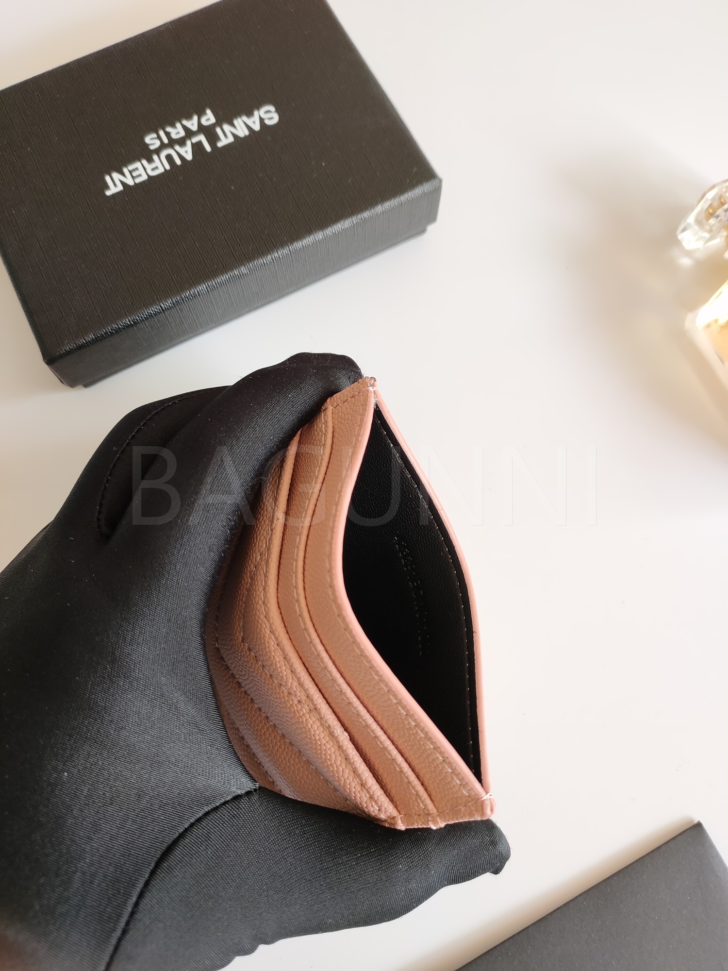 카프스킨의 질감이 돋보이는 YSL 플랩 카드지갑입니다.